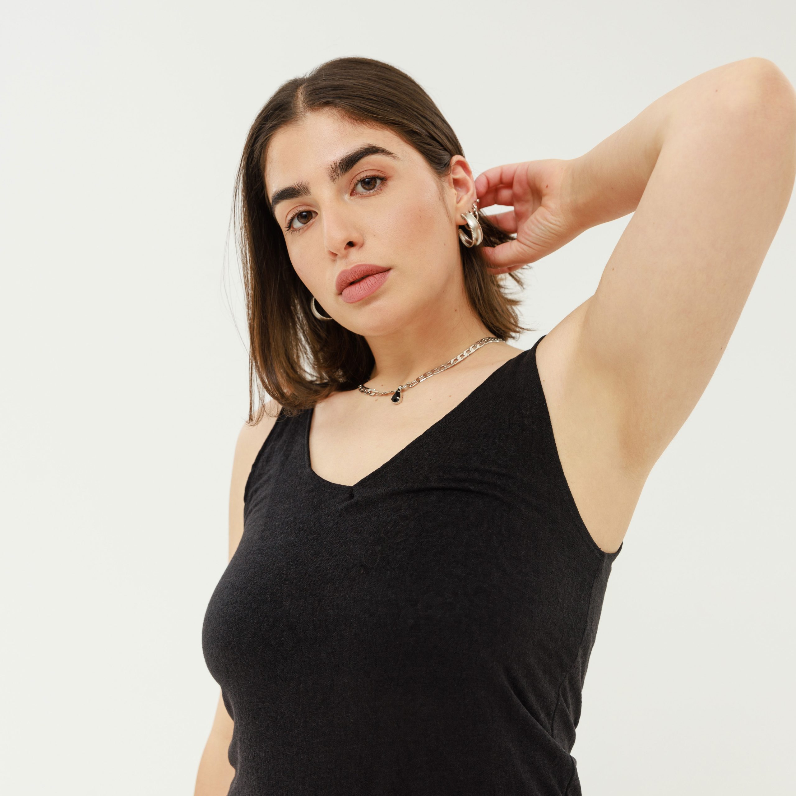 גופייה חתיכית ונינוחה עם צווארון נשפך מקולקציית “פעימה שניה”.