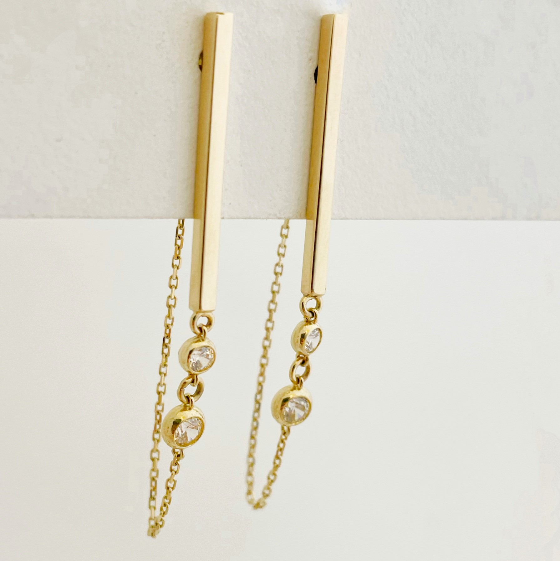 עגילים בעיצוב של פס צמוד אליו מחוברים שני בתי אבן משובצים אבני קריסטל משגעות מחוברים לשרשרת עדינה שנסגרת עם סוגר פרפר מאחור.