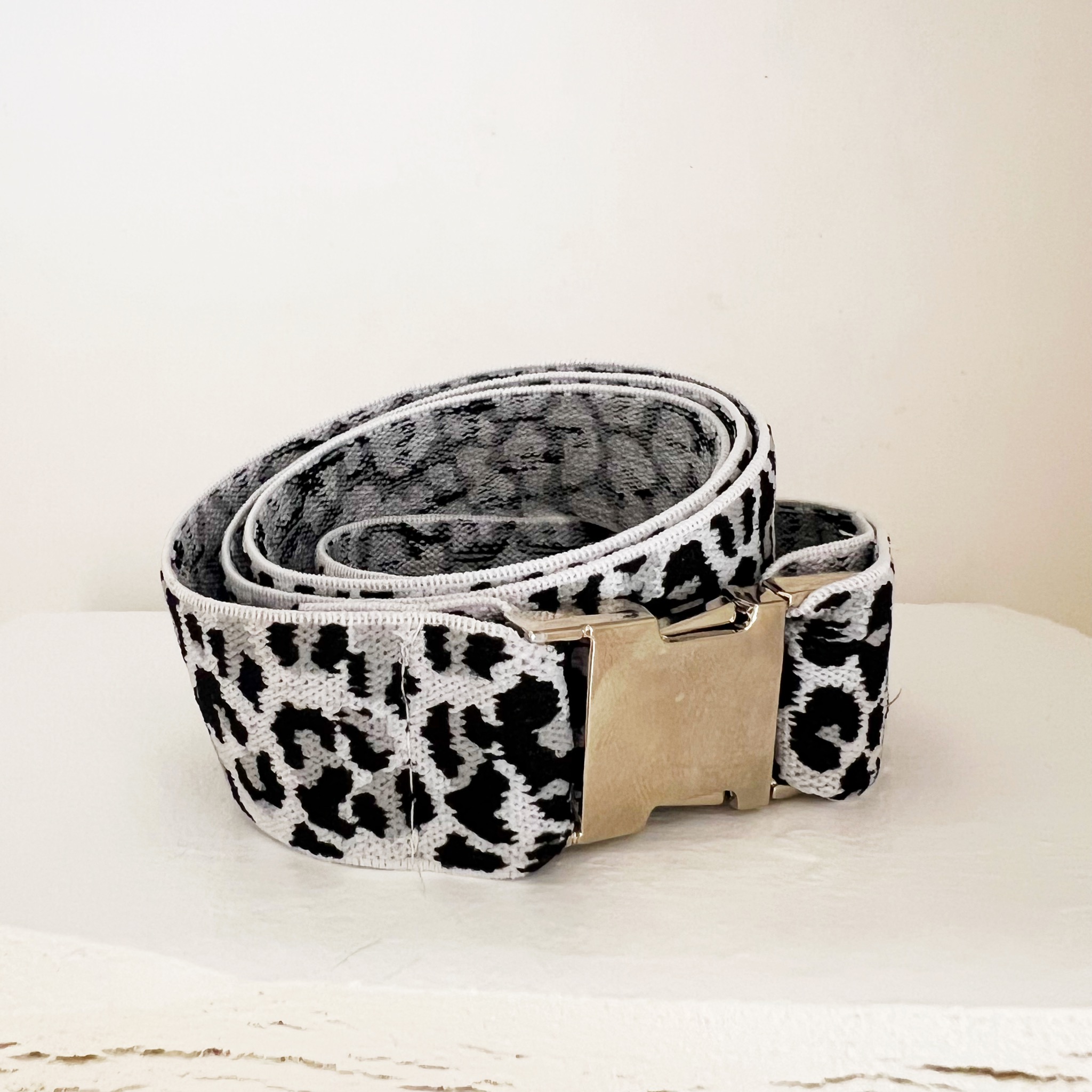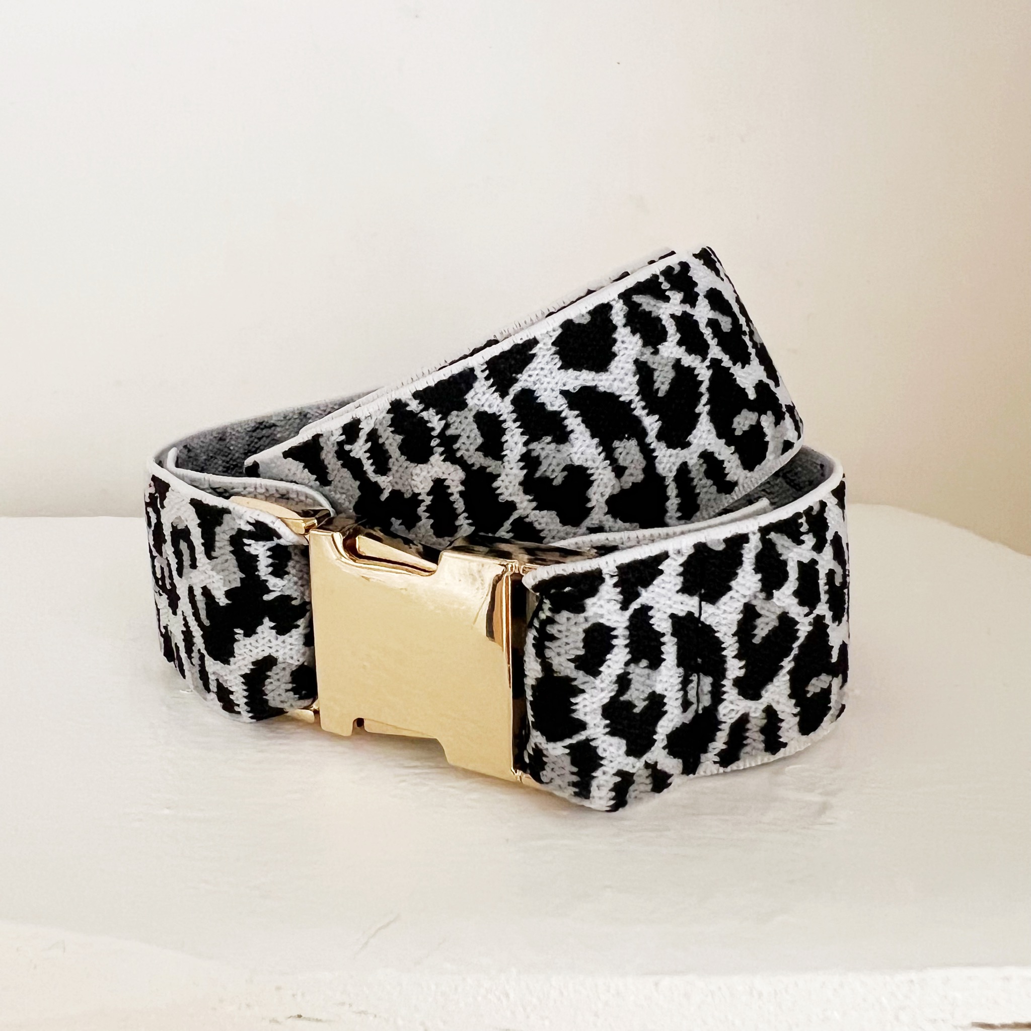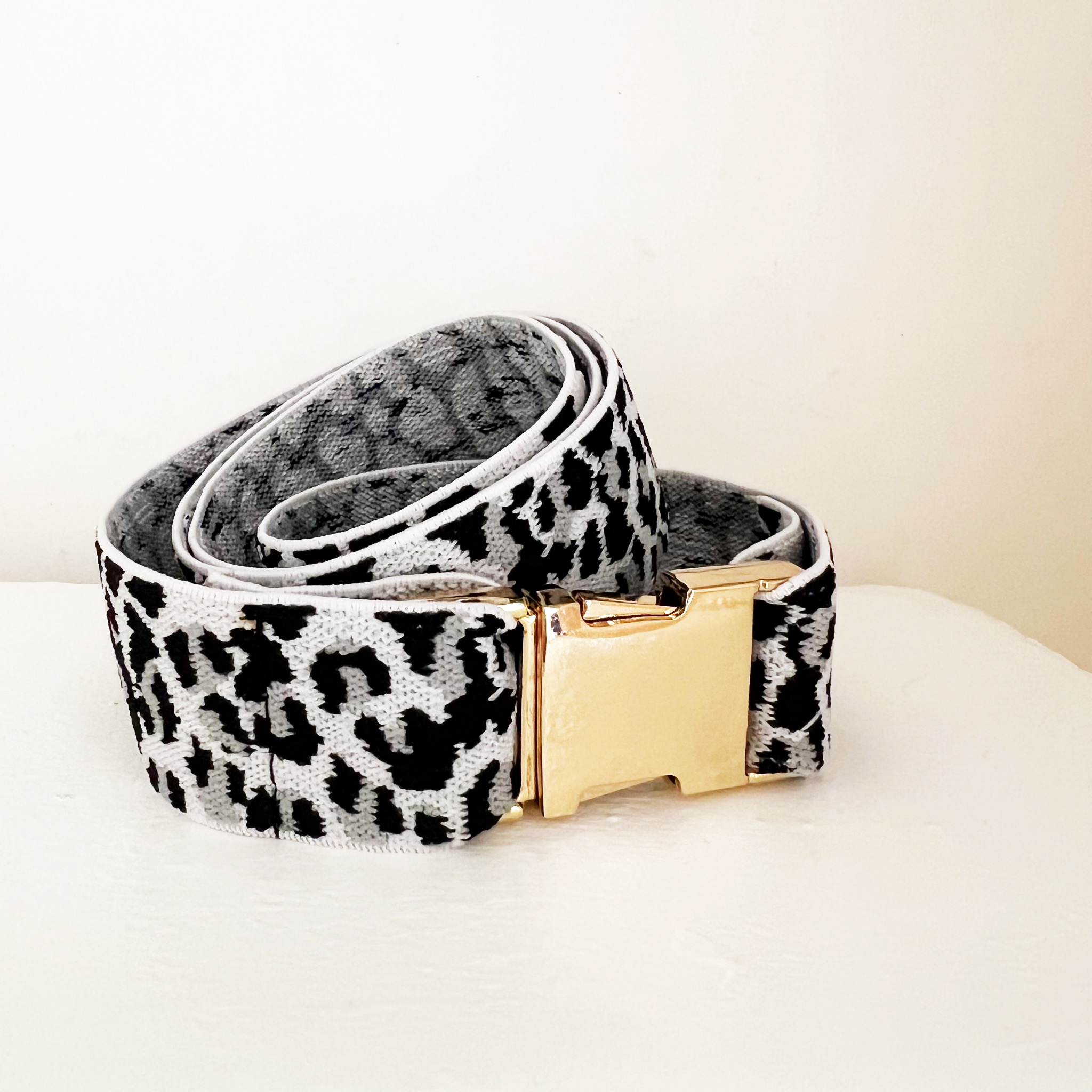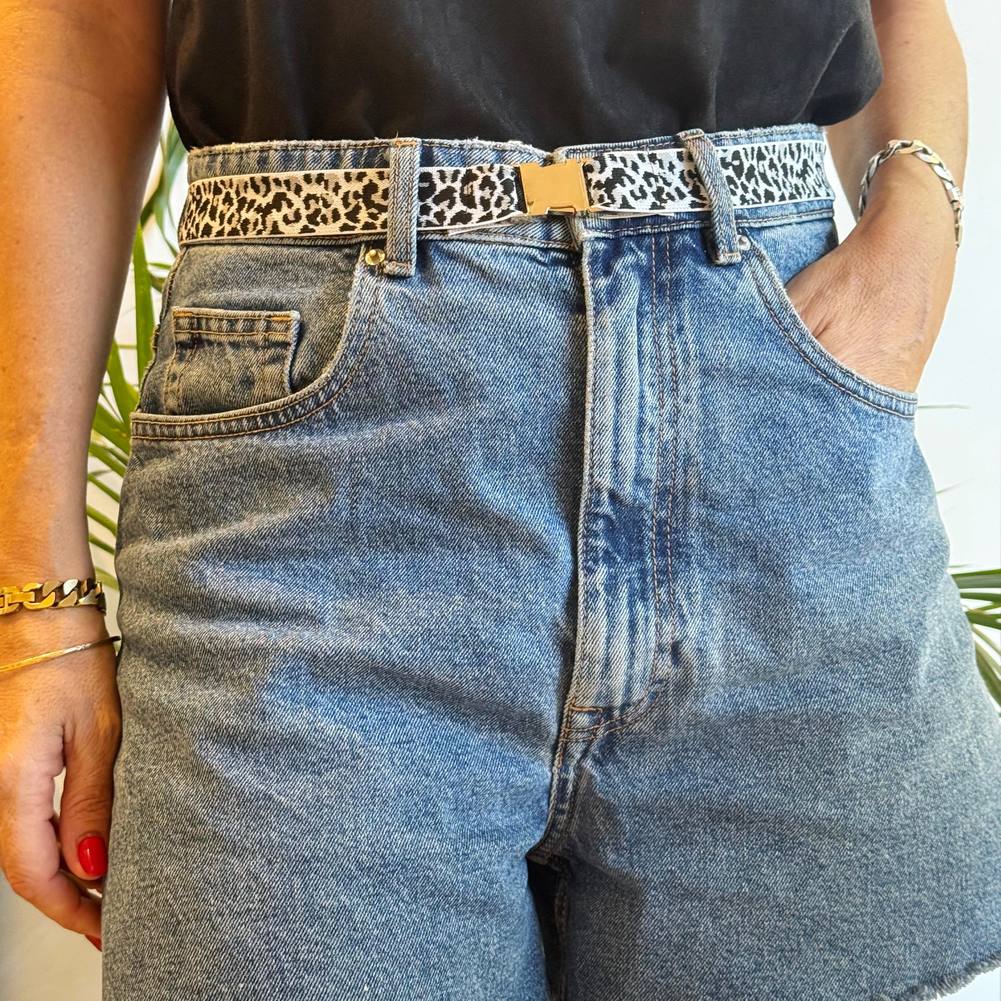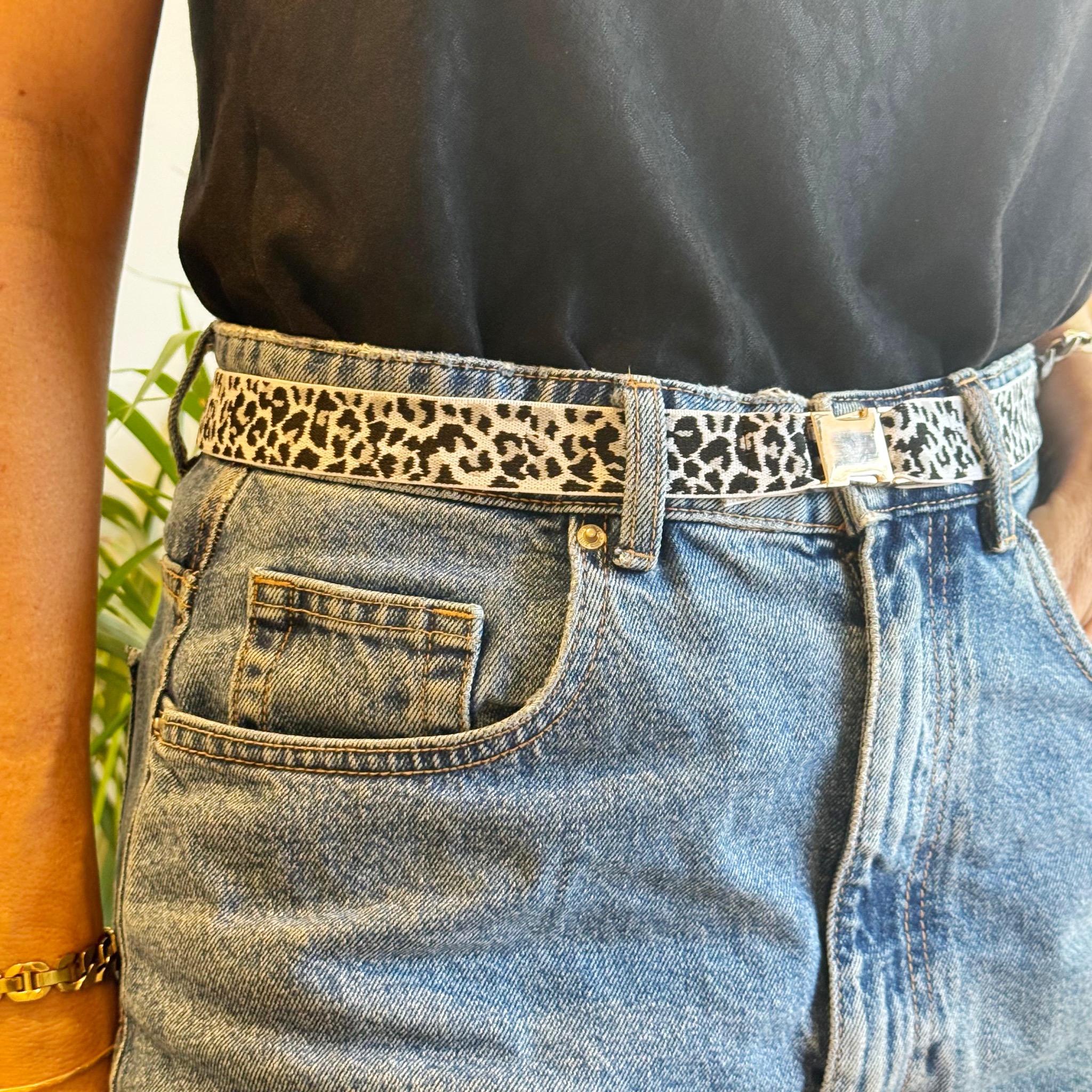 חגורה צרה עשויה גומי איכותי עם הדפס מנומר משגע מגיעה עם אבזם זהב או כסף.