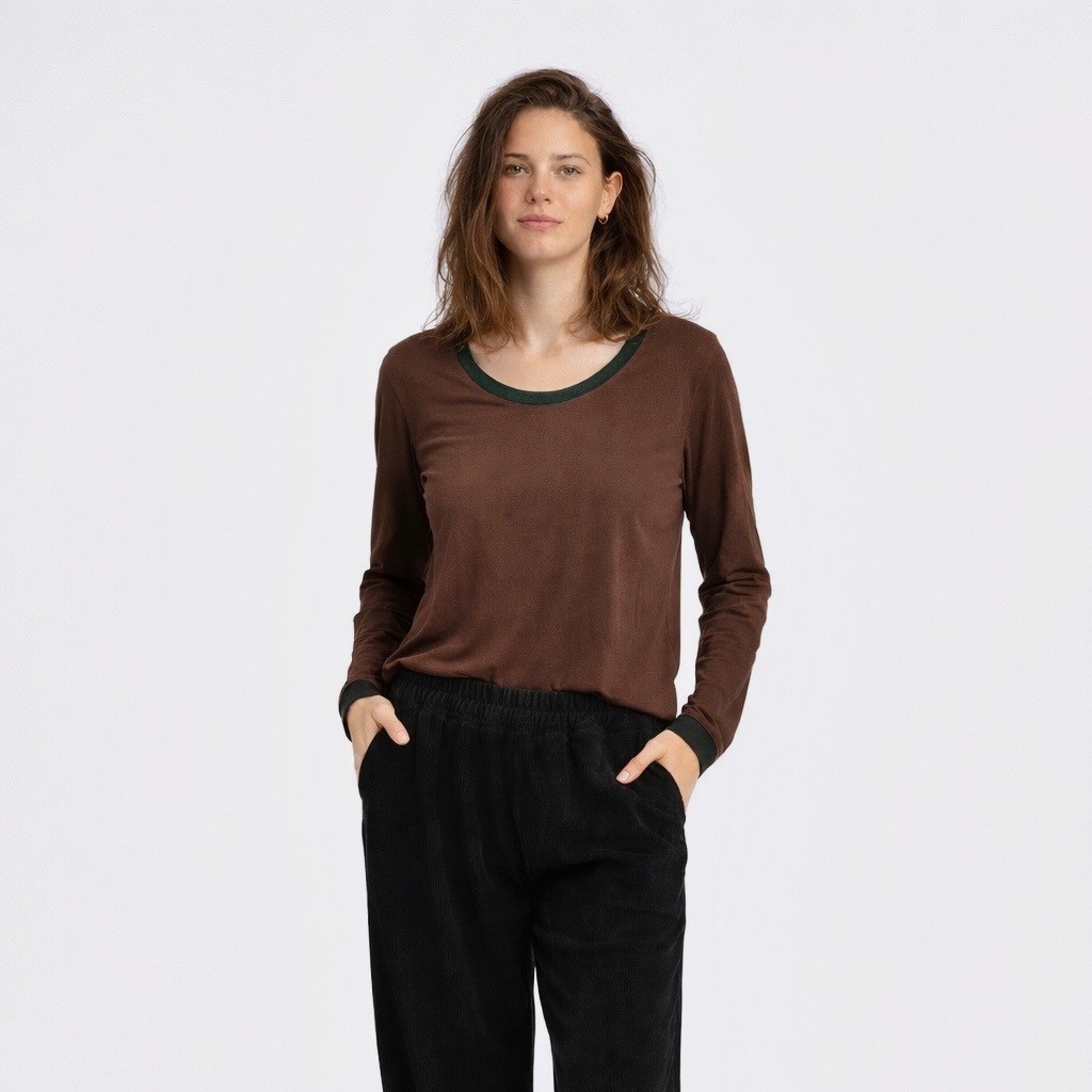 לחולצה סיומות קונטרסטיות – בצווארון, בחפתים ובמכפלת התחתונה – למראה שכבות מיוחד.