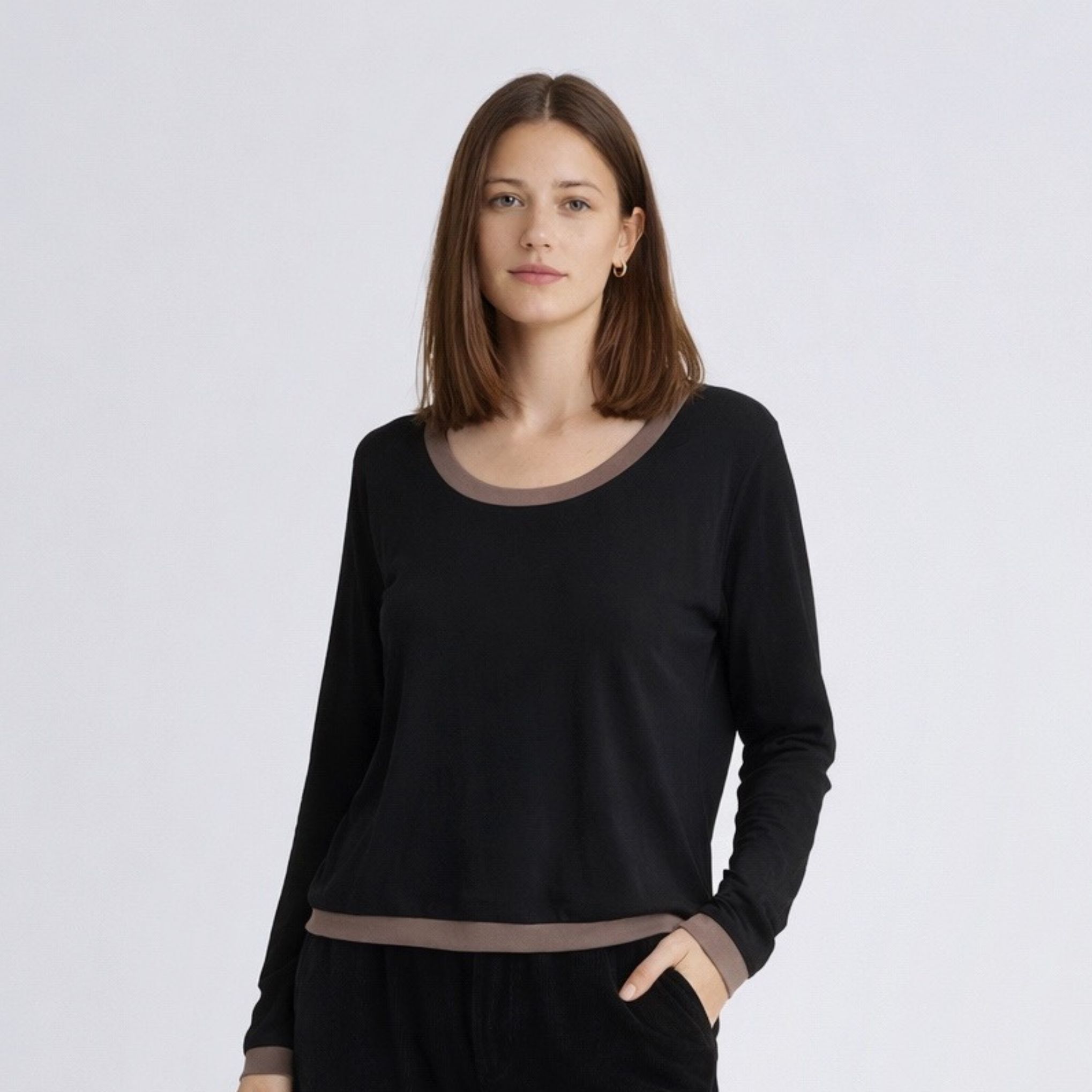 חולצה המשלבת נוחות יומיומית עם טאץ’ עיצובי נקי. גזרה ישרה ונוחה עם מחשוף עגול ורחב, המעניק מראה נשי ומוארך לצוואר.