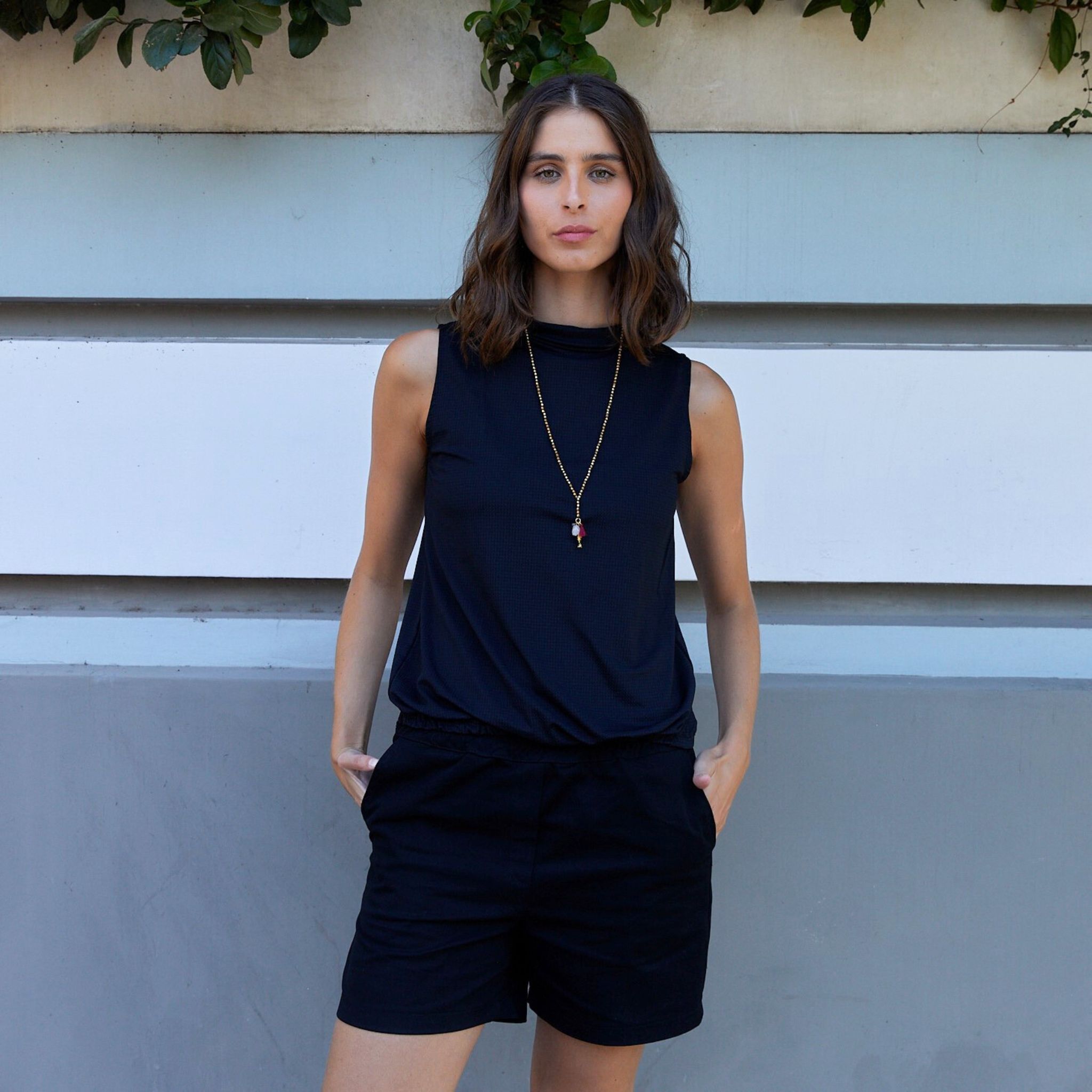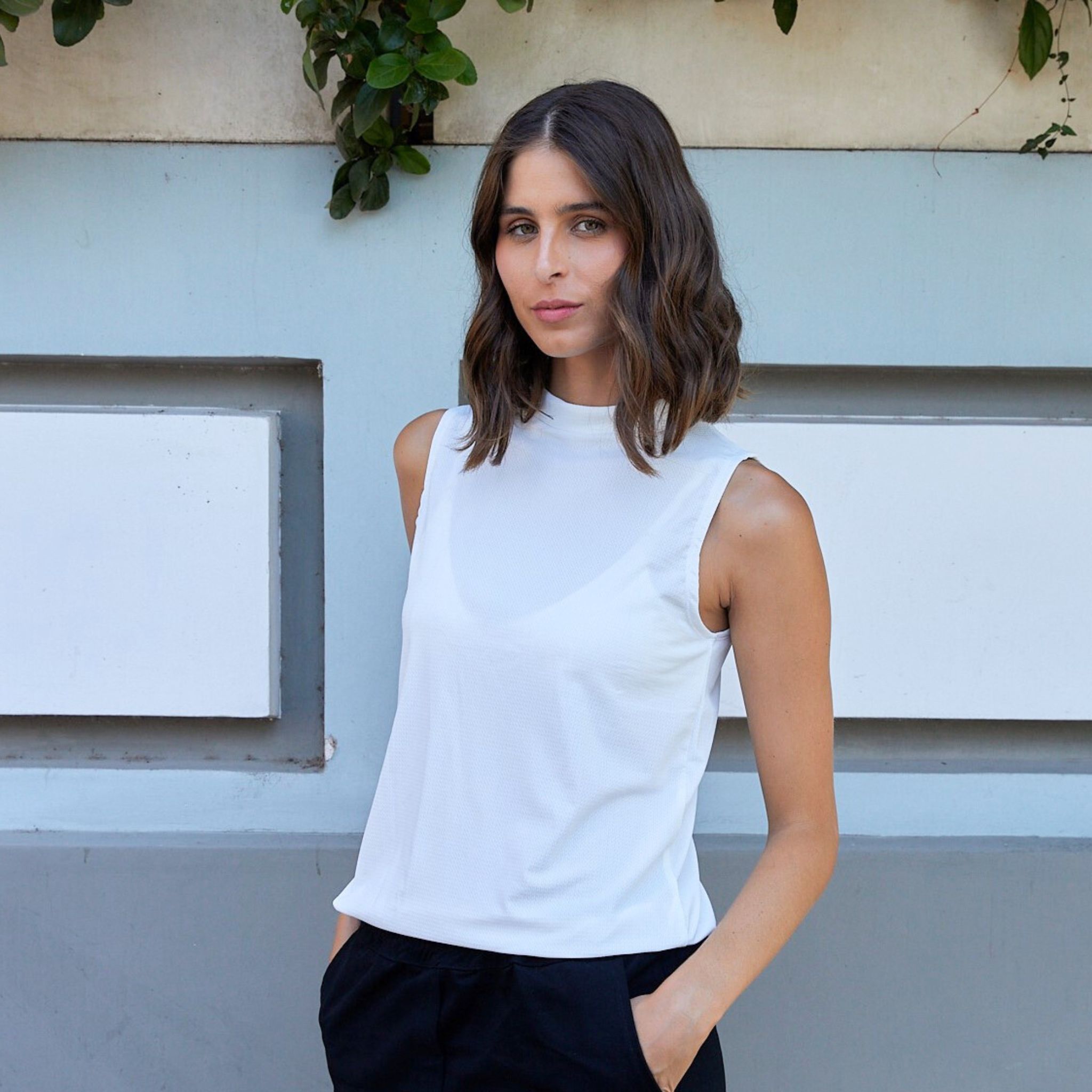 חולצה בגזרה קלאסית ומחמיאה עם צווארון חצי גולף לא צמוד וגומי בחלק התחתון.