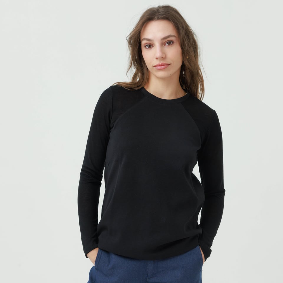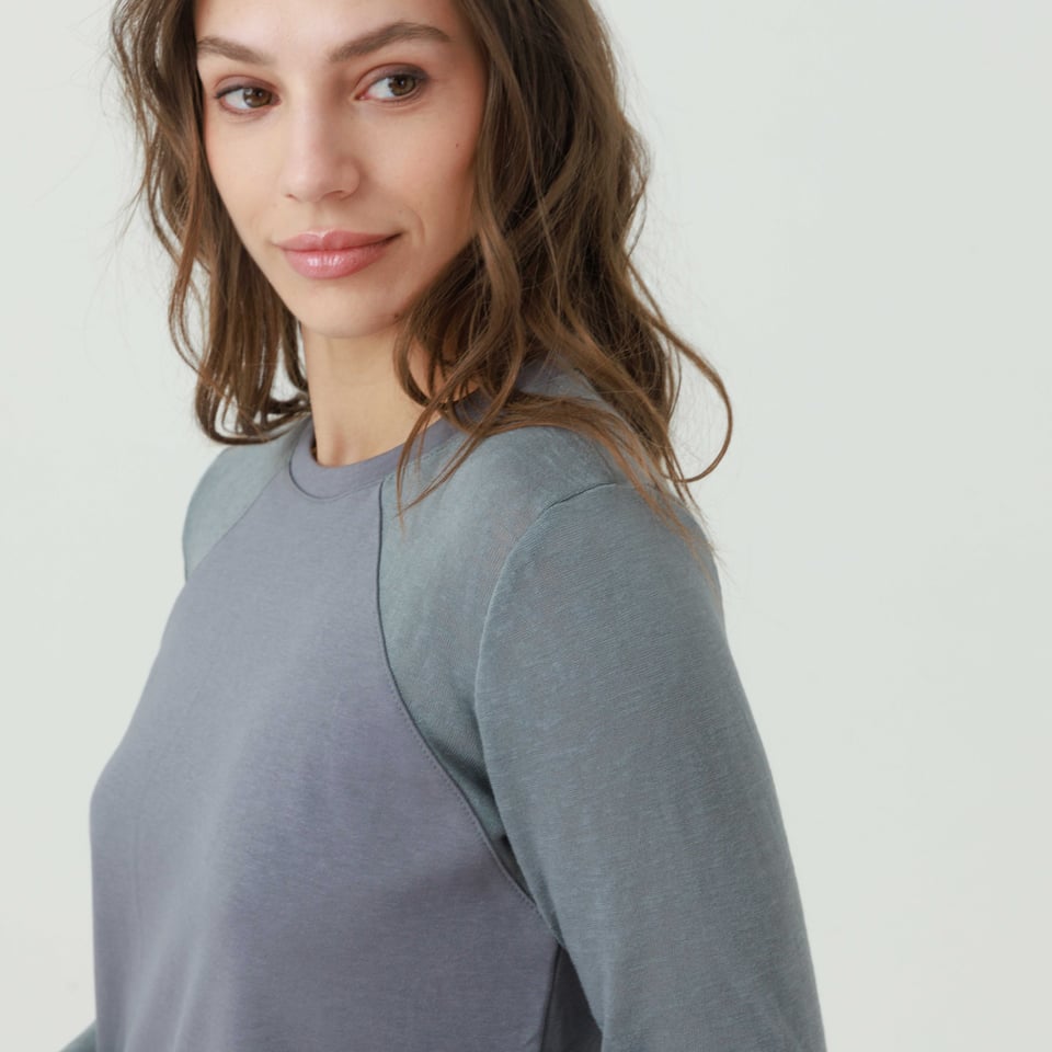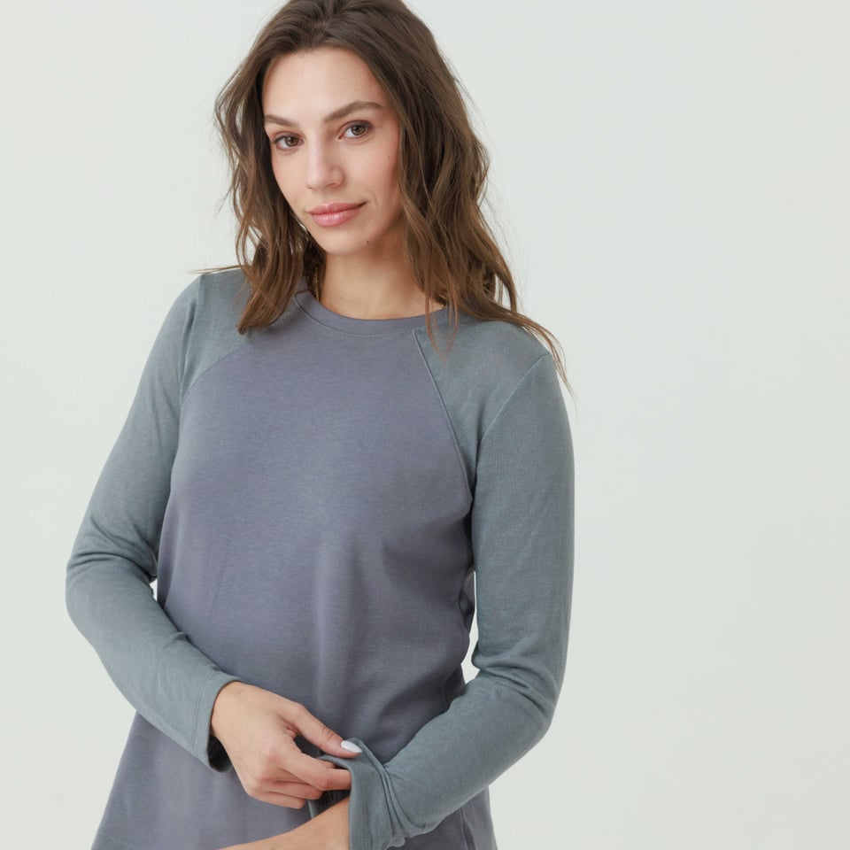 חולצה בגזרה קלאסית נינוחה ומחמיאה בגזרת רגלן בשילוב שני בדים באותו צבע.
