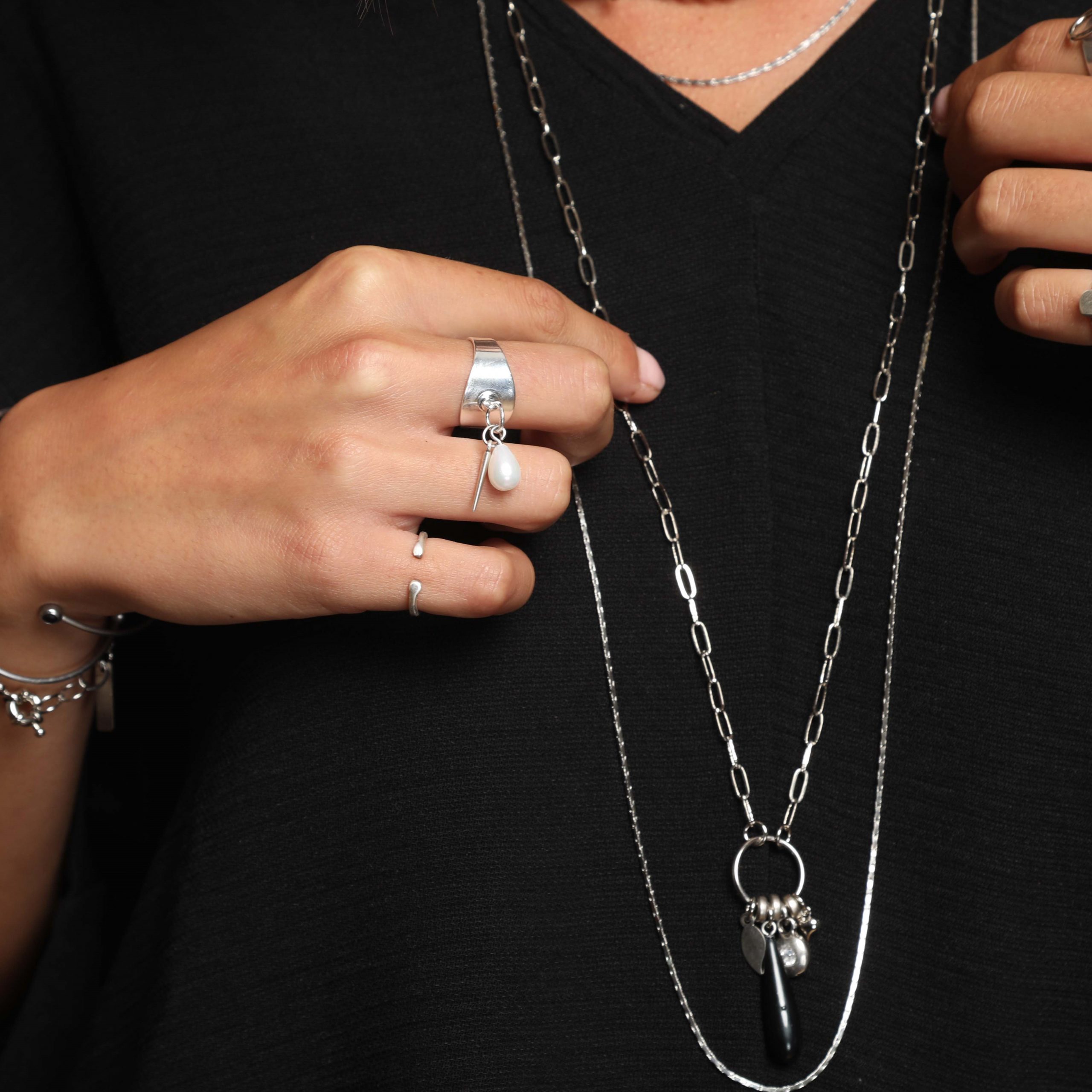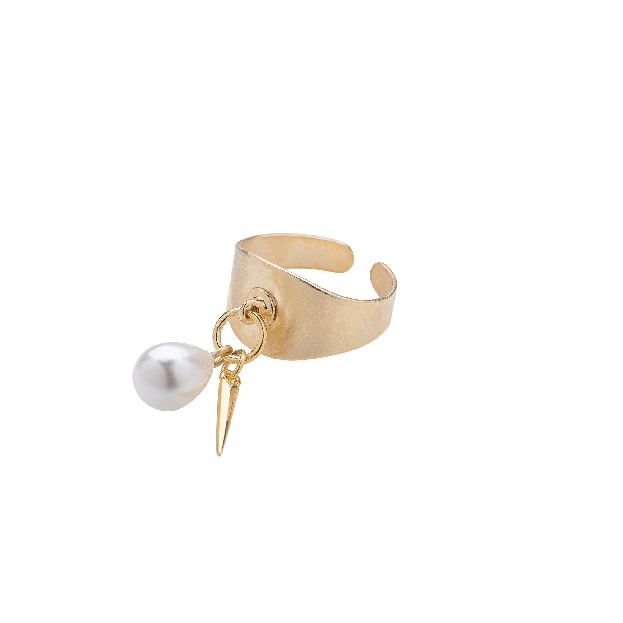 שני תליונים מיוחדים: פנינה לבנה אמיתית, ותליון שנהב עדין – מחוברים יחדיו עם לולאה לטבעת.