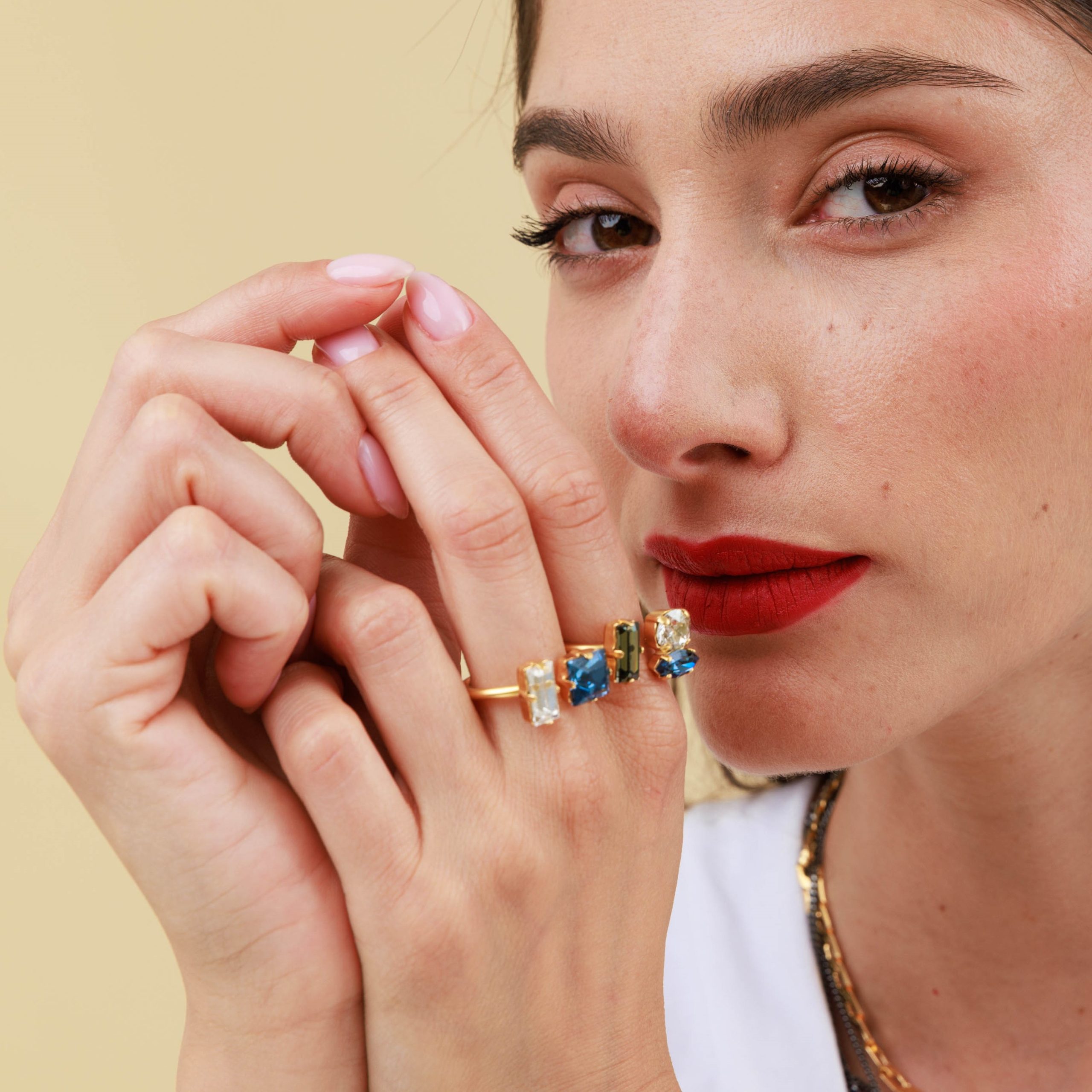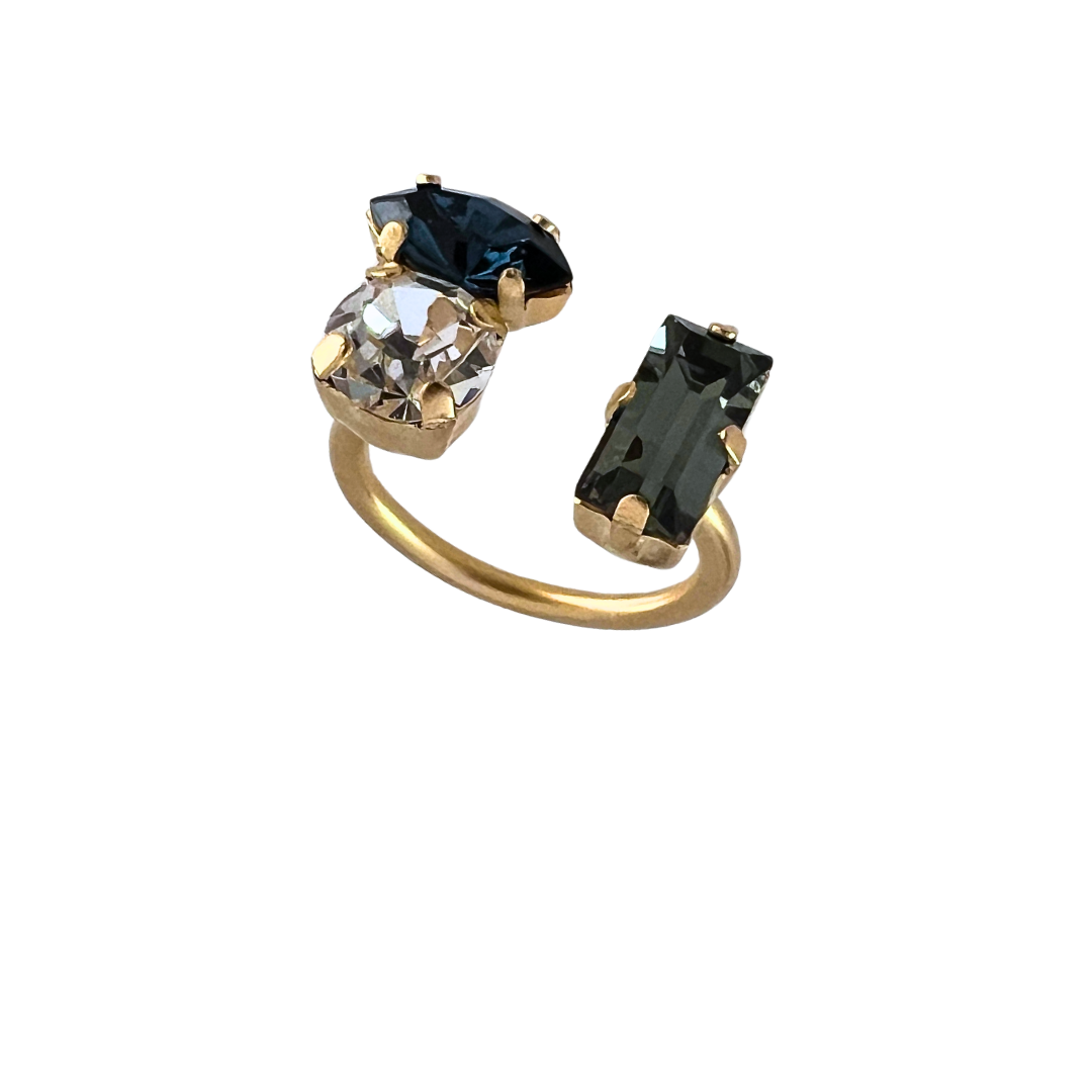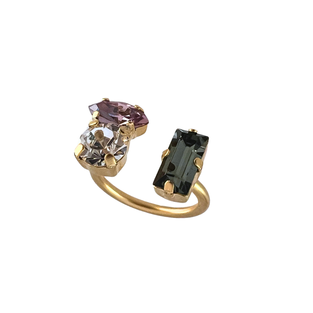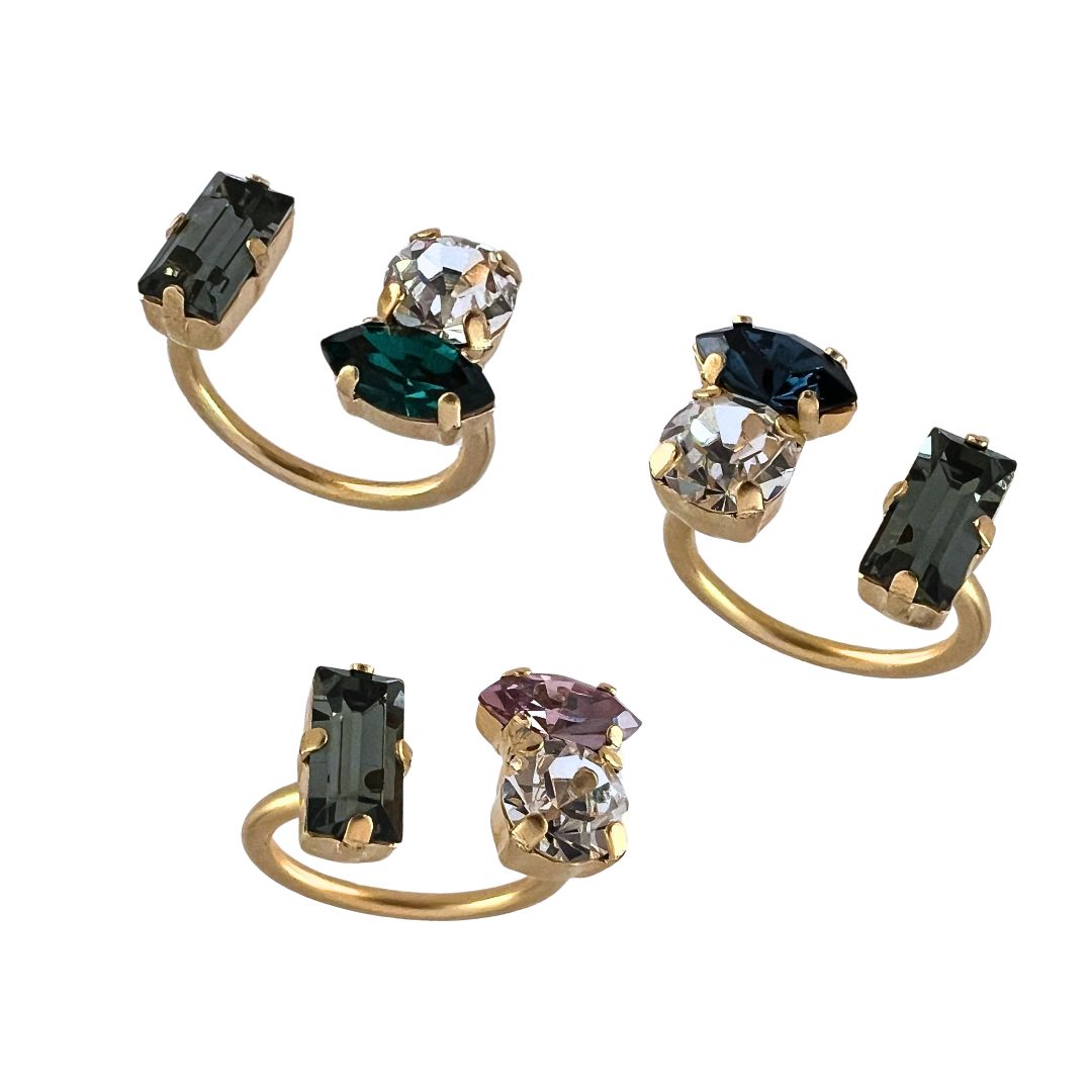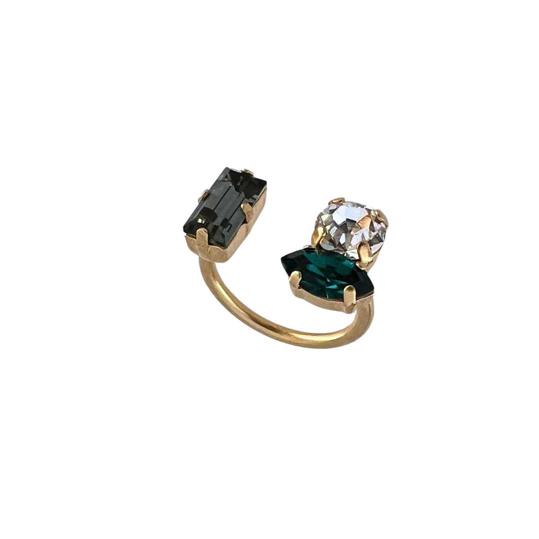 | טבעת משגעת מקולקציית “עלות השחר”. הטבעת עשויה מתכת בציפוי זהב 24 קראט משובצת שלוש אבני סברובסקי מדהימות אבו מלבנית אפורה, אבן מעוגלת קריסטל ואבן בצורת מרקיזה בשלושה צבעים לבחירה: ירוק,סגול או כחול. הטבעת פתוחה ומתאימה למגוון מידות , ניתן לכוון את המידה באופ עצמאי. מיוחדת ונוכחת. מגיעה באריזה מהודרת. |