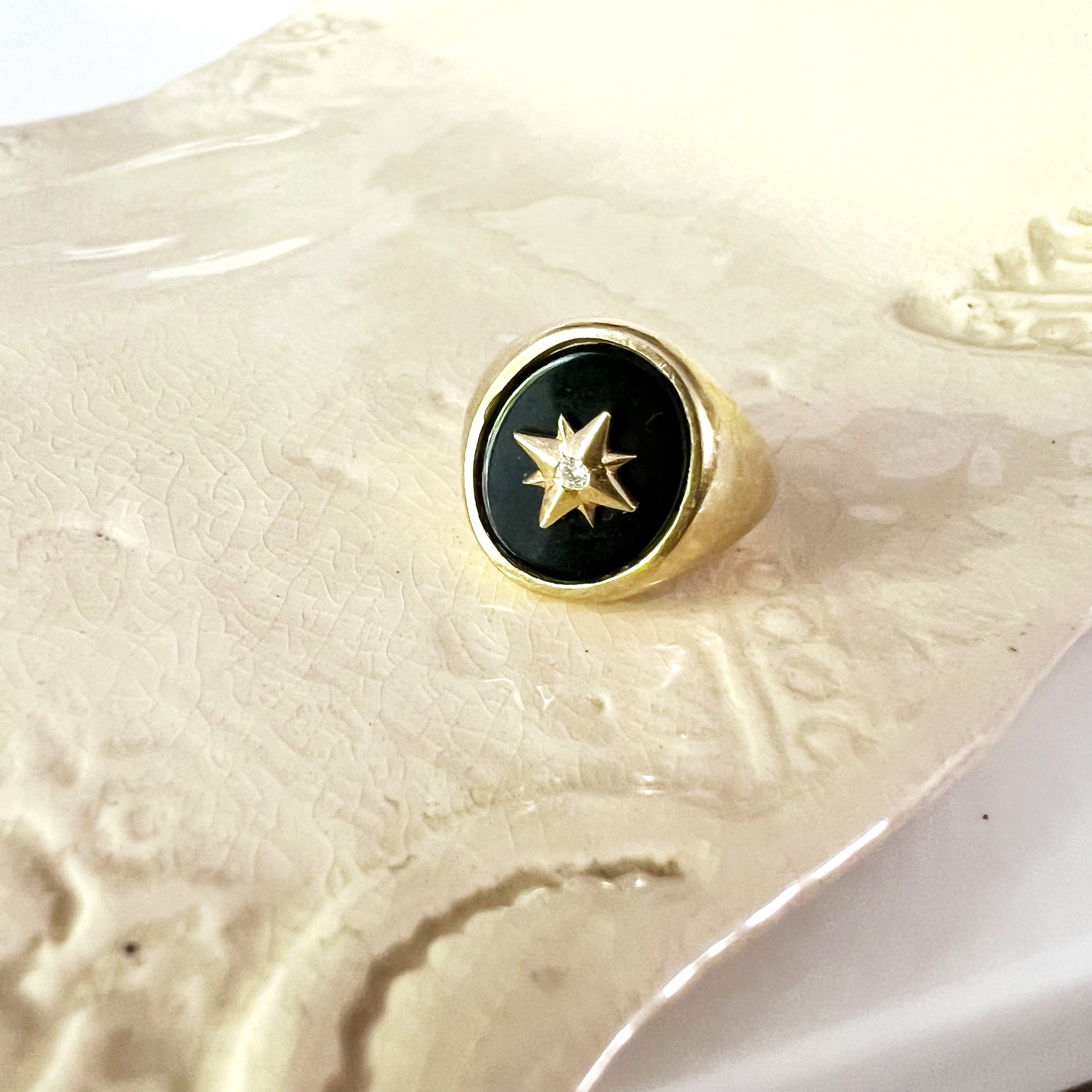 טבעת חותם לזרת מיוחדת עשויה זהב 14 קראט משולבת עם אבן אוניקס שחורה אליה מחובר כוכב עדין משובץ ביהלום קטן.