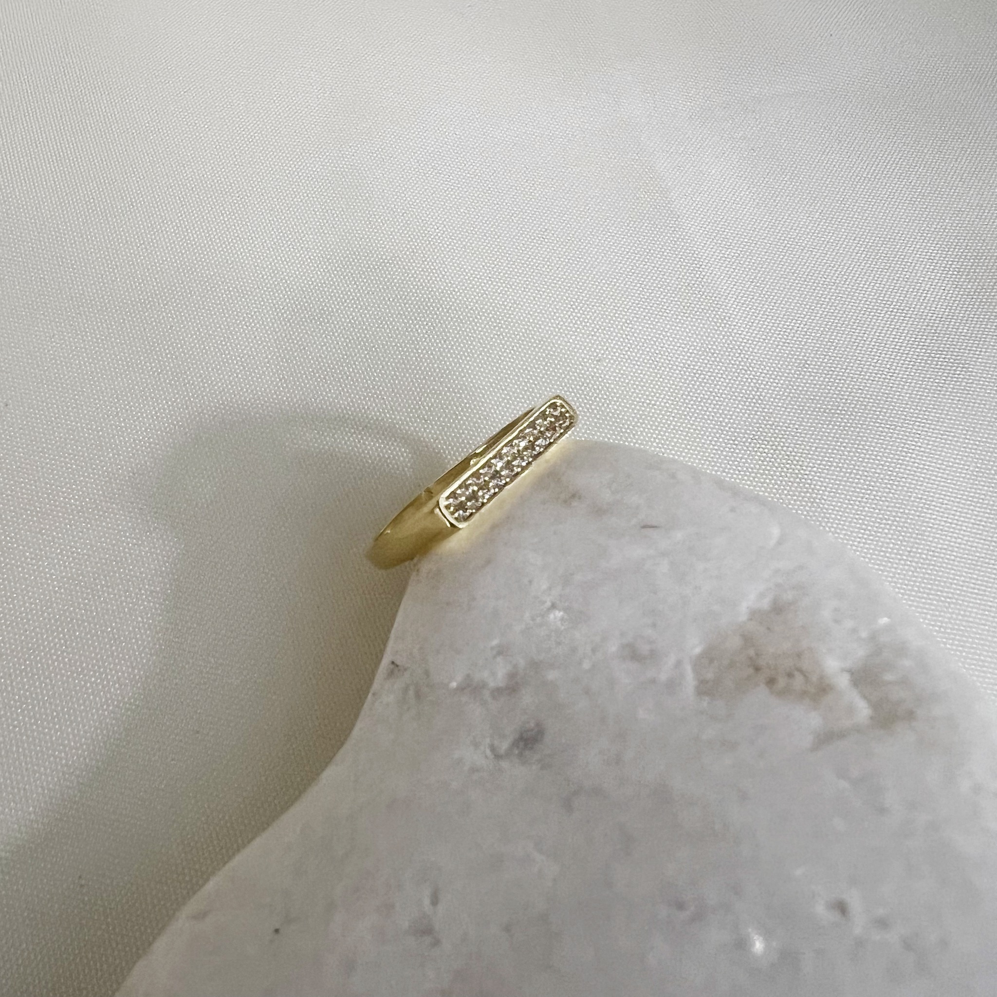 טבעת משגעת עשויה זהב 14 קראט משובצת שתי שורות של זירקוניה קריסטל מרהיבות.