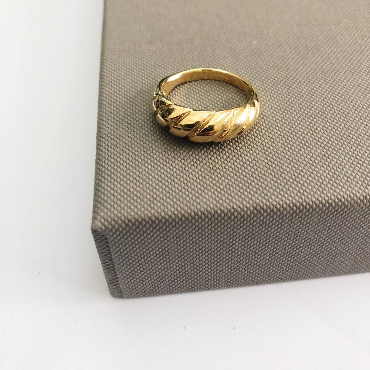 טבעת קלאסית עשויה וציפוי זהב 24 קראט בעובי 2 מיקרון עמיד ואיכותי עם טקסטורה של פסים אלכסונים עדינים.