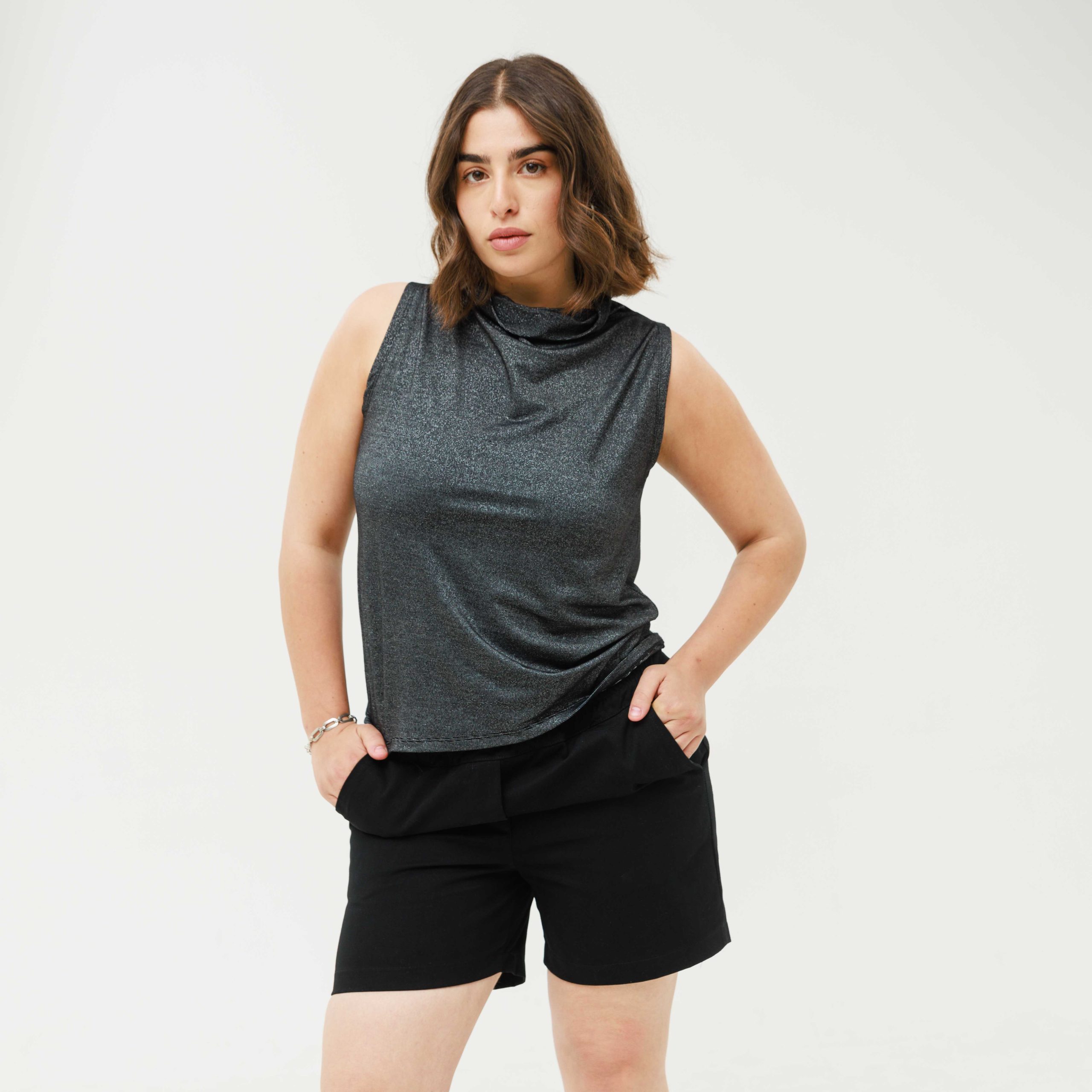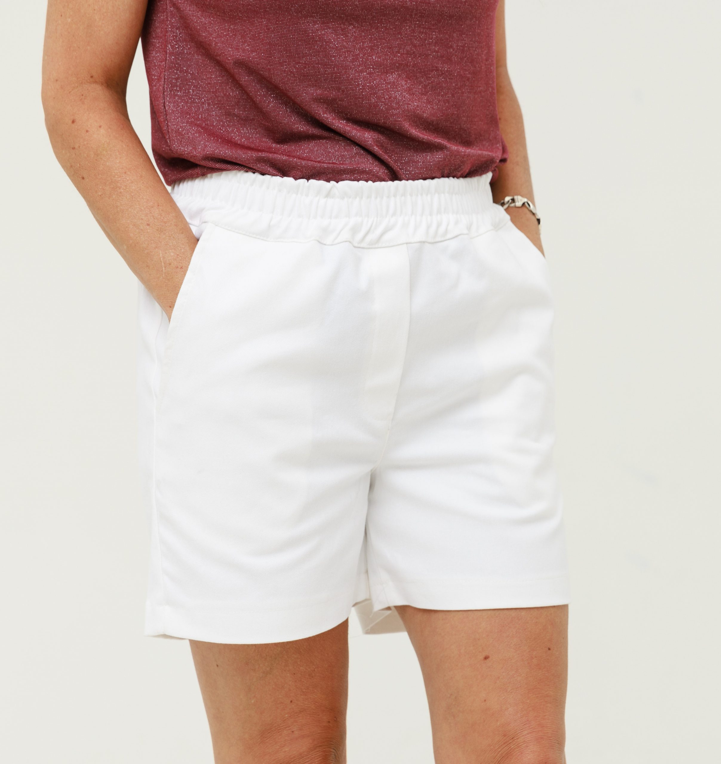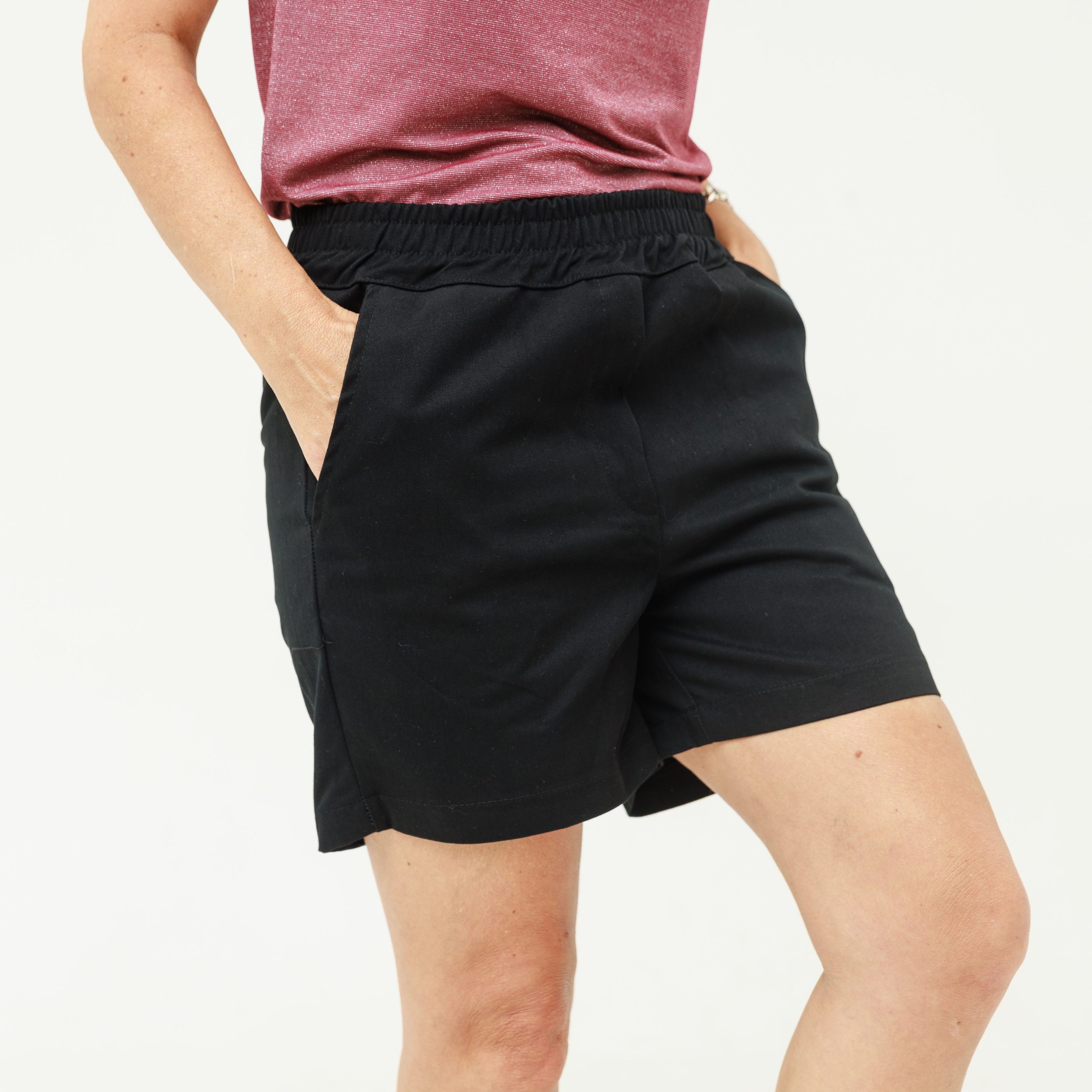 מכנסיים קצרים עם גומי במותן, בגזרה חצי גבוהה, באורך מדויק (לא קצרים מדי) ושני כיסים נדיבים.