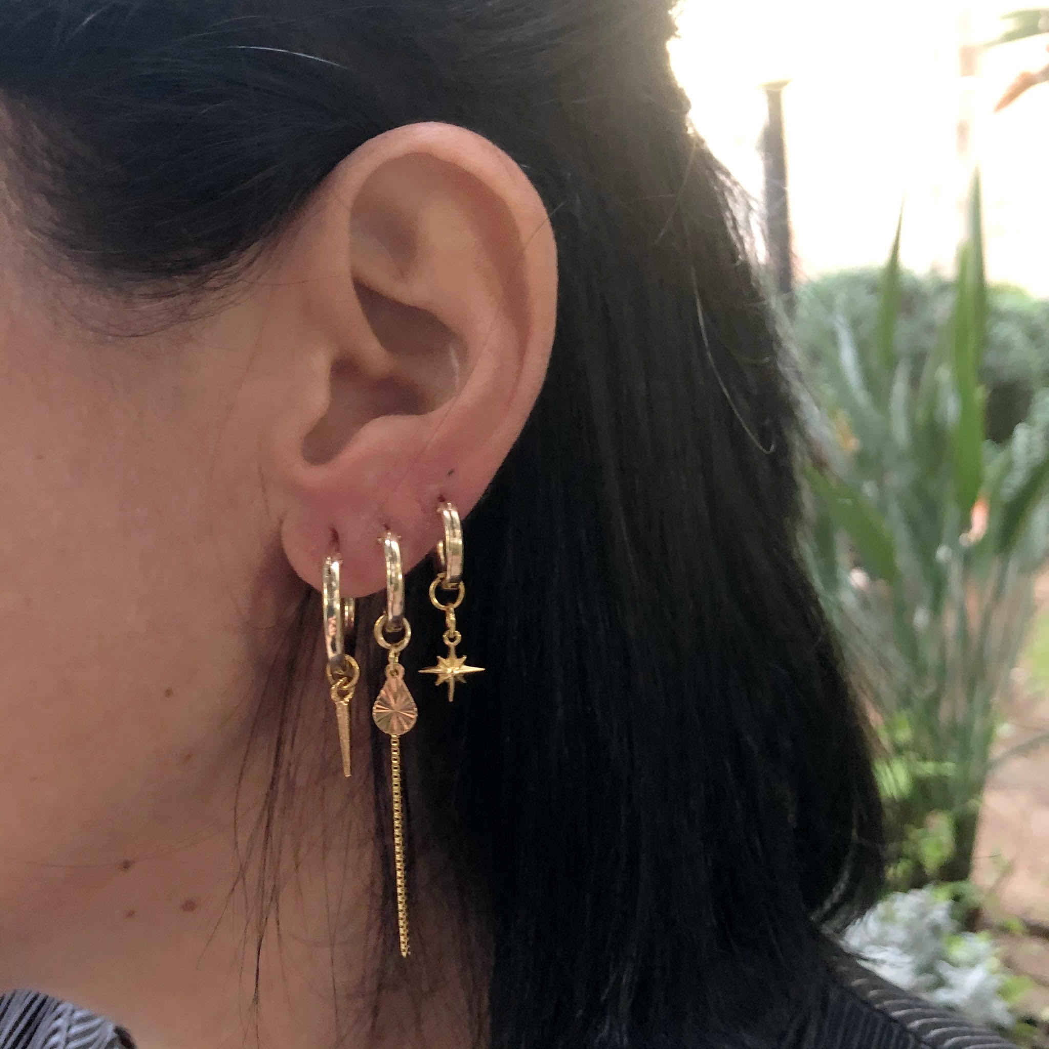 הסט עשוי כולו גולדפילד וציפוי זהב 24 קראט בעובי 2 מיקרון עמיד ואיכותי, מורכב משלושה עגילי חישוק בגדלים שונים – הגדול בקוטר 1.7 ס”מ עם תליון שפיץ, השני 1.5 ס”מ, עליו תלויה שרשרת עדינה ותליון טיפה מקסים, ועוד עגיל חישוק קטן בקוטר 1.3 ס”מ עליו תליון כוכב.