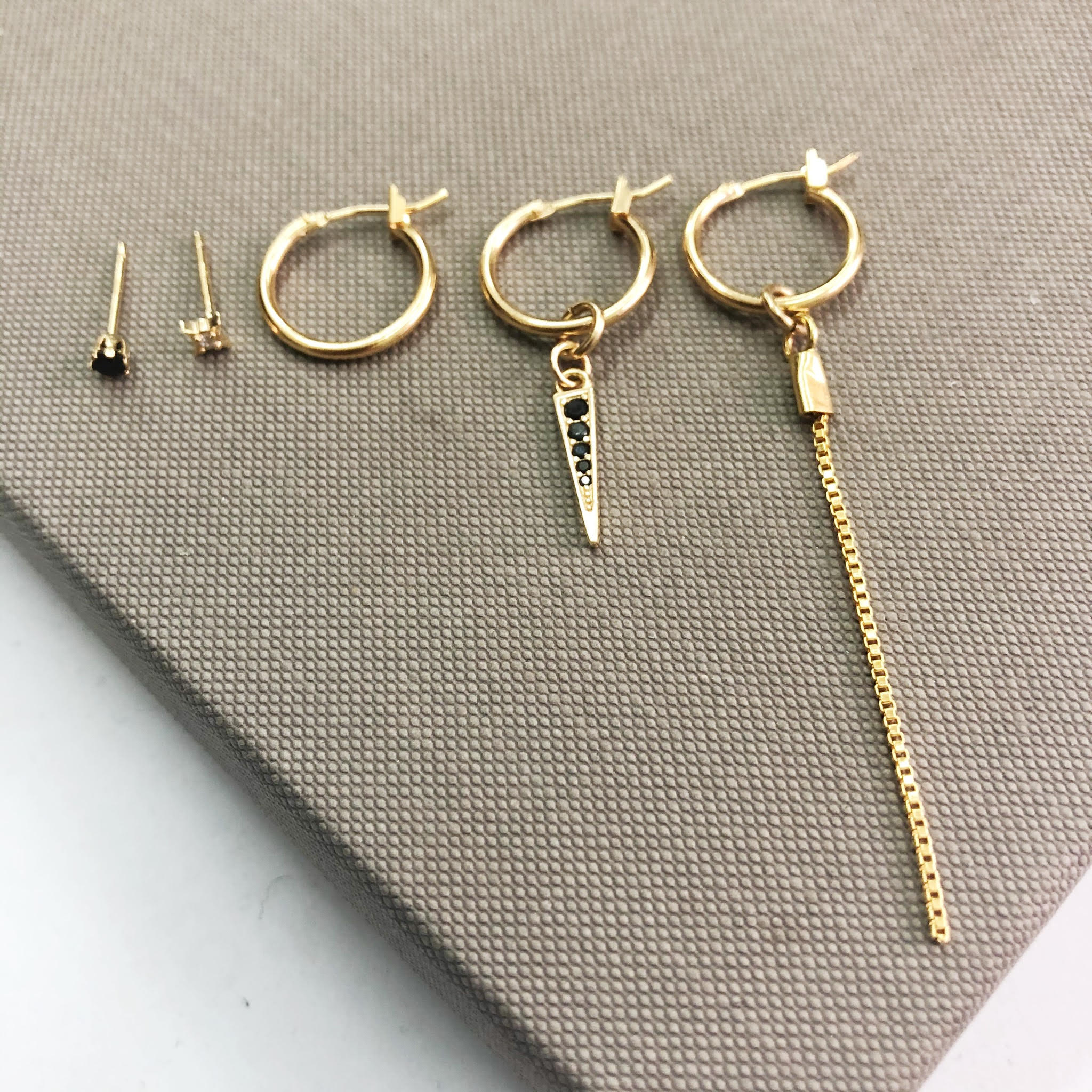 עגיל חישוק בקוטר 1.5 ס”מ ממנו נופלת שרשרת גולדפילד עדינה, עגיל חישוק בקוטר 1.5 ס”מ עם תליון שפיץ משובץ אבני קריסטל שחורות, עגיל חישוק חלק בקוטר 1.5 ס”מ , עגיל כוכב צמוד משובץ באבן קריסטל לבנה ועגיל צמוד משובץ באבן שחורה עדינה.