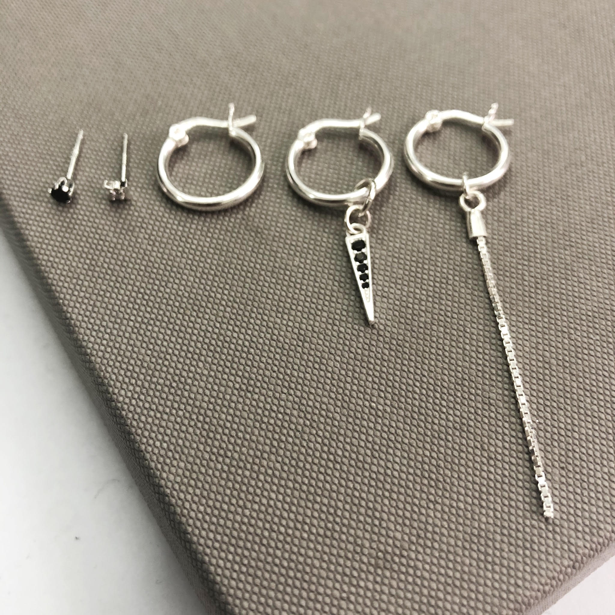 עגיל חישוק בקוטר 1.5 ס”מ ממנו נופלת שרשרת כסף עדינה, עגיל חישוק בקוטר 1.5 ס”מ עם תליון שפיץ משובץ אבני קריסטל שחורות, עגיל חישוק נקי בקוטר 1.5 ס”מ , עגיל כוכב צמוד משובץ באבן קריסטל לבנה ועגיל צמוד משובץ באבן שחורה עדינה.