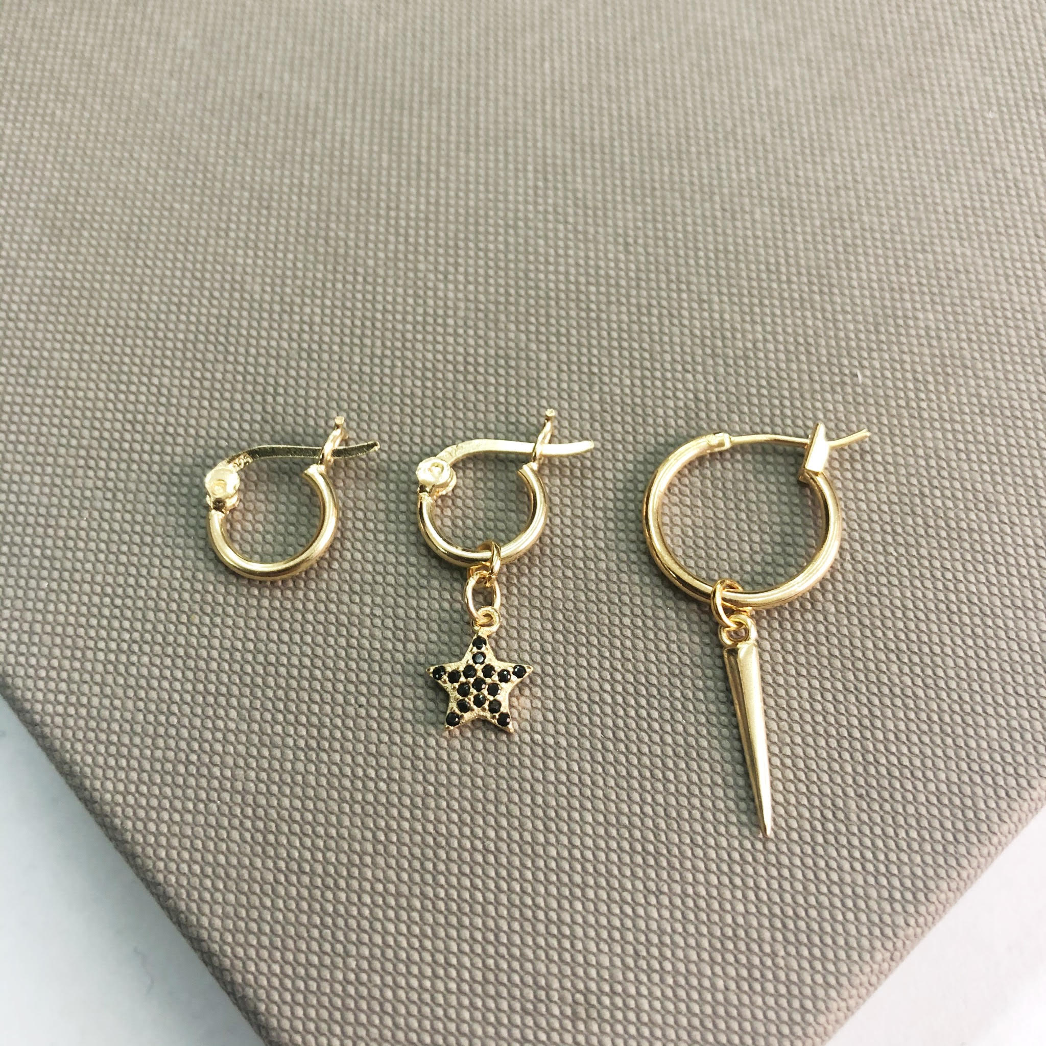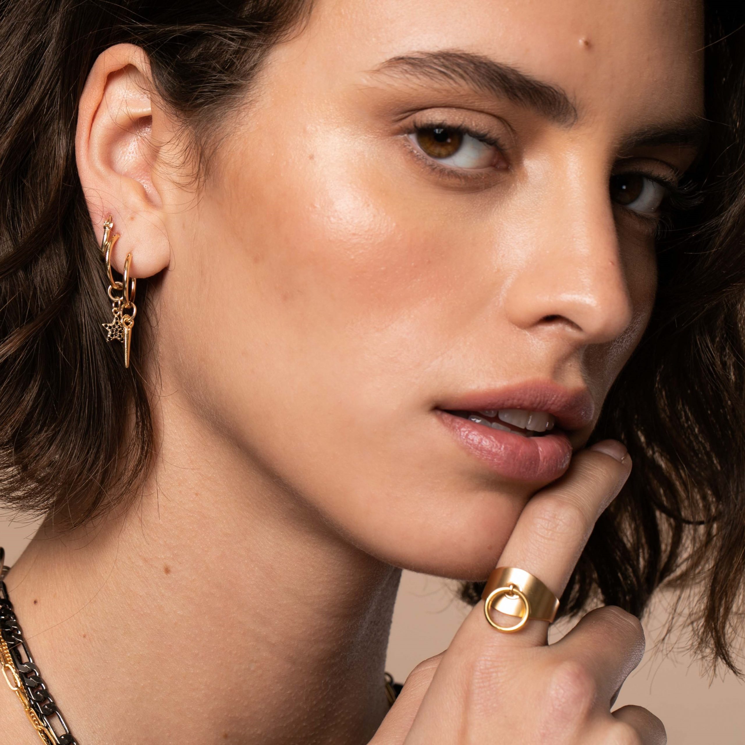 עגיל חישוק בקוטר 1.5 ס”מ עליו תלוי תליו שפיץ עדין, עגיל חישוק בקוטר 1 ס”מ עליו תליון כוכב משובץ באבני קריסטל שחורות ועגיל חישוק נוסף קטן להשלמת הלוק.