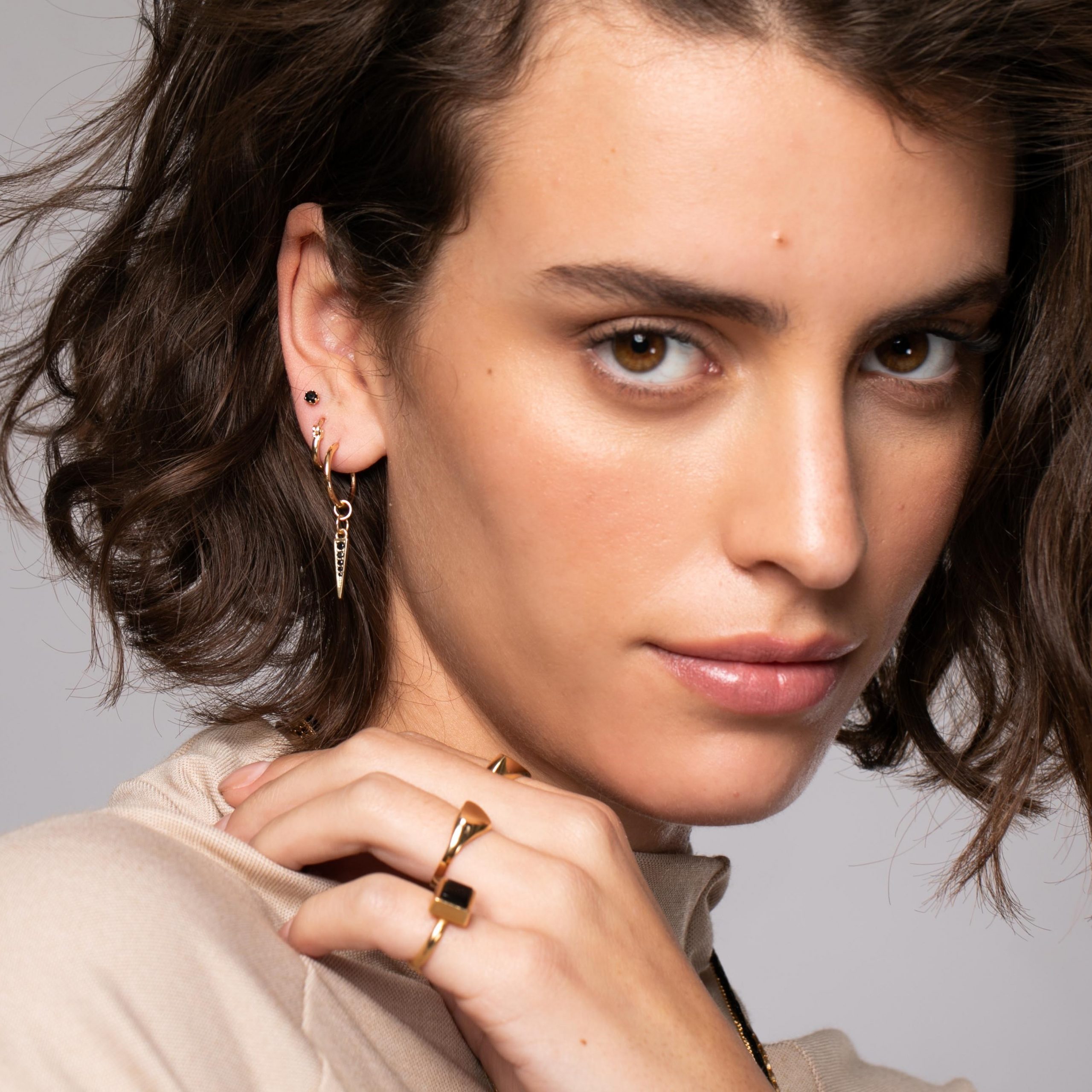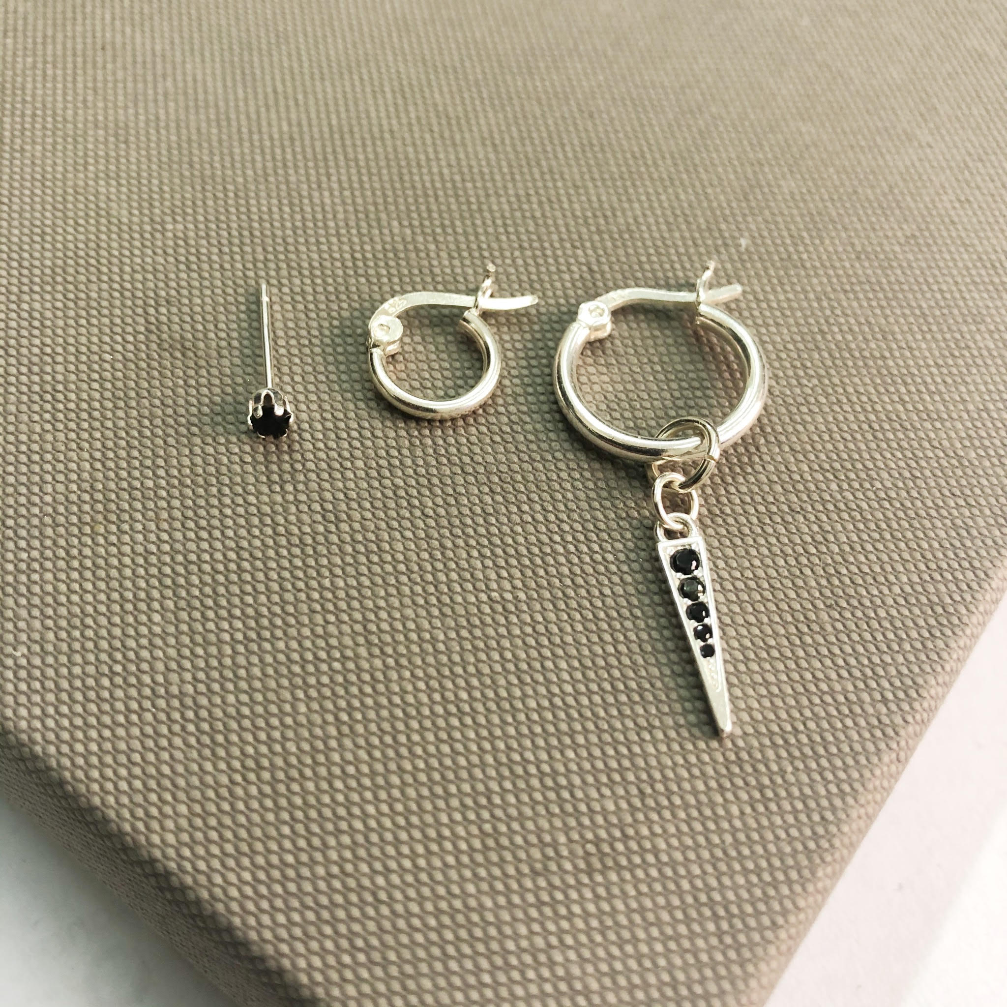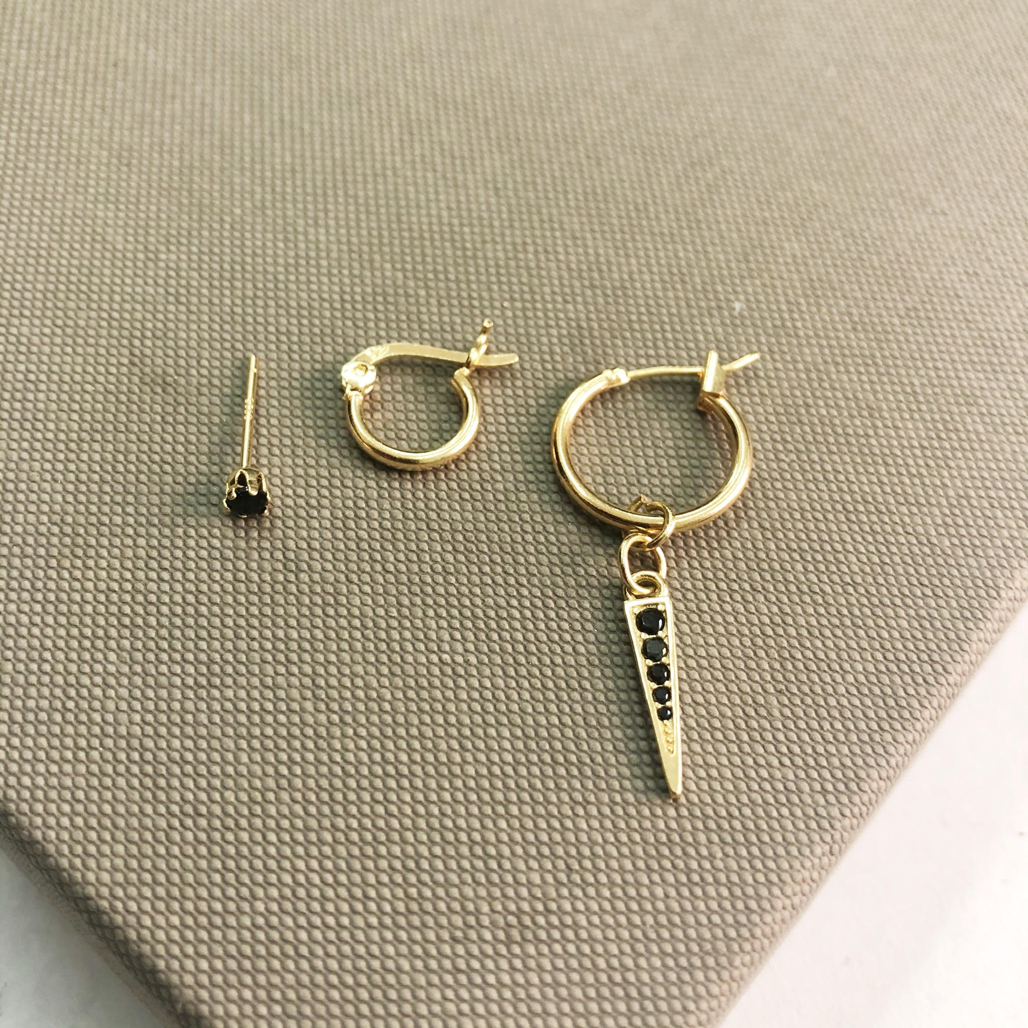 עגיל חישוק בקוטר 1.5 ס”מ עליו תלוי תליו שפיץ עדין משובץ באבני קריסטל שחורות, עגיל חישוק בקוטר 1 ס”מ ועגיל צמוד עם קריסטל שחור משובץ  להשלמת הלוק.