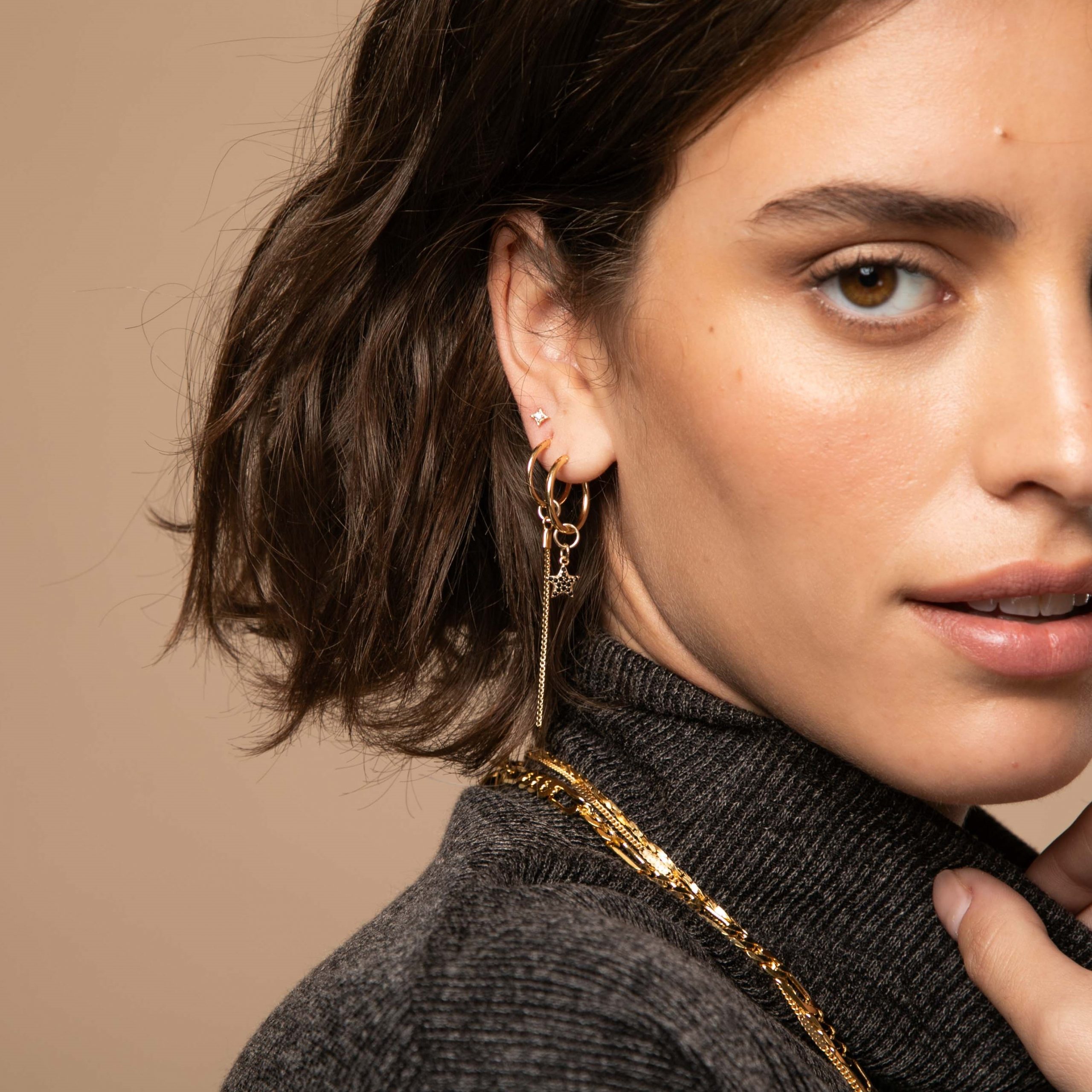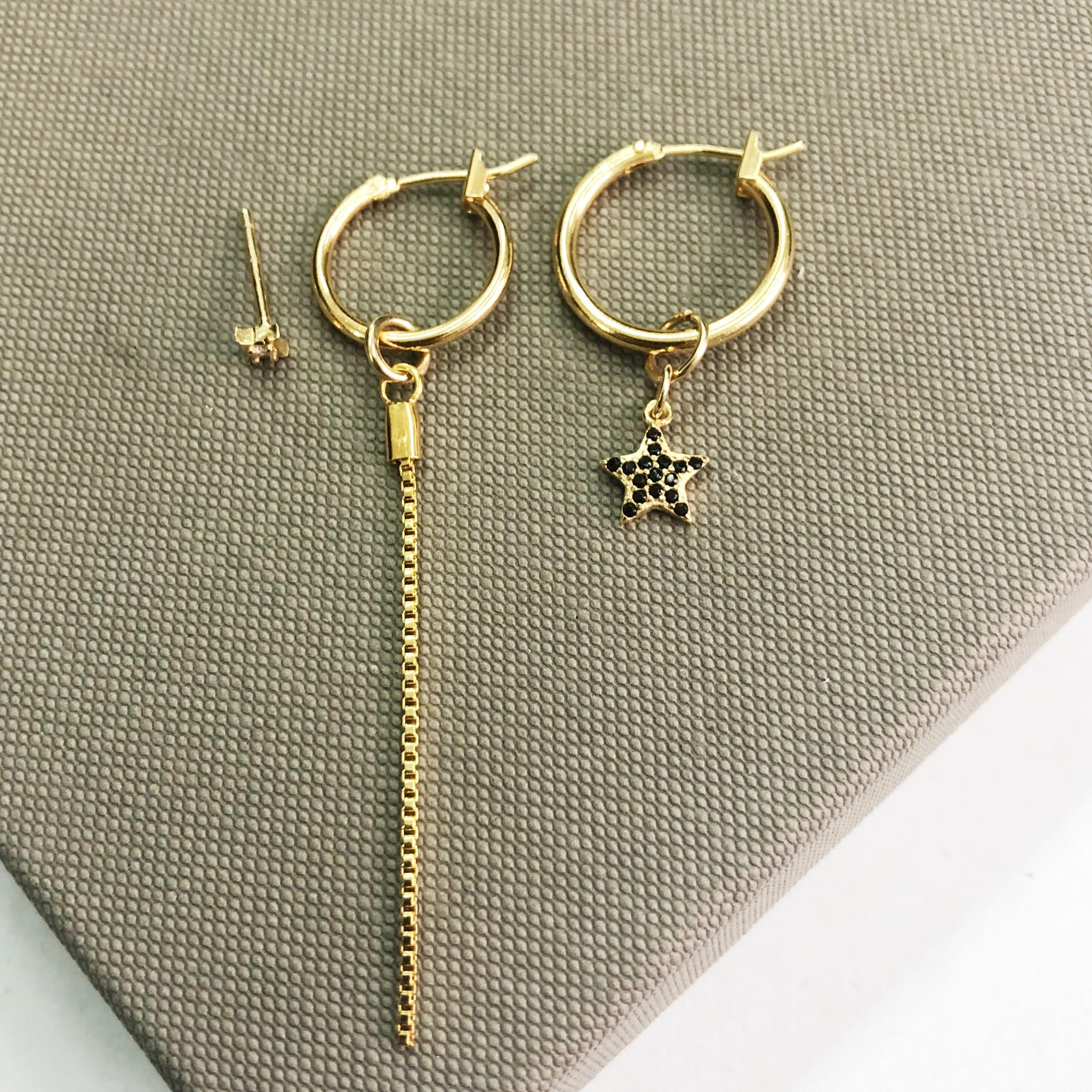 עגיל חישוק בקוטר 1.5 ס”מ עליו תלוי תליון כוכב מהמם משובץ באבני קריסטל שחורות עדינות, עגיל חישוק בקוטר 1.3 ס”מ עליו תלויה שרשרת כסף עדינה, ועגיל צמוד קטן משובץ באבן קריסטל להשלמת הלוק.