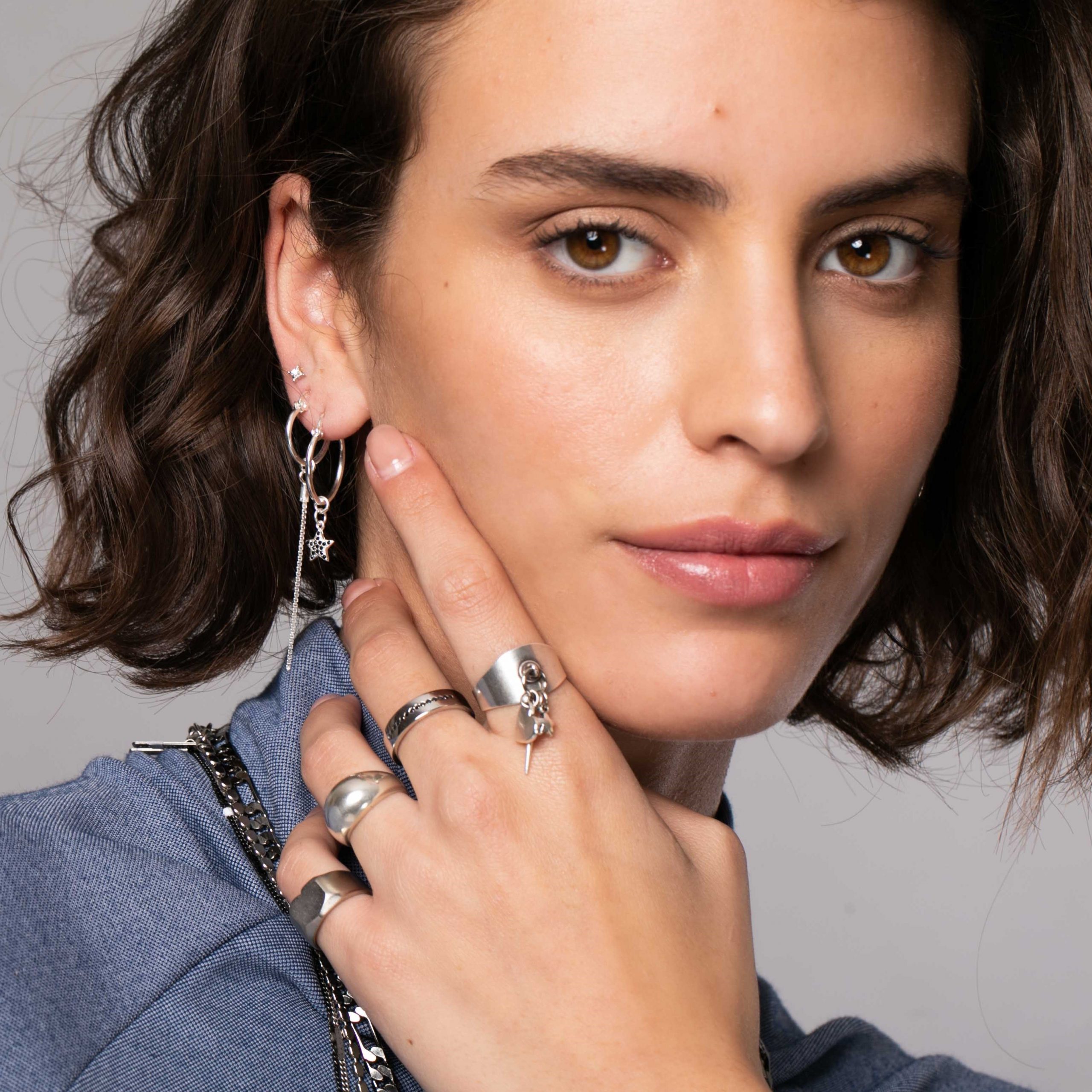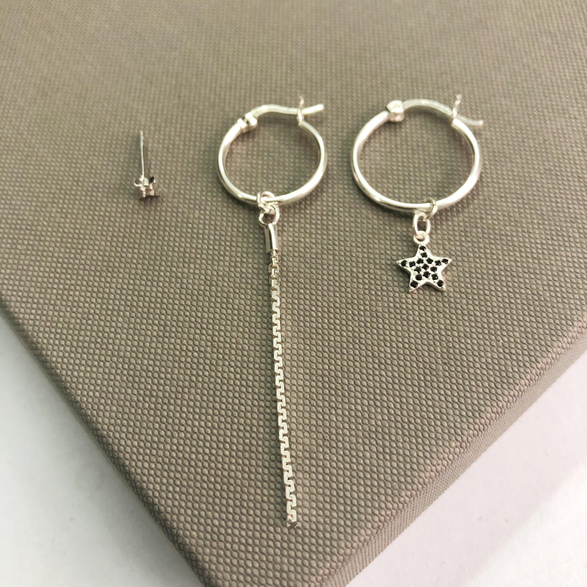 עגיל חישוק בקוטר 1.5 ס”מ עליו תלוי תליון כוכב מהמם משובץ באבני קרסיטל שחורות עדינות, עגיל חישוק בקוטר 1.3 ס”מ עליו תלויה שרשרת כסף עדינה ,ועגיל צמוד קטן משובץ באבן קריסטל להשלמת הלוק.