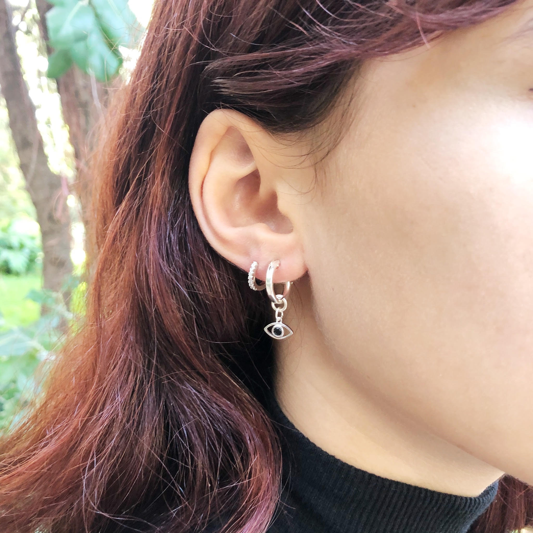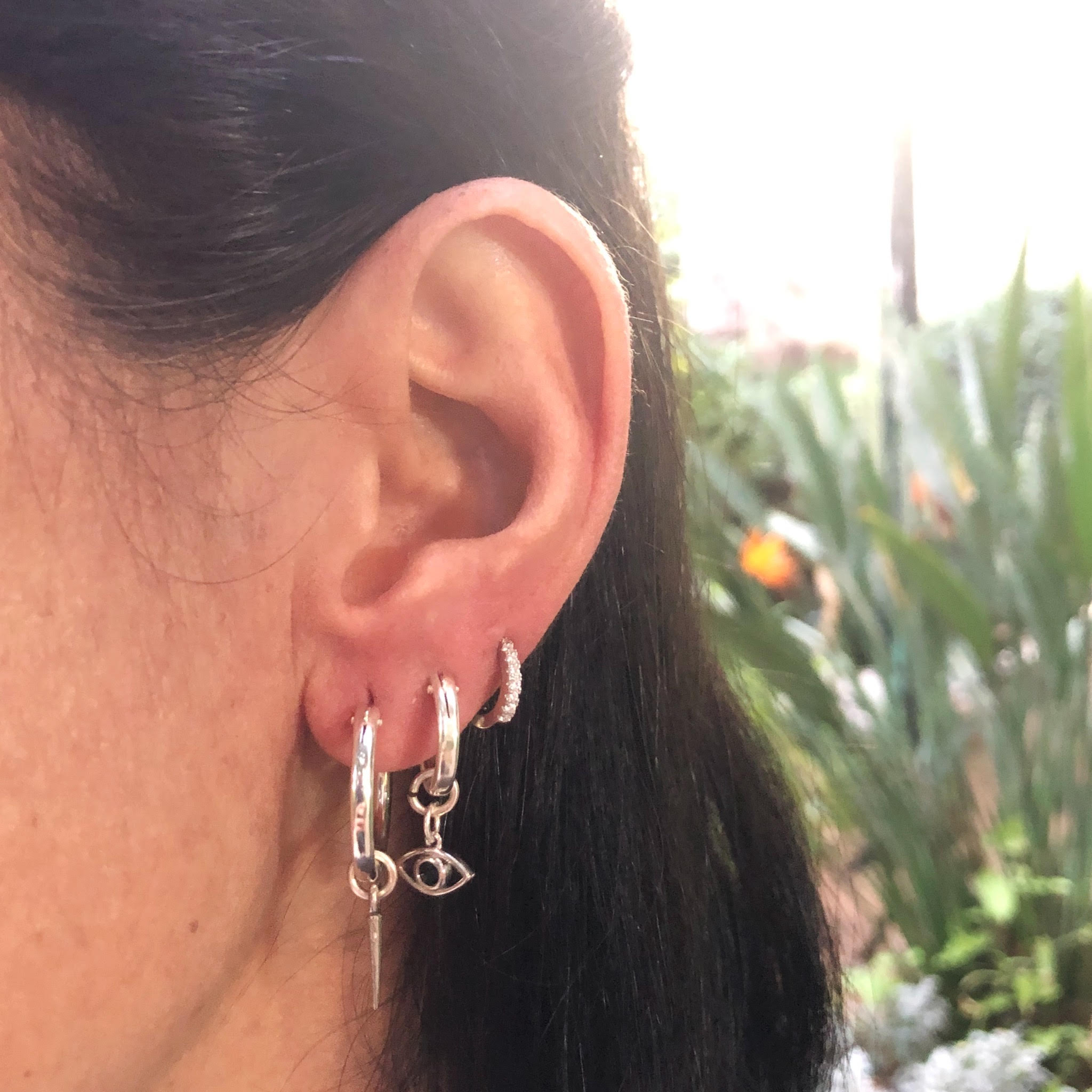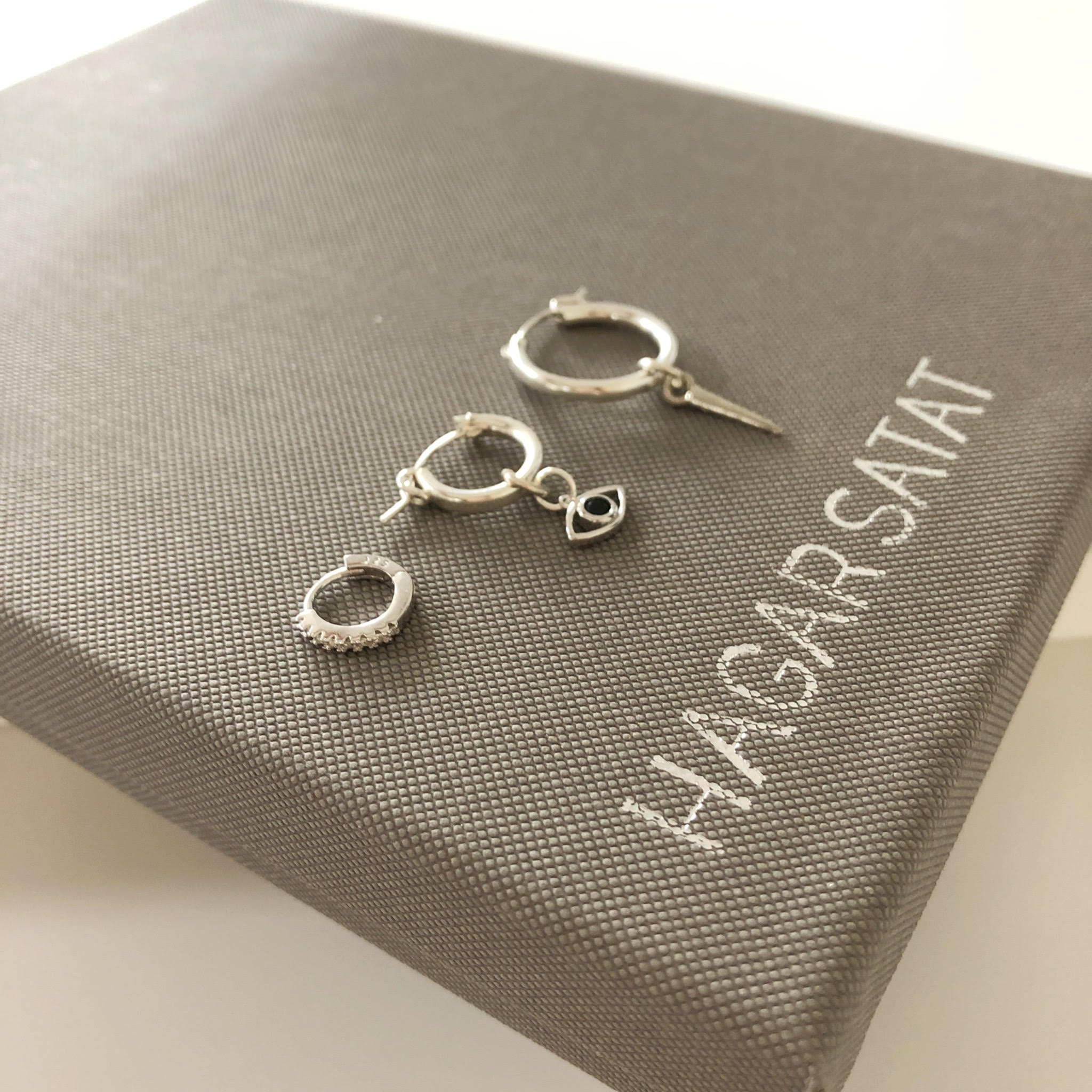 מכיל ששלושה עגילים שונים . עגיל חישוק בקוטר כ1.7 ס”מ עם תליון שפיץ והשני חישוק בקוטר כ1.5 ס”מ עם תליון עין כסוף משובץ באבן שחורה ועוד עגיל חישוק קטן משובץ באבני קריסטל בהירות.