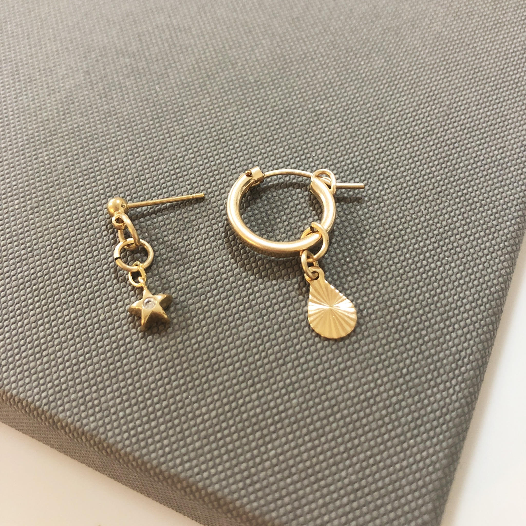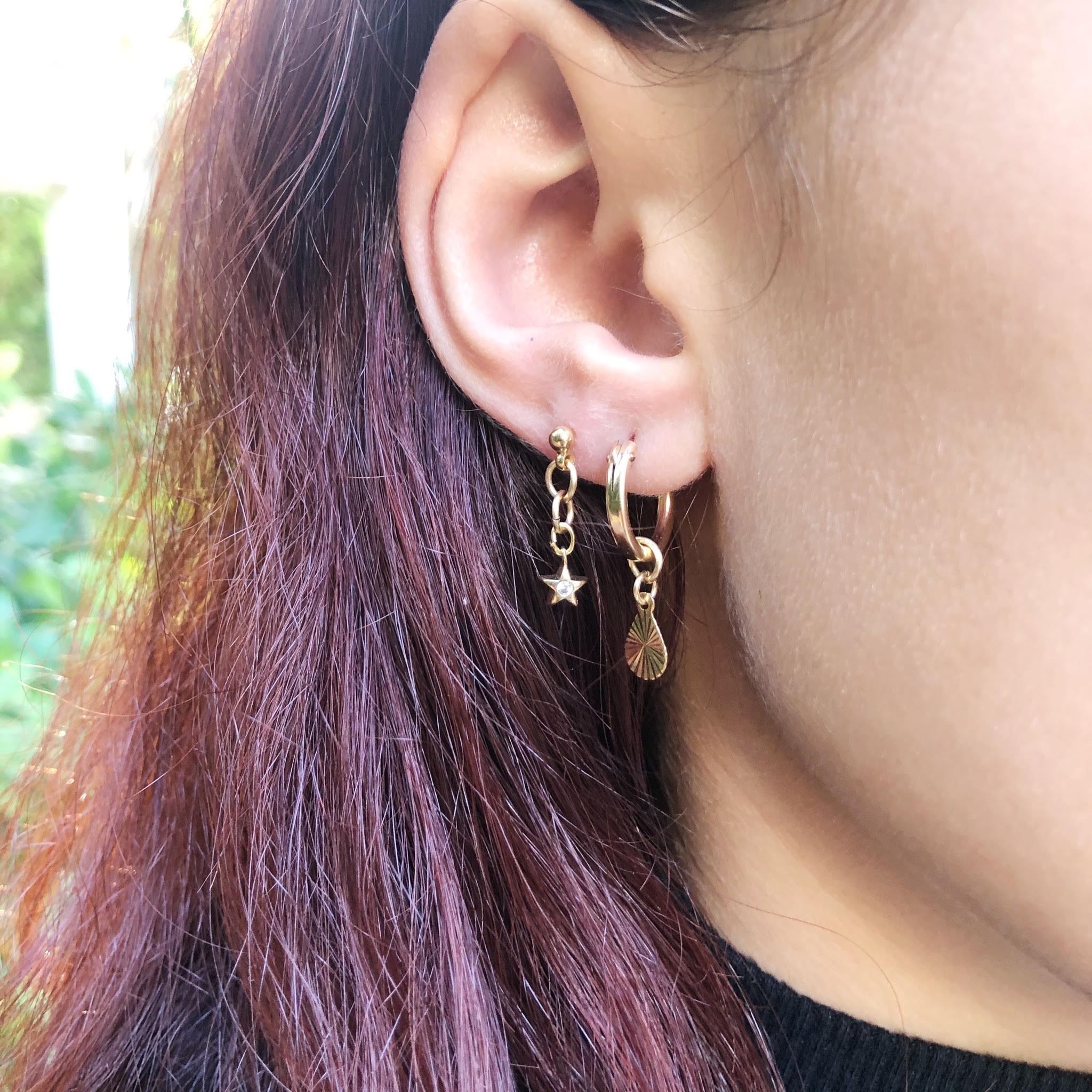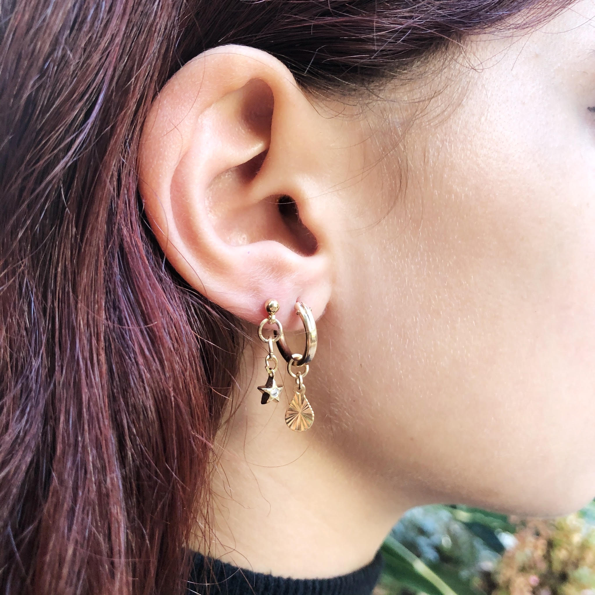 ,עגיל חישוק בקוטר 1.3 ס”מ עליו תלוי תליון בצורת טיפה עם טקסטורה מנצנצת ועגיל צמוד עם תליון כוכב עדין משובץ באבן קריסטל.