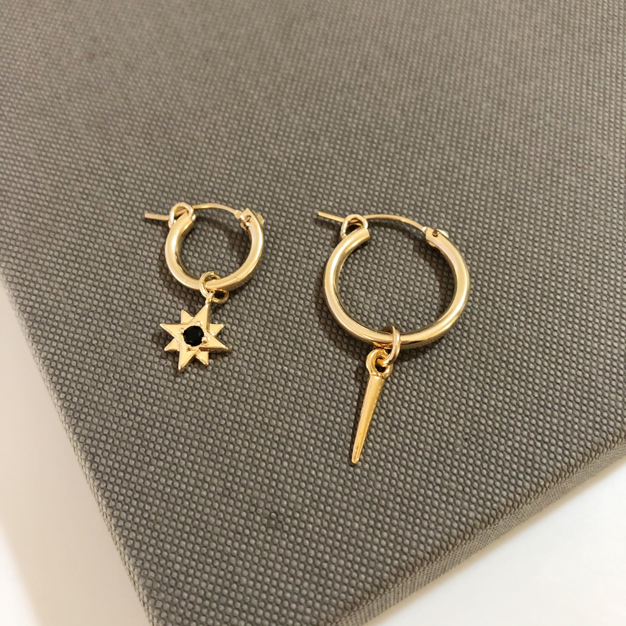 ,עגיל חישוק בקוטר 1.8 ס”מ עליו תלוי תליון שפיץ ועגיל חישוק בקוטר 1.5 ס”מ עליון תלוי תליון כוכב משובץ באבן קריסטל שחורה.