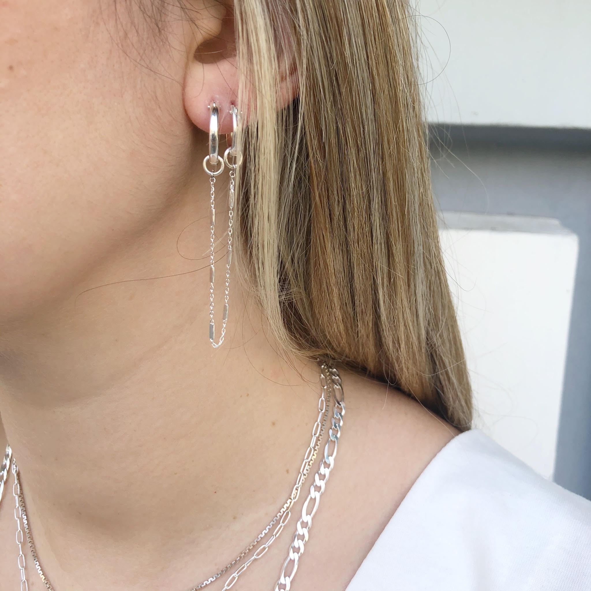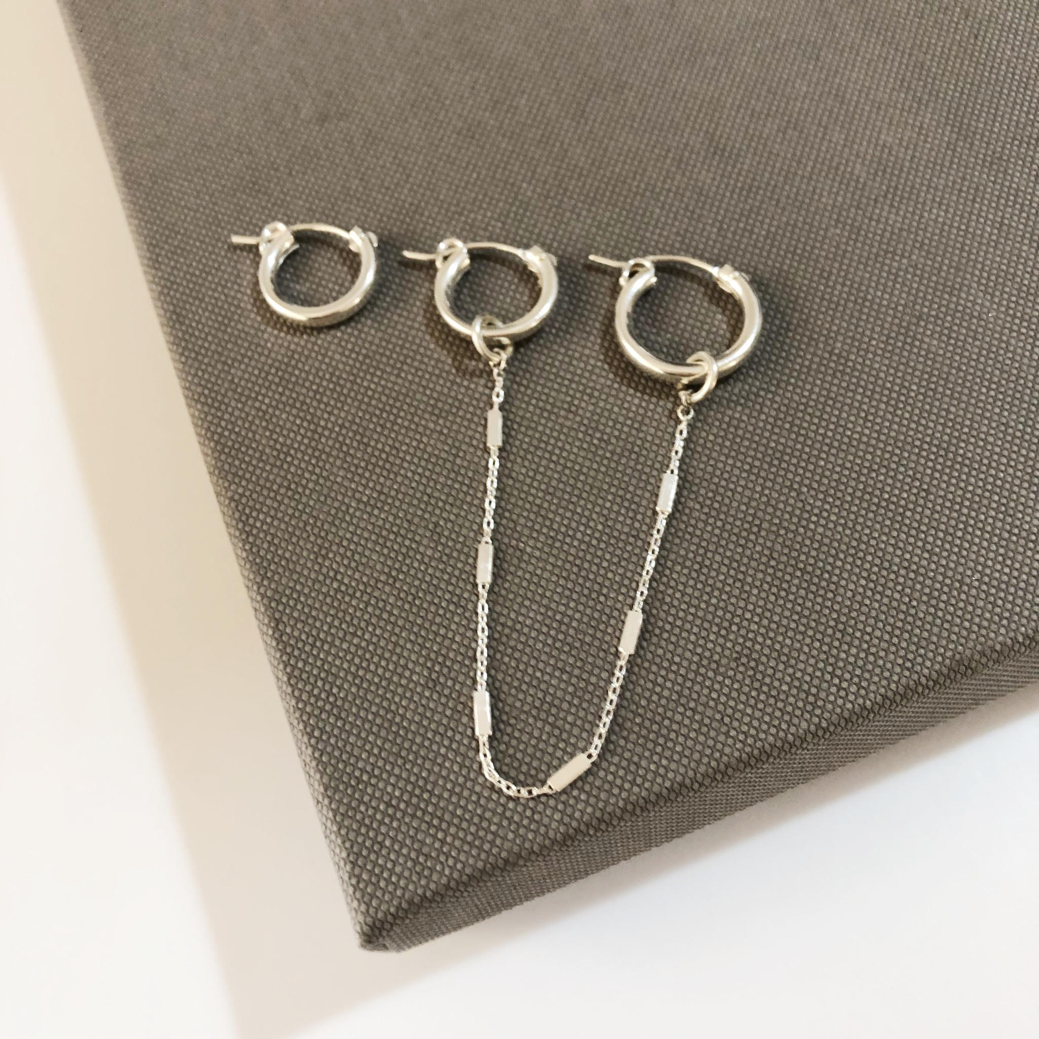 עגיל חישוק בקוטר 1.5 ס”מ ועגיל חישוק בקוטר 1.3 ס”מ מחוברים עם שרשרת עדינה, ועגיל חישוק נוסף קטן להשלמת הלוק.