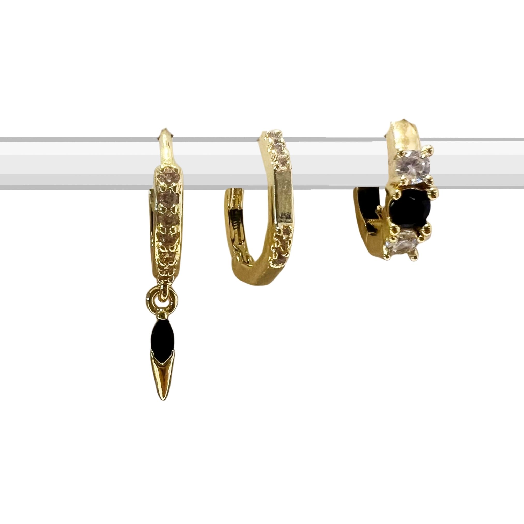 עגיל חישוק בקוטר של כ-1 ס”מ משובץ אבן מרכזית ושתי אבני קריסטל בצדדים.
