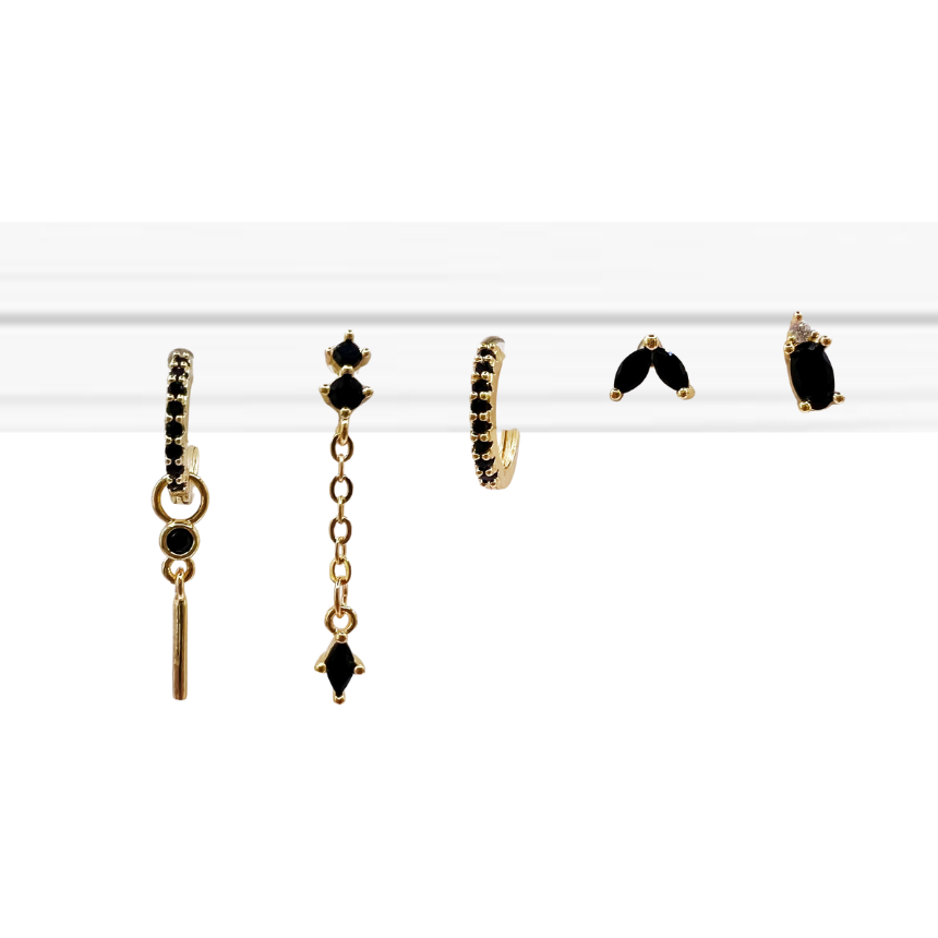 עגיל צמוד עם שתי אבני קריסטל שחורות אליו מחוברת שרשרת עם אבן שחורה נוספת.