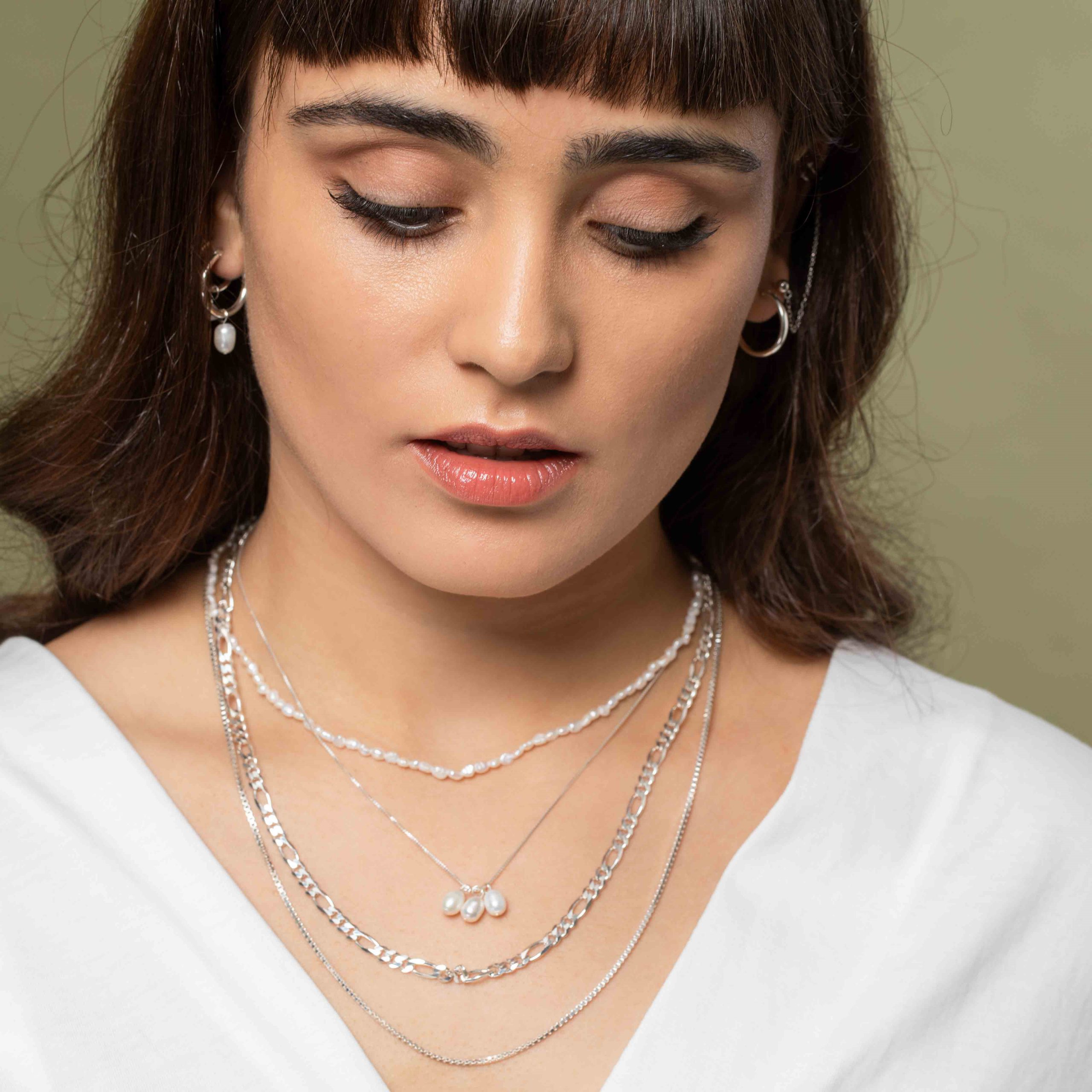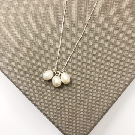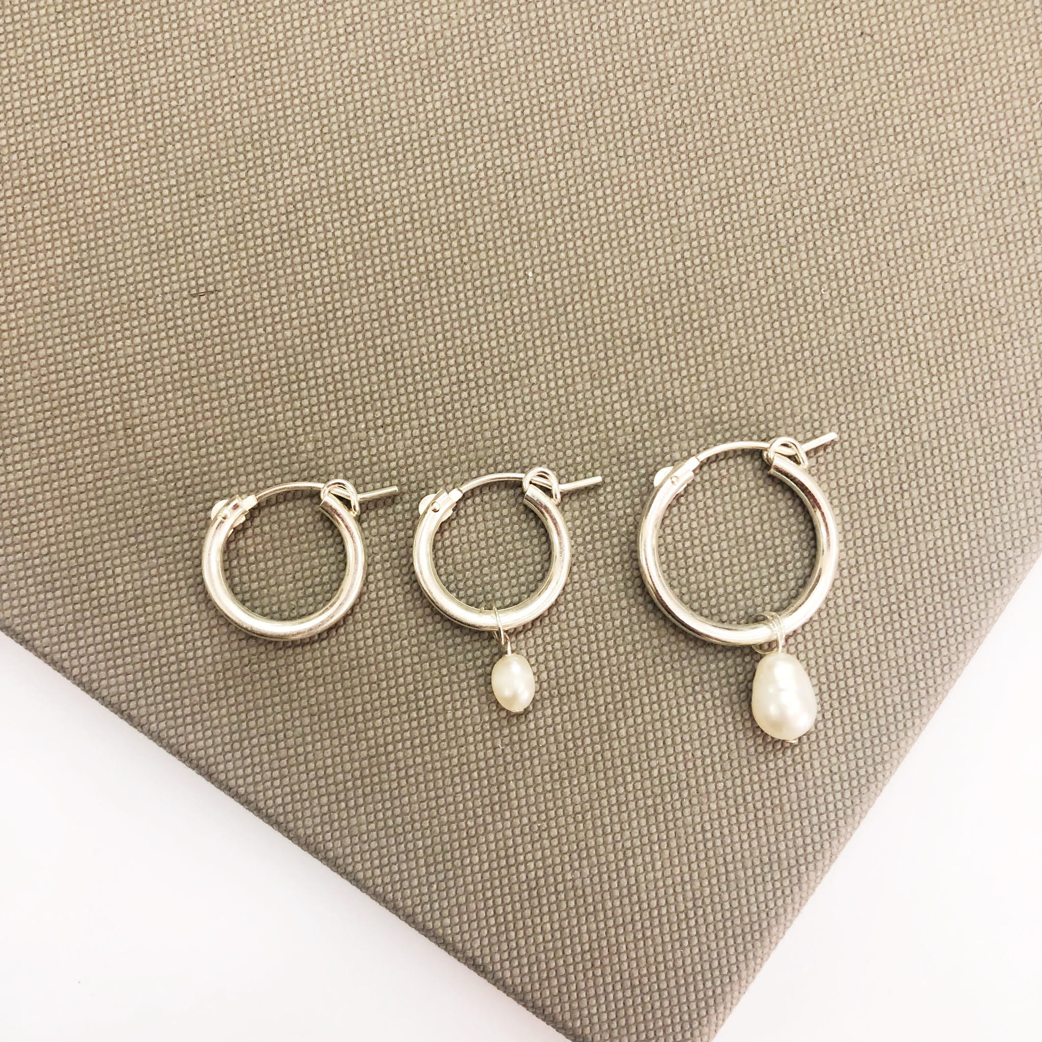 עגיל חישוק בקוטר 1.5 ס”מ עליו תלויה פנינה בינונית, עגיל חישוק בקוטר 1.3 ס”מ עליו תלויה פנינה קטנה ועגיל חישוק בקוטר 1.3 ס”מ.