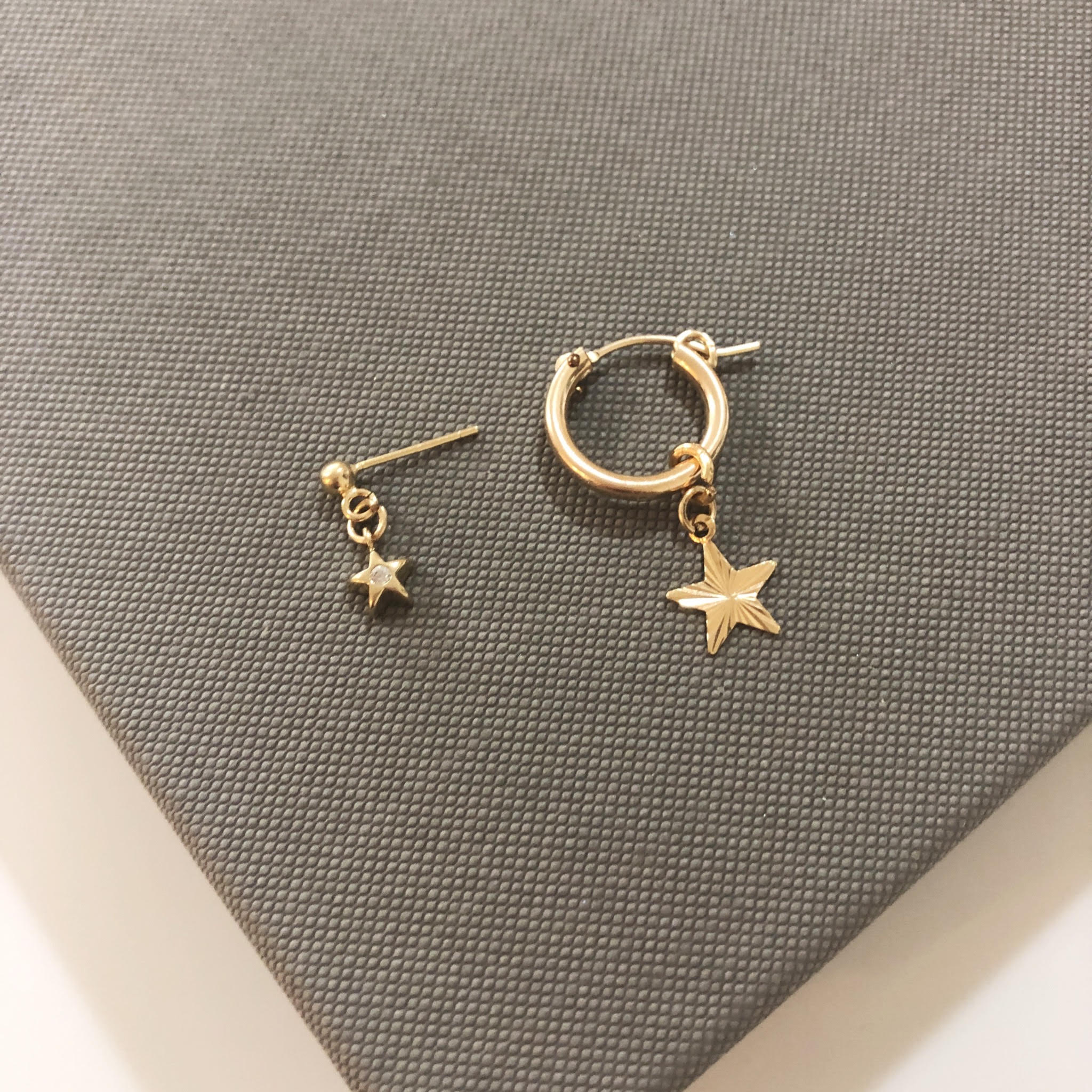 ,עגיל חישוק בקוטר 1.5 ס”מ עליו תלוי תליון כוכב מנצנץ ועגיל צמוד על תליון כוכב עדין משובץ באבן קריסטל עדינה.