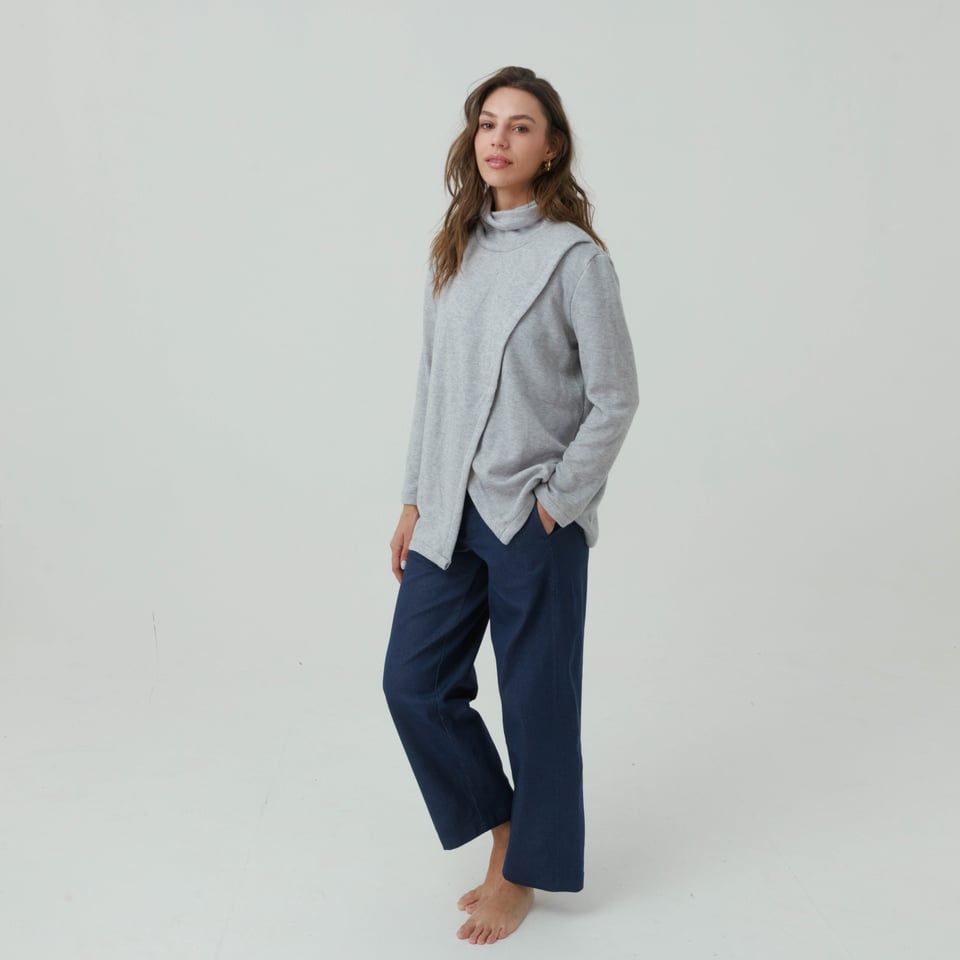 השכבה העליונה יורדת באלכסון מהכתף. המראה הכללי הוא מינימליסטי עם טוויסט – מתאים ליום עבודה או לשעות הפנאי.