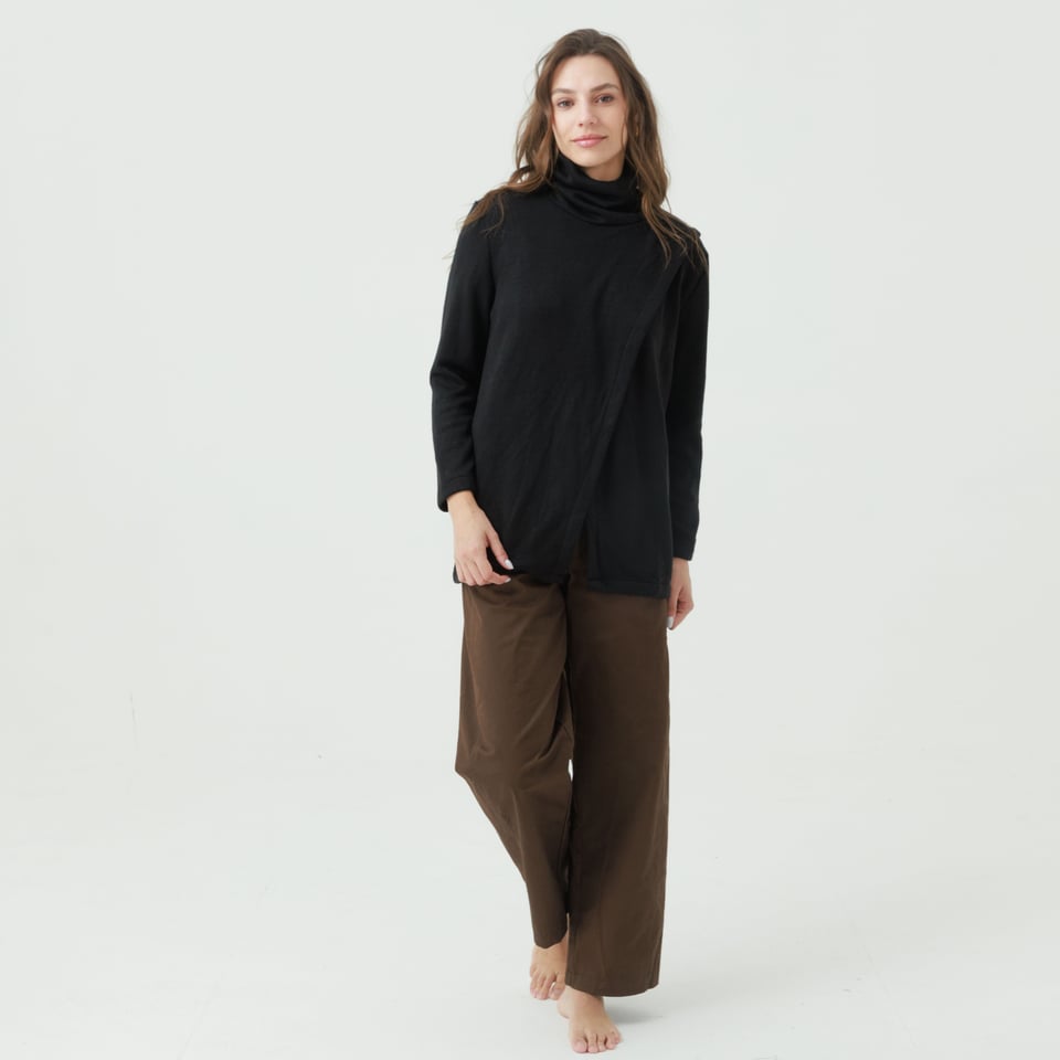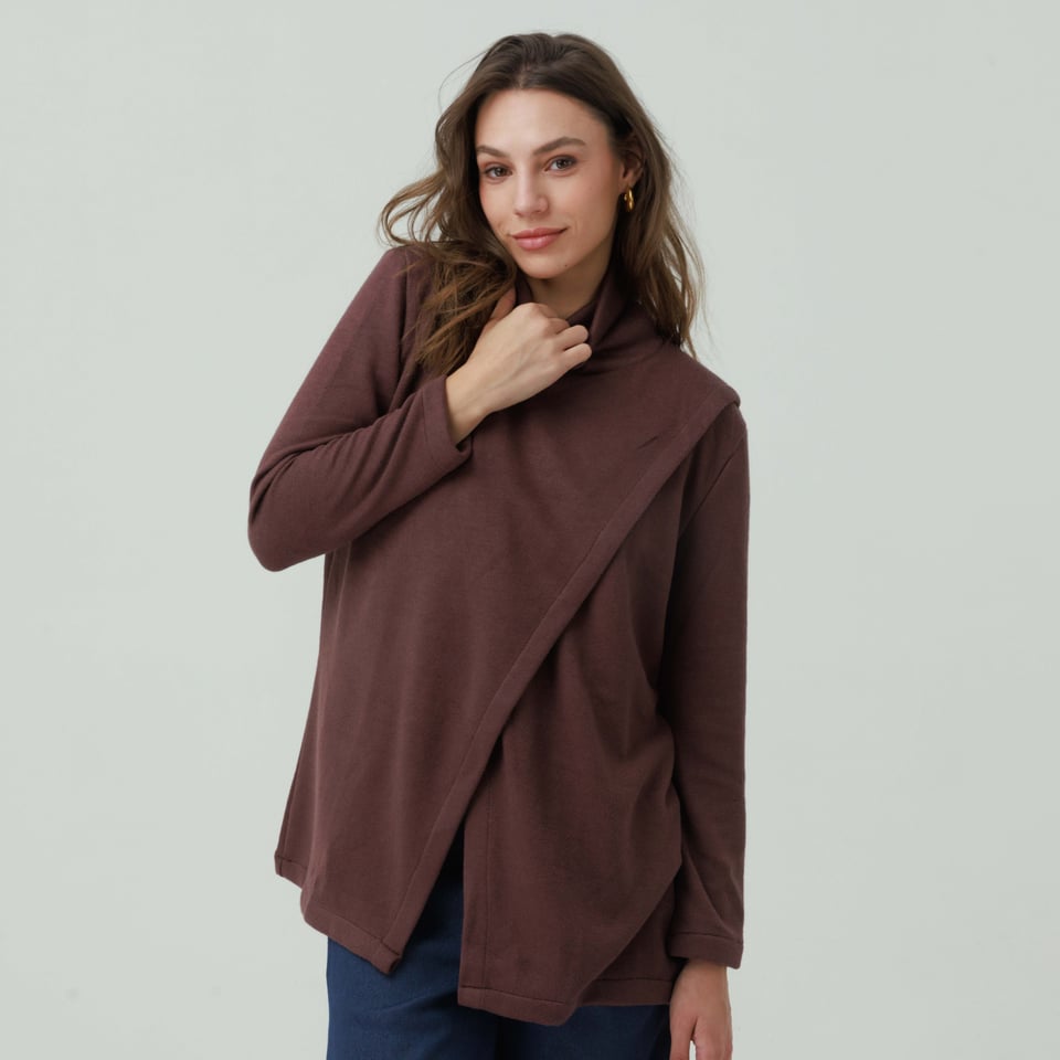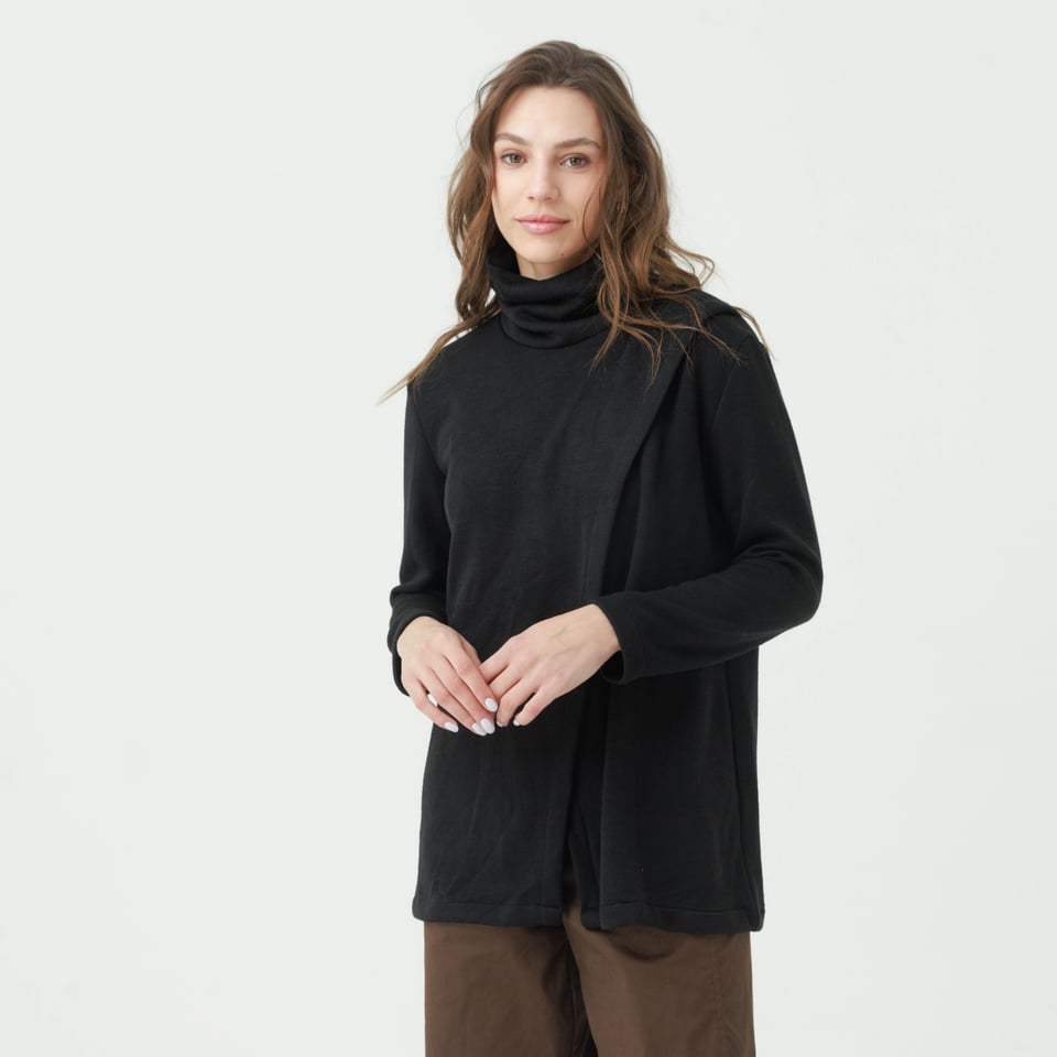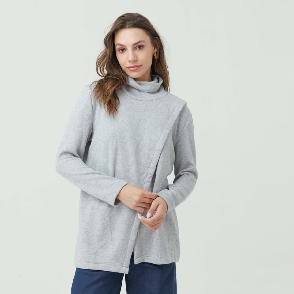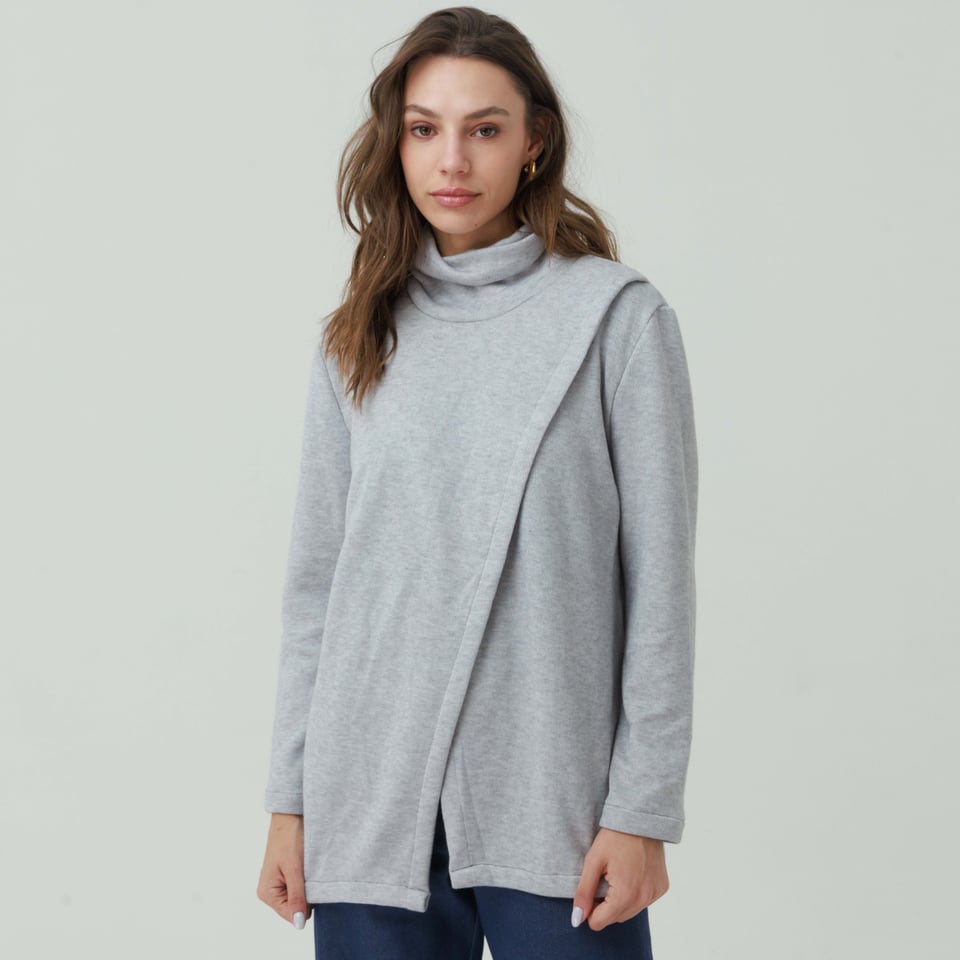 לסריג צווארון גולף רפוי מעט למראה חמים ונינוח. חלקו הקדמי של הסריג עשוי שתי שכבות בצורת מעטפת א-סימטרית.
