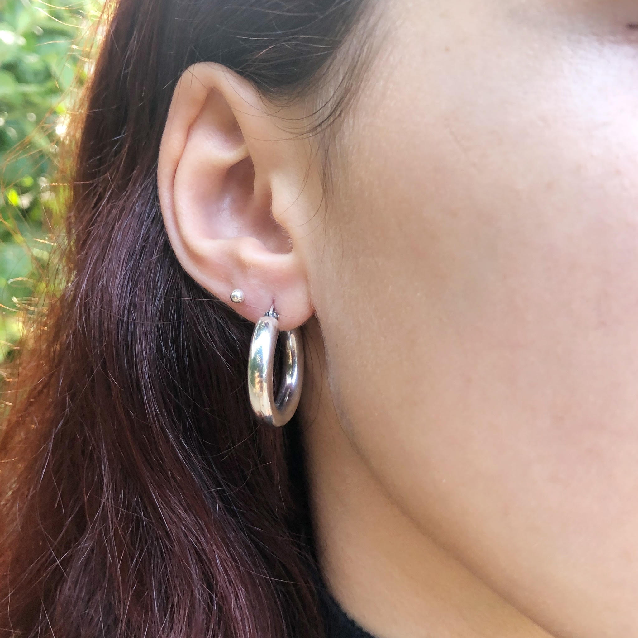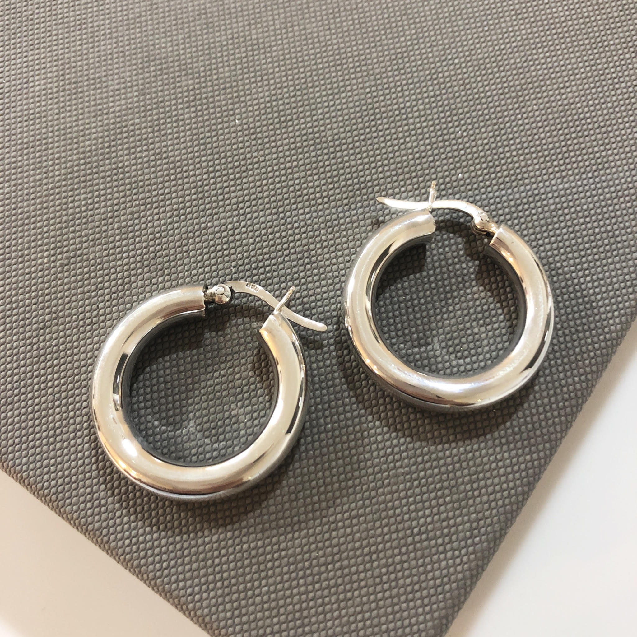 עגילי חישוק קלאסיים עבים יחסית עשויים כסף אמיתי.