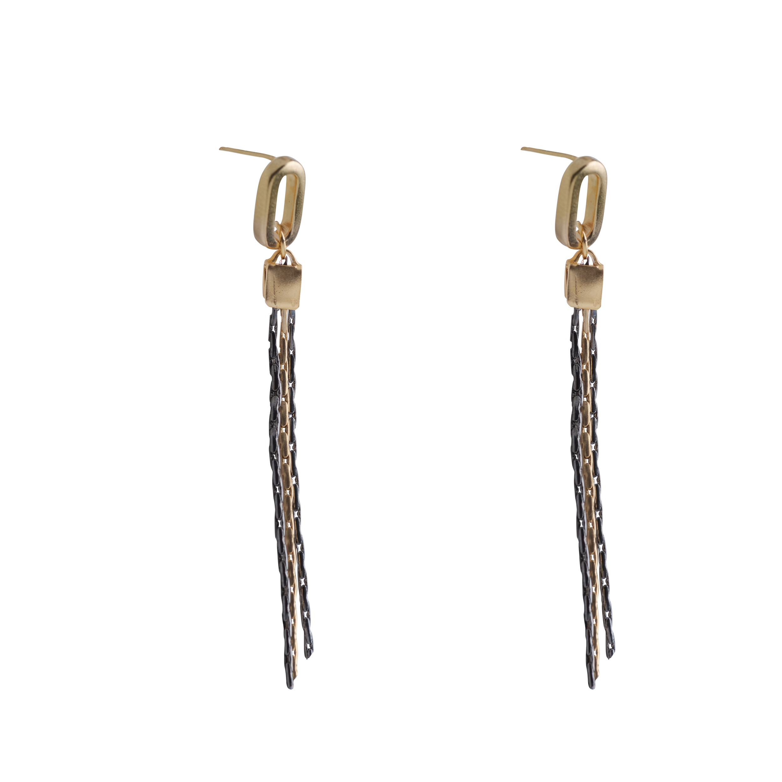 עגילים נתלים ארוכים בעיצוב שרשראות, עשויים מתכת בציפוי זהב 24 קראט או בציפוי כסוף בגוון מט.