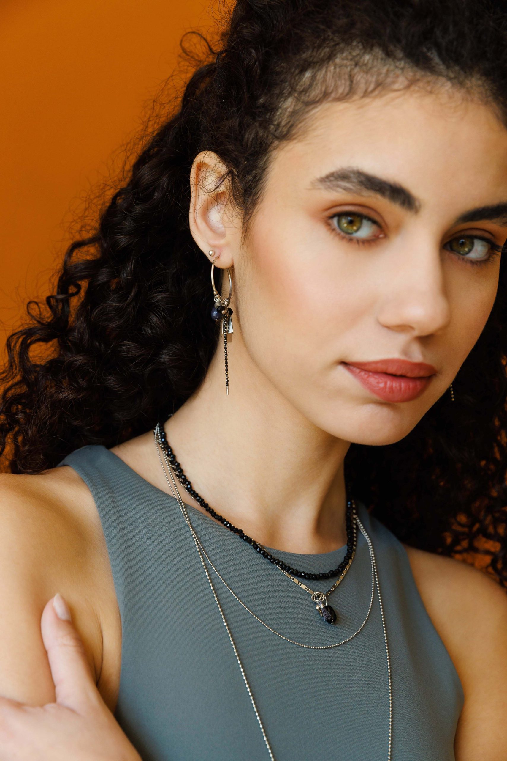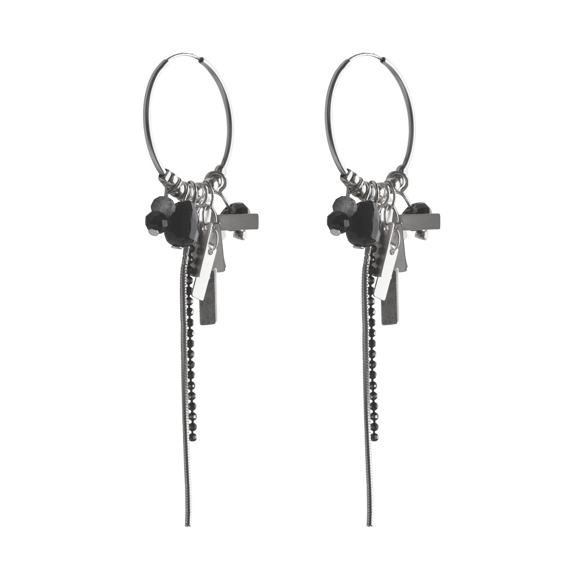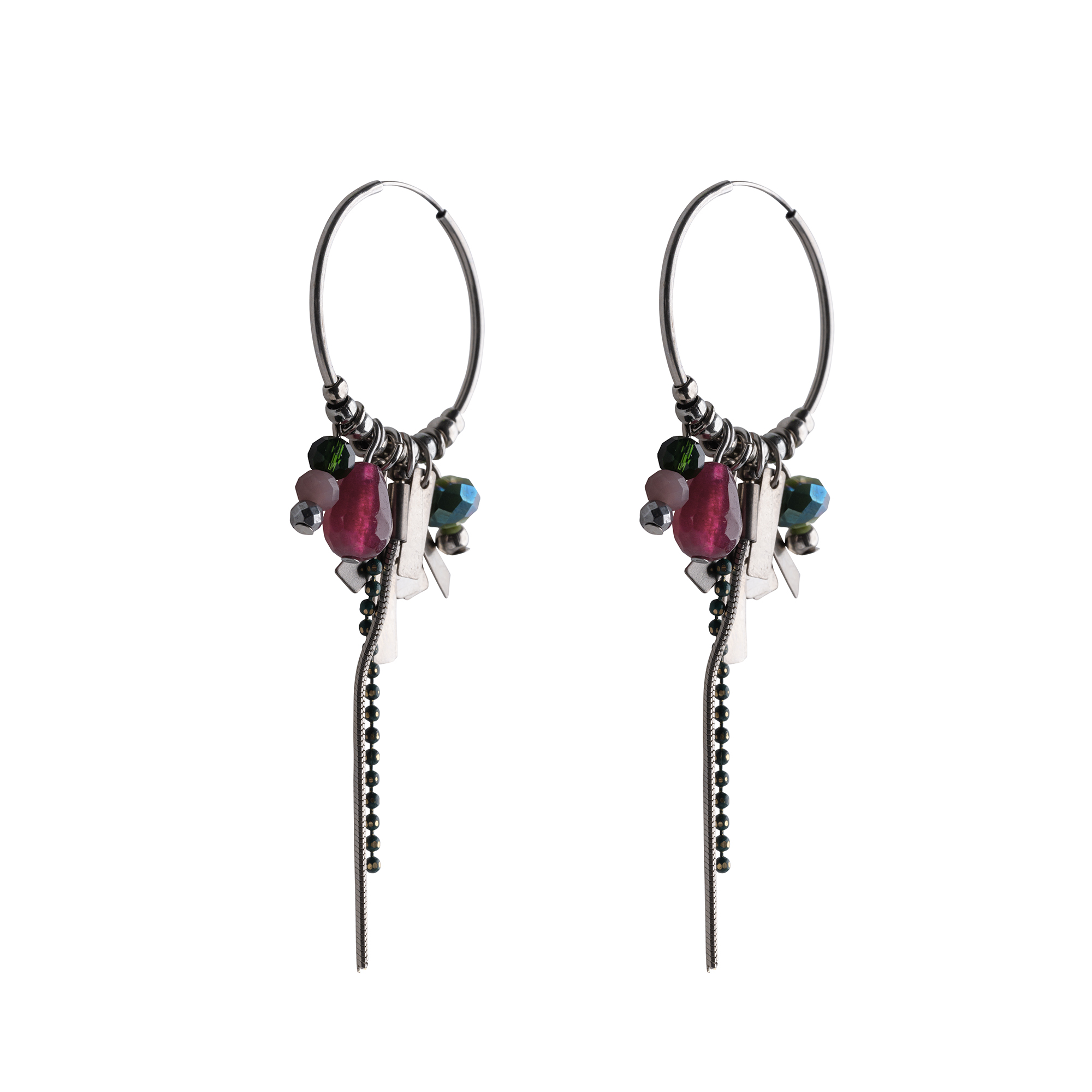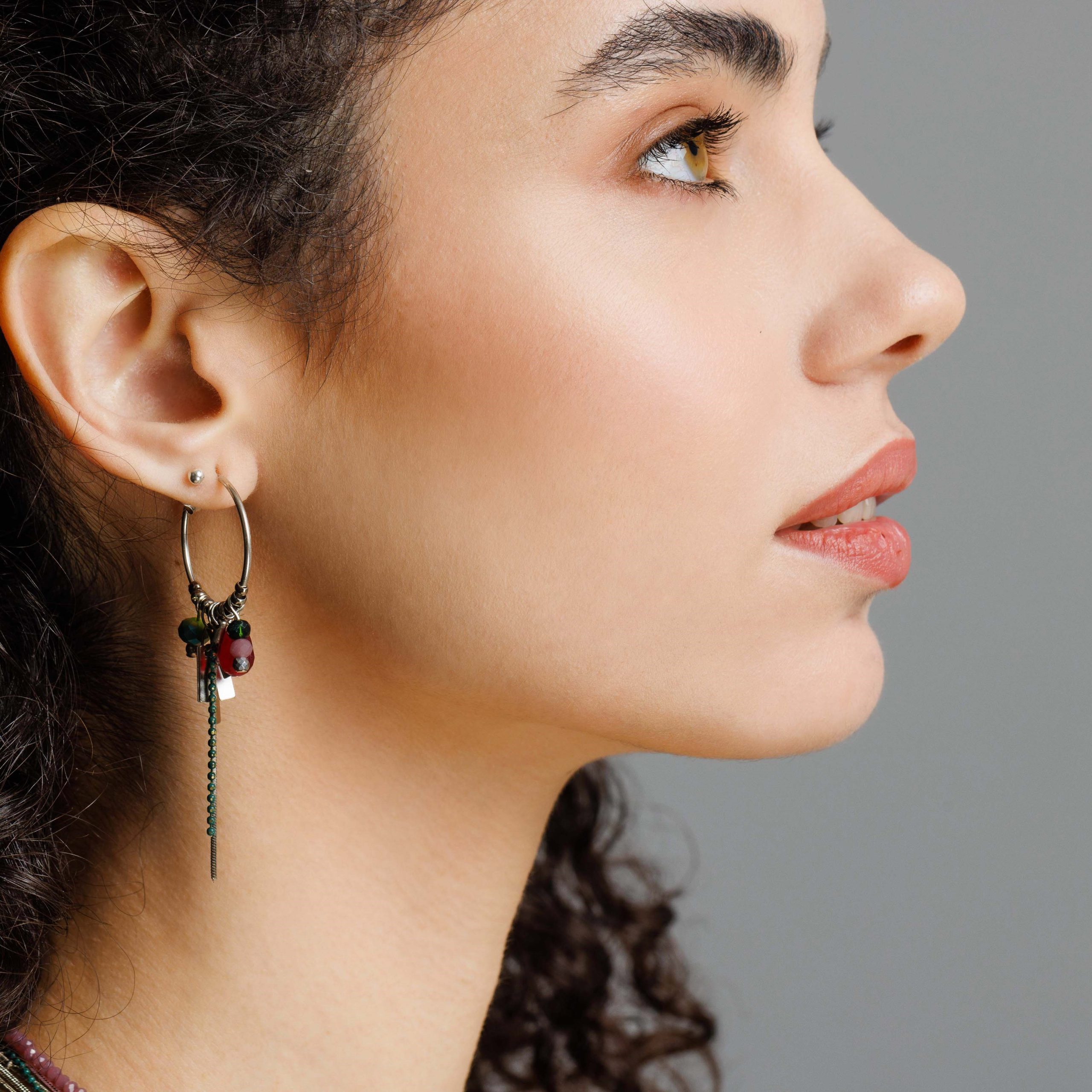 עגילים משגעים עשויים עגיל חישוק בקוטר כ3 ס”מ עליו תלויים אלמנטים משגעים ( אבני קריסטל, גדיל, שרשראות) שנותנים לו מראה שיקי ובעל נוכחות.