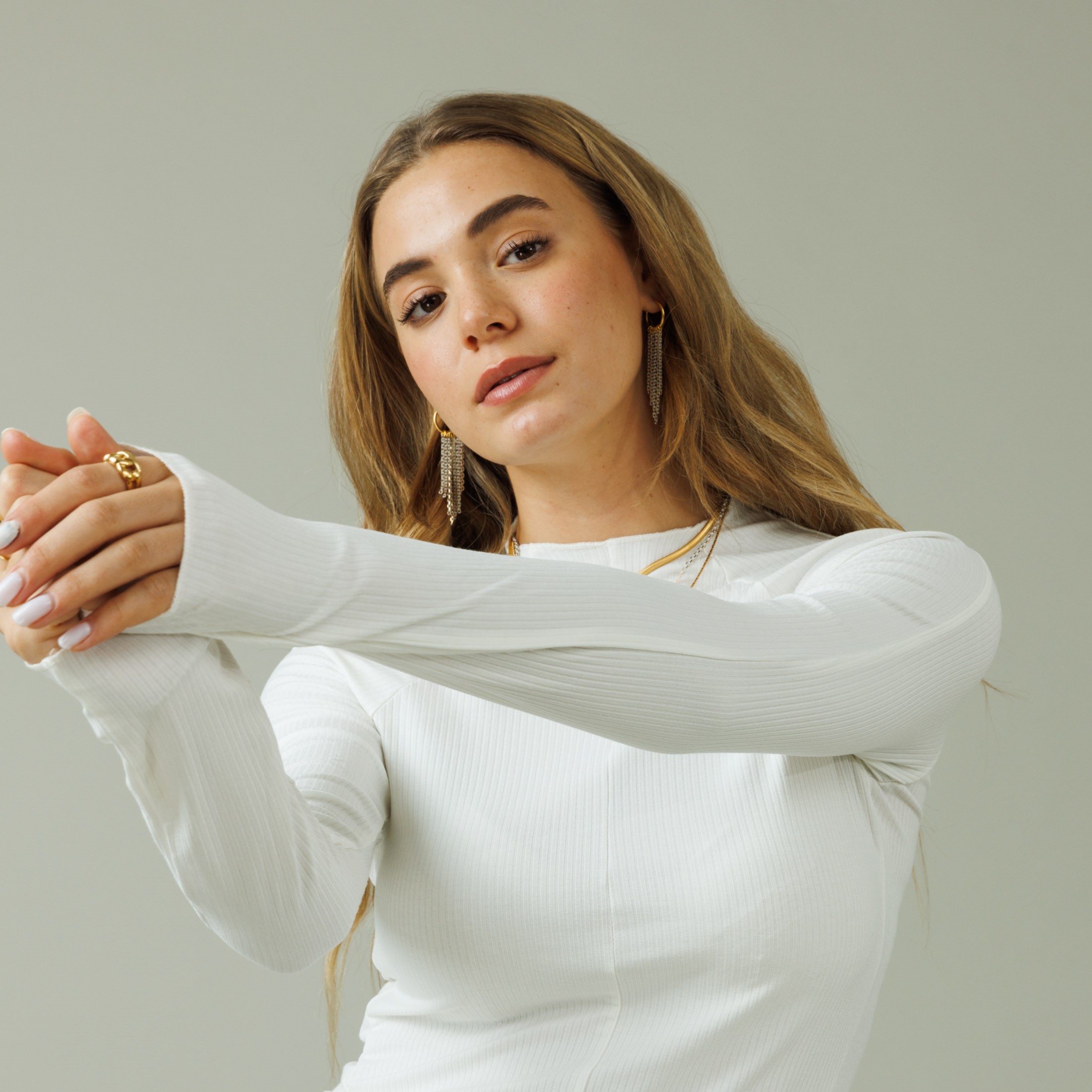עגילי חישוק ועליהם תלויות שרשראות. עגילים במראה שיקי, עכשווי ובעל נוכחות.