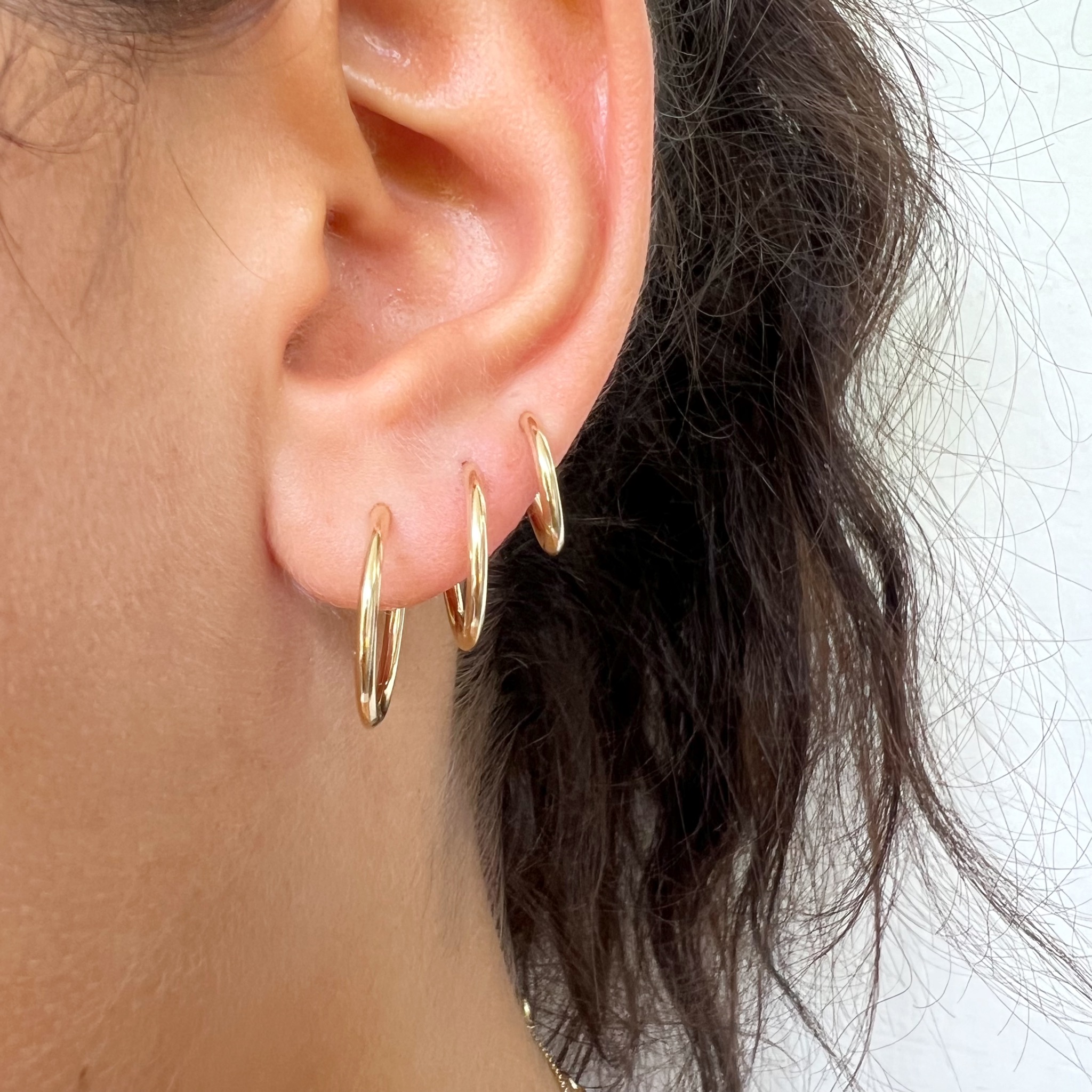 עגילי חישוק קלאסים עשויים זהב מלא 14 קראט עם סגירה חזקה ובטיחותית. פתיחת העגיל נעשית עם הזזה לצד
