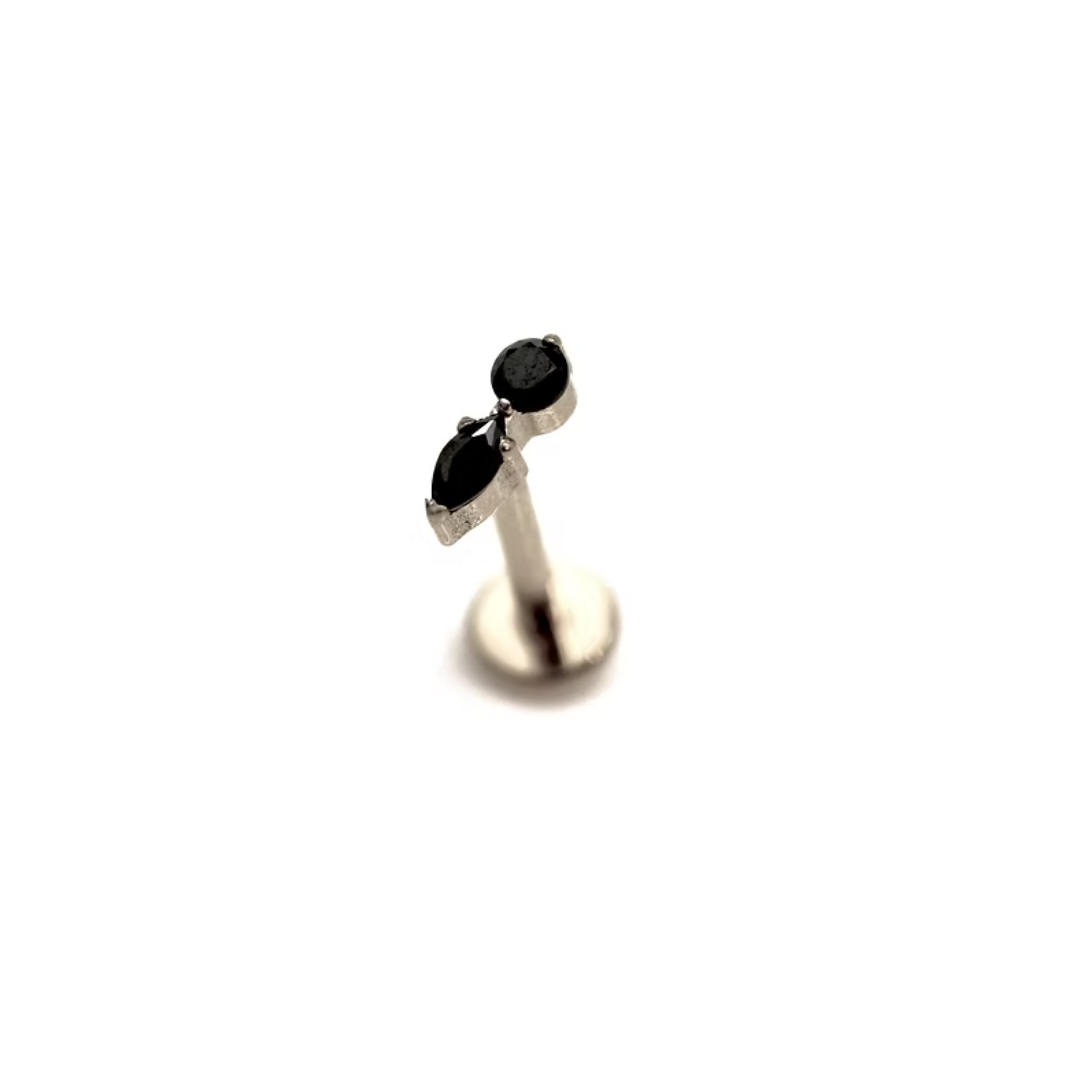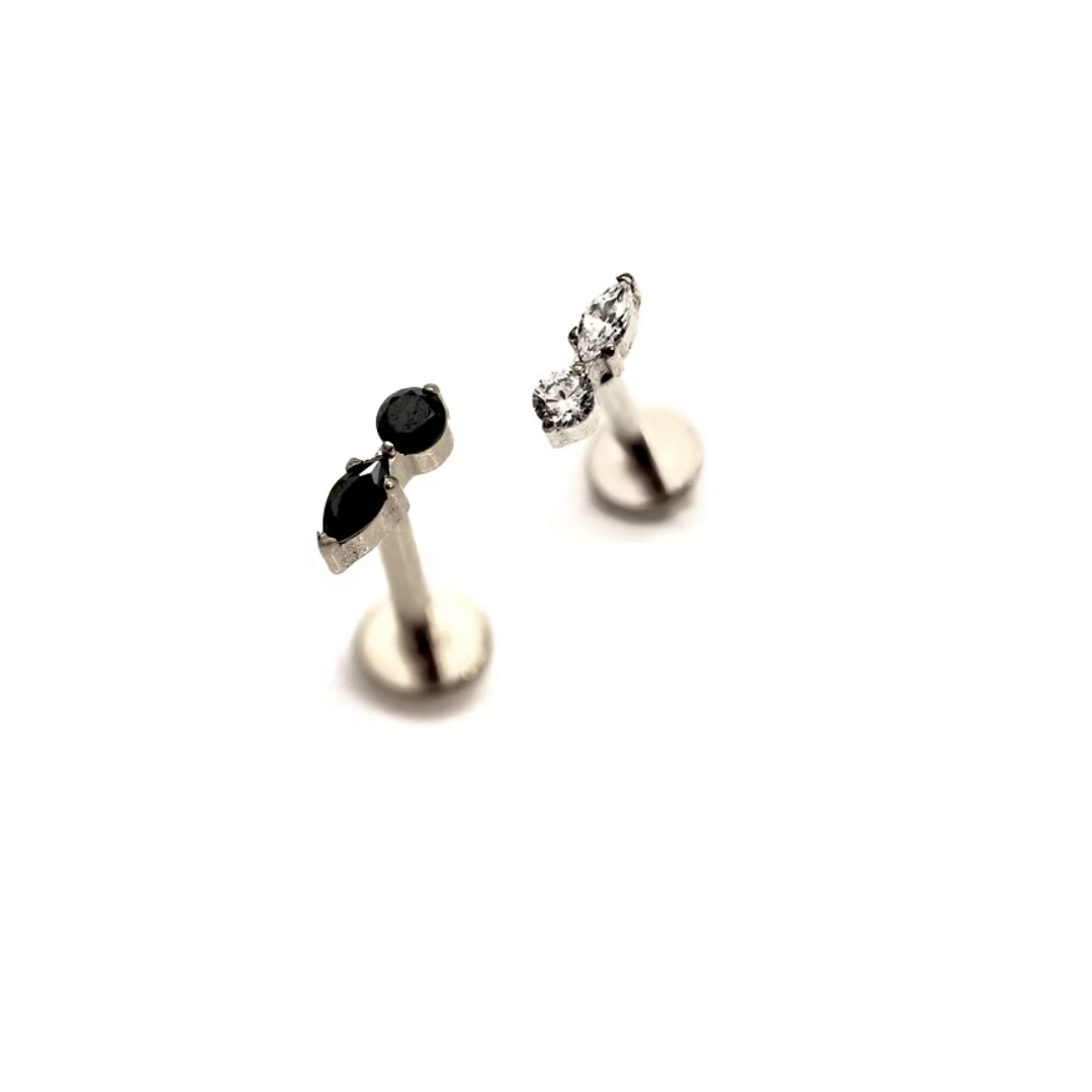 עגיל פירסינג מקסים עשוי טיטניום – היפואלרגני, עמיד ואיכותי משובץ שתי אבני קריסטל לבנות או שחורות.