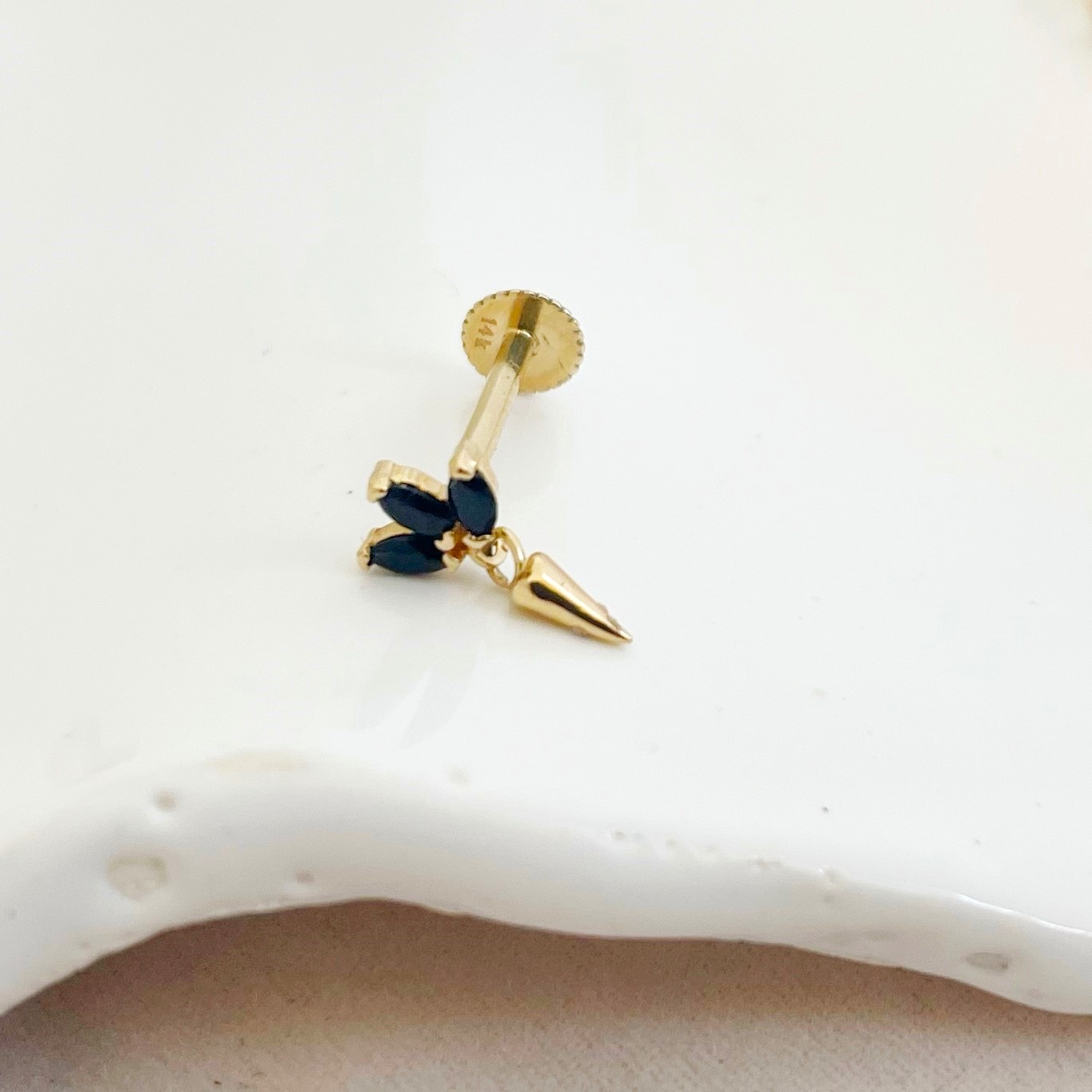 עגיל פירסינג מקסים עשוי זהב מלא 14 קראט בצורת פרח הלוטוס משובץ בשלוש אבני קריסטל שחורות משגעות, משולבות עם שפיץ קטן.