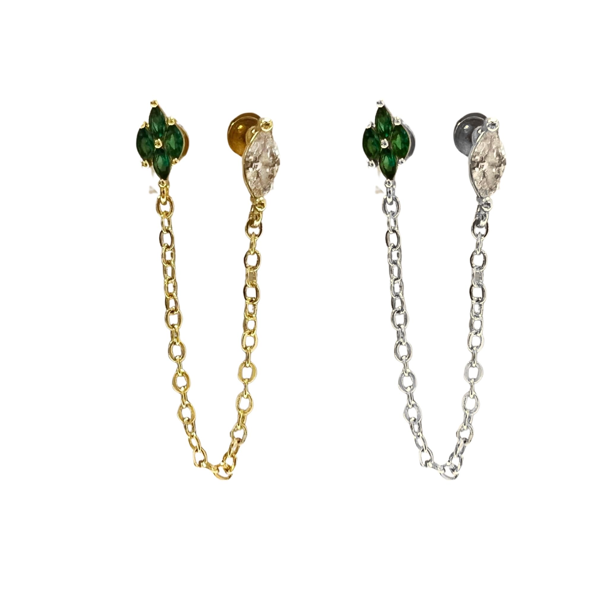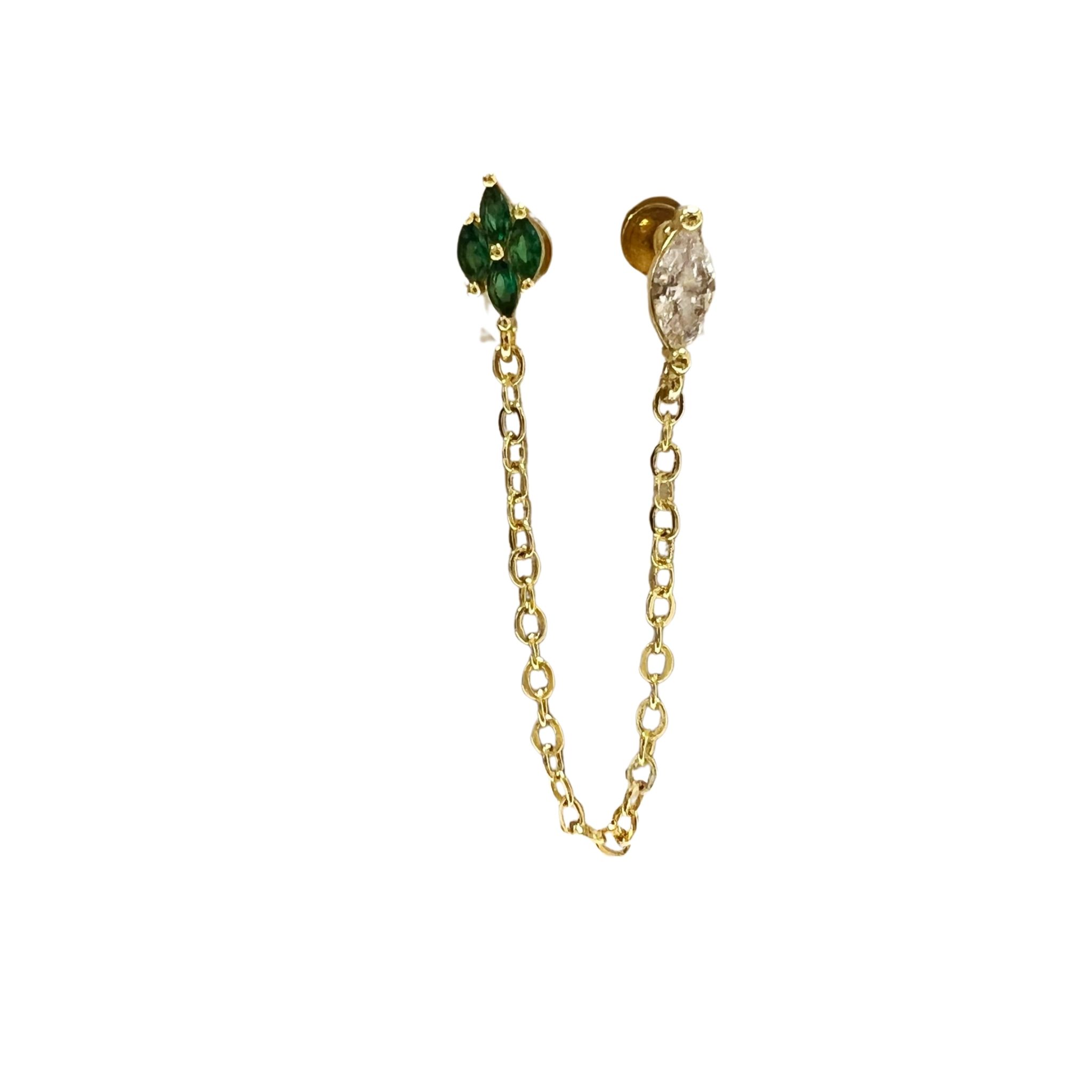 עגיל משגע בעיצוב מיוחד מתאים לשני חורים באוזן. שיבוץ עדין של עלים בצבע ירוק אמרלד ומצד שני אבן קריסטל מרהיבה, את שניהם מחברת שרשרת עדינה.
