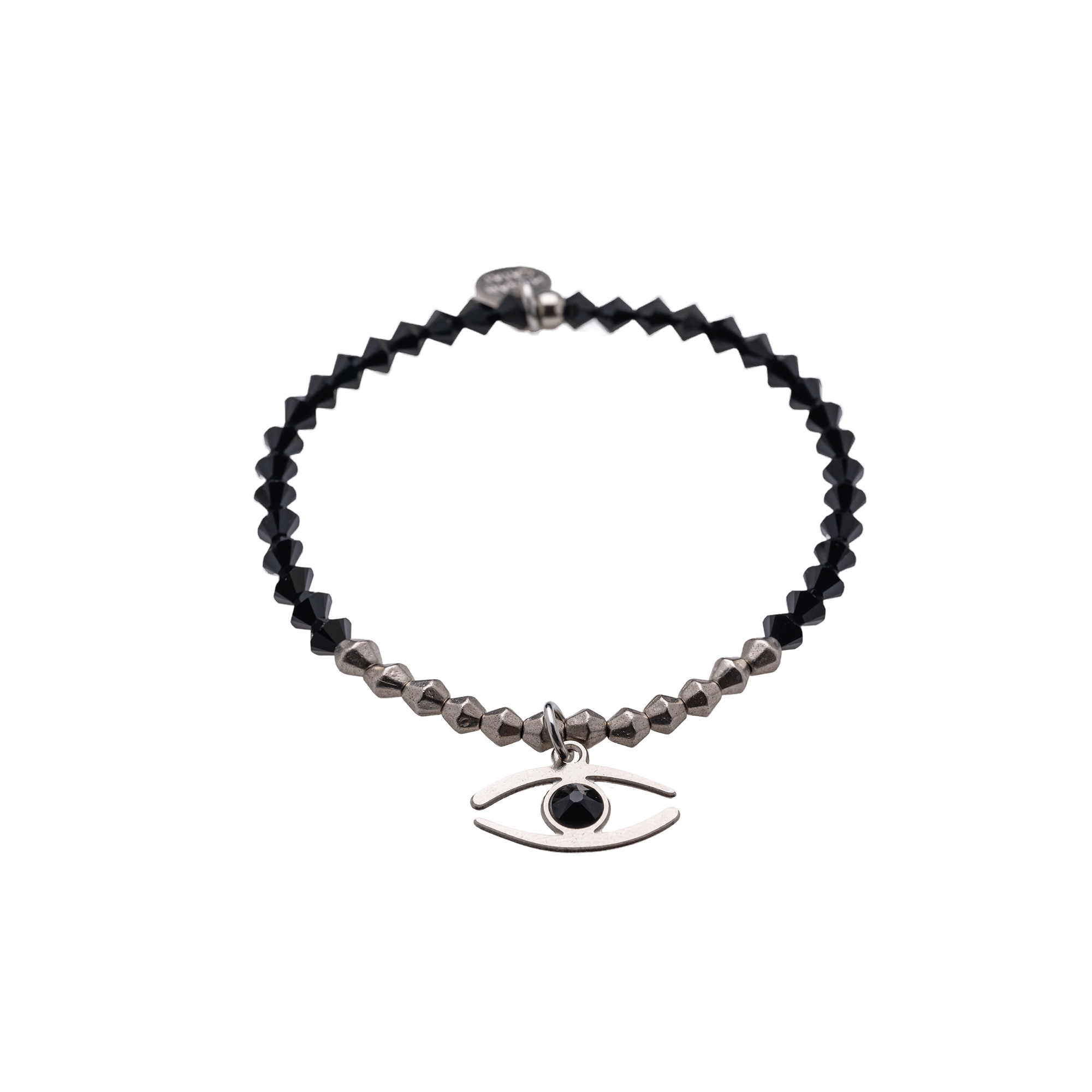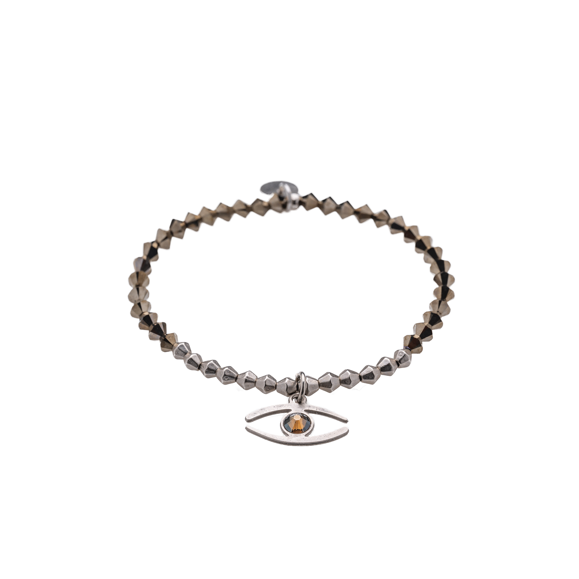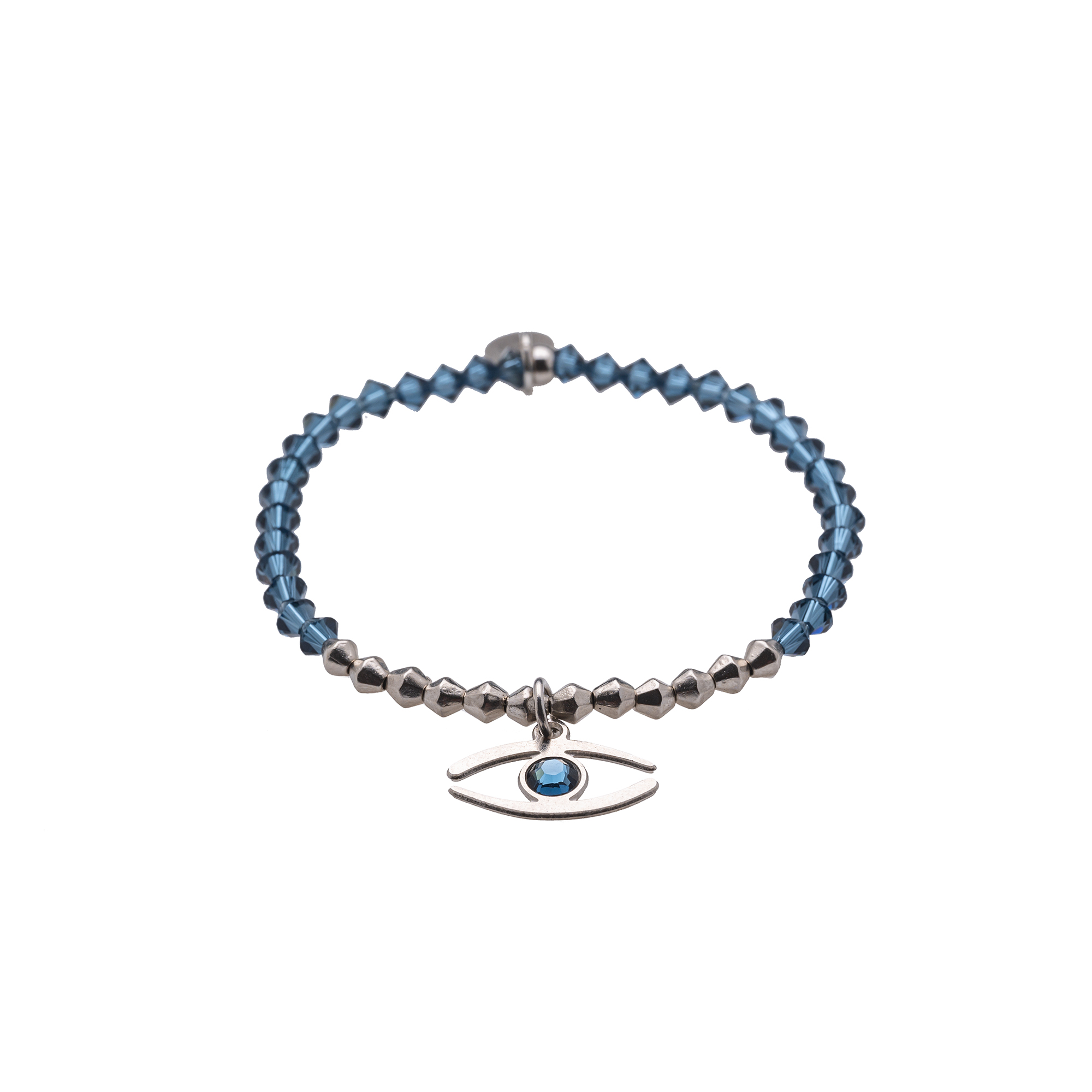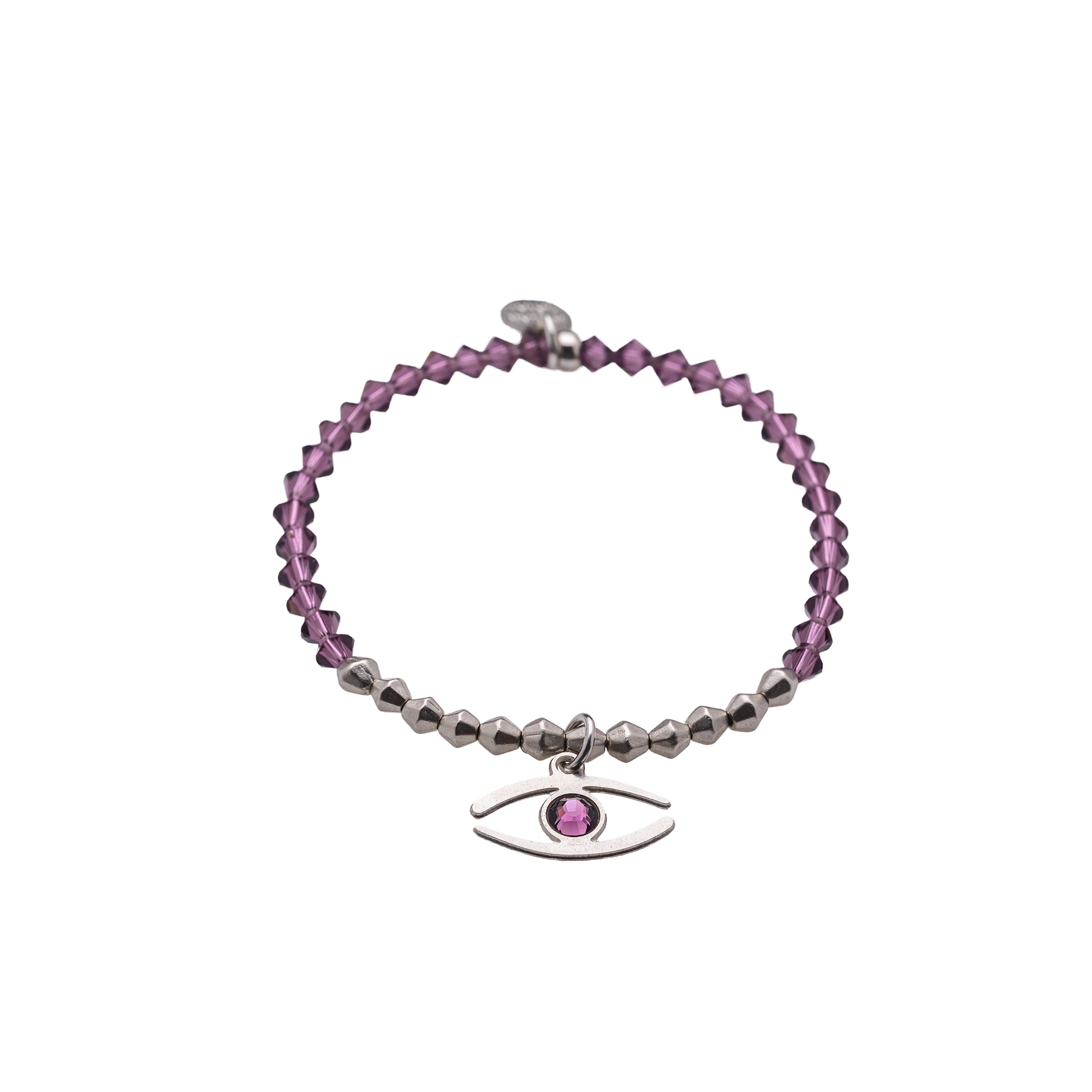 צמיד עשויי עם אבני סברובסקי בגוון סגול/ כחול/ ברונזה/ שחור משולבות- חרוזים מתכת המצופים כסף עם תליון בצורת עין בגודל 1.3 ס”מ עדין ומקסים בציפוי כסוף.
