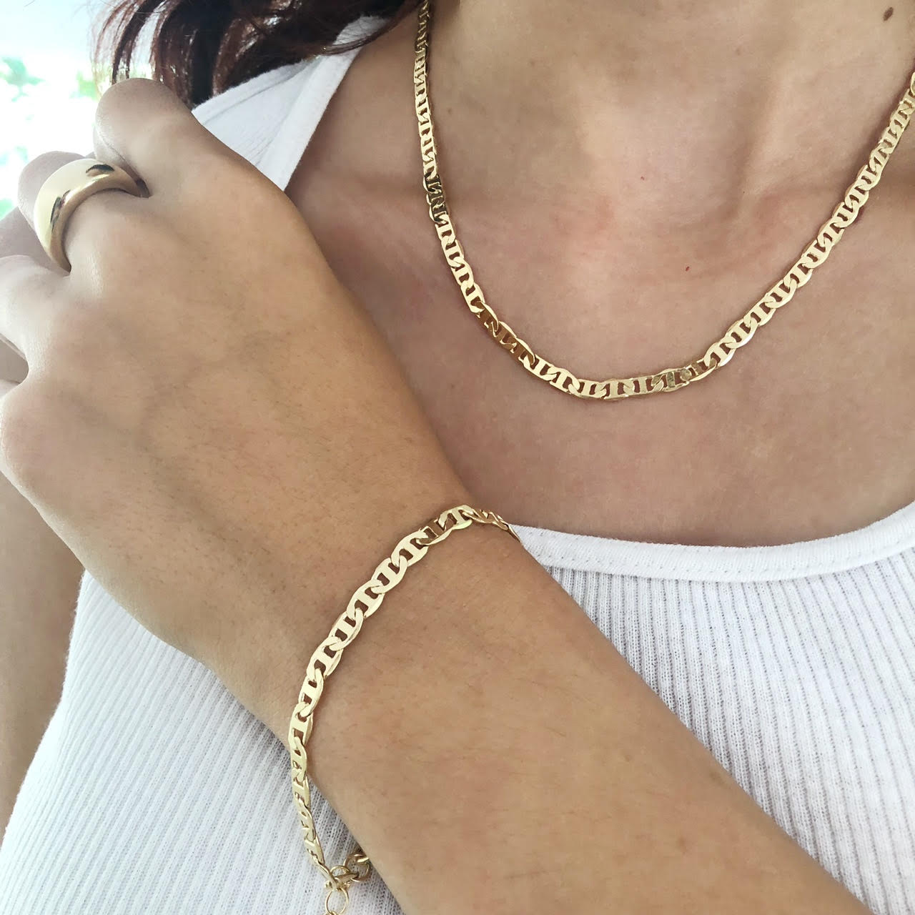 הצמיד עשוי שרשרת גורמט עשויה מתכת בציפוי זהב 24 קראט בעובי 2 מיקרון עמיד ואיכותי.