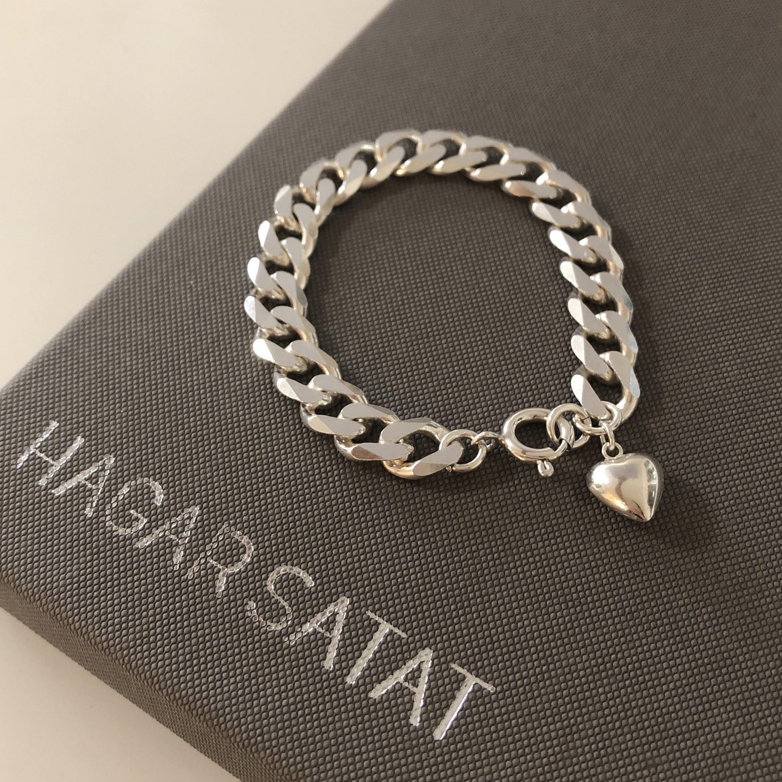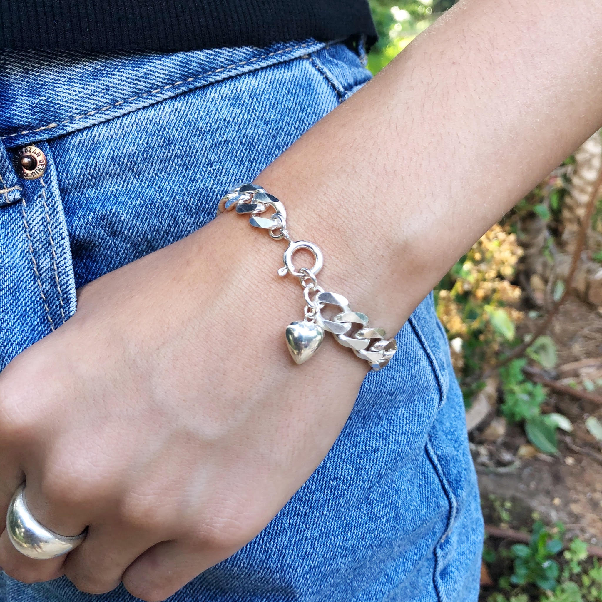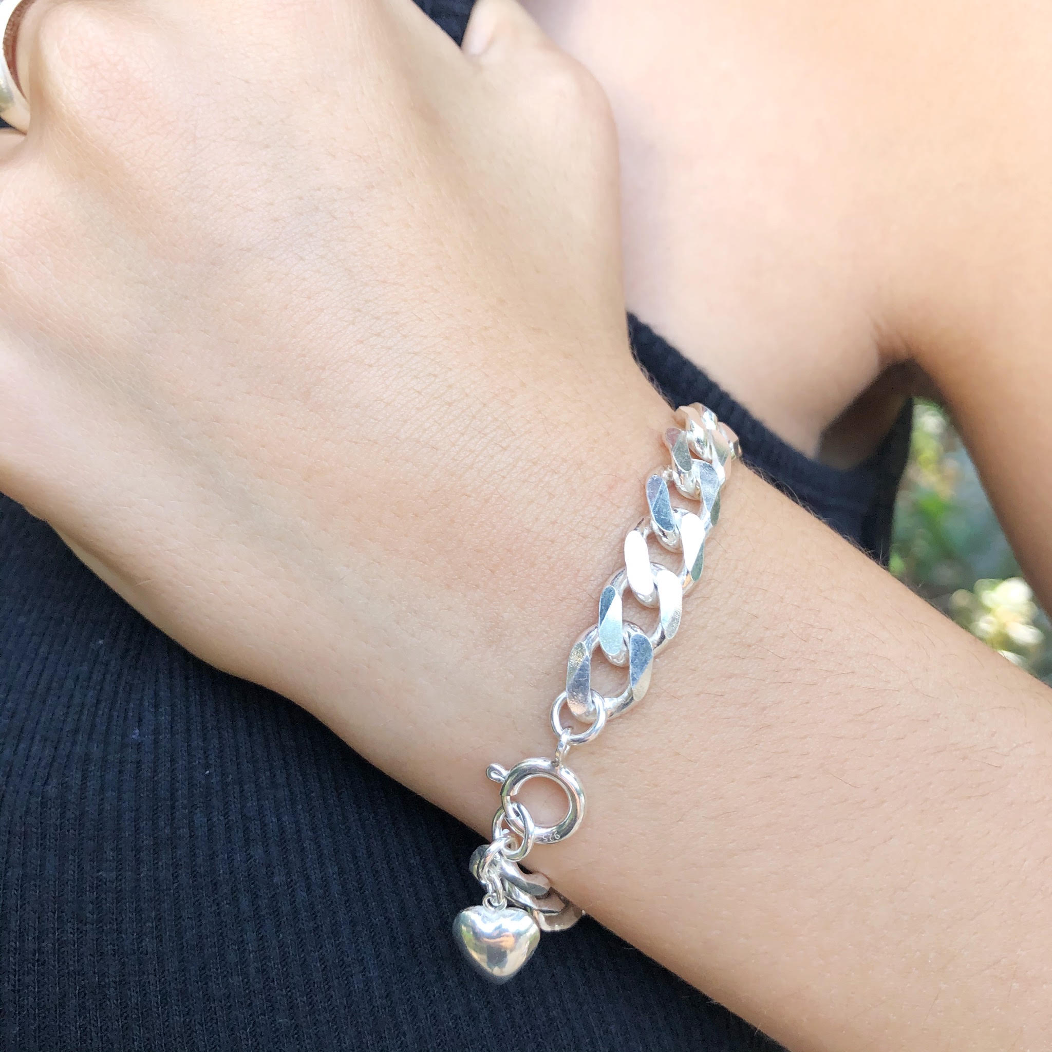הצמיד עשוי שרשרת גורמט מכסף אמיתי גדולה ומרשימה משולבת עם תליון לב מקסים.