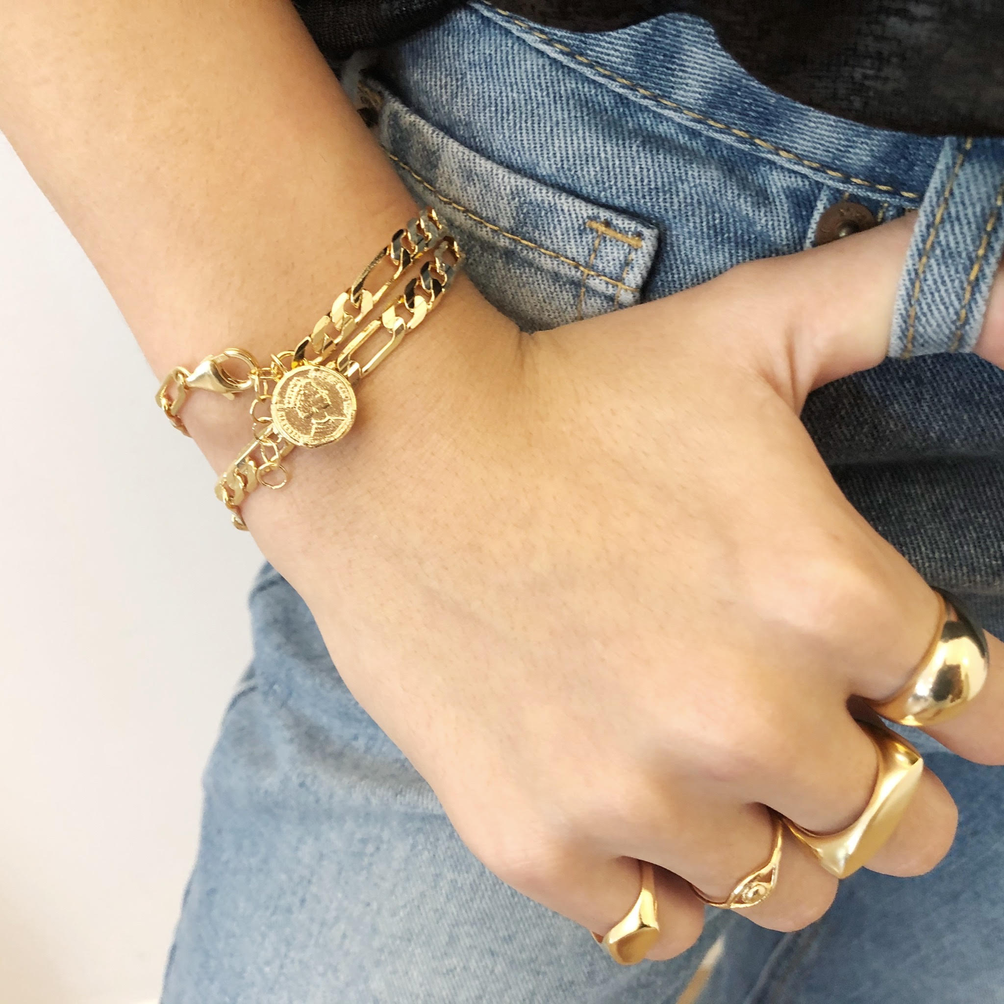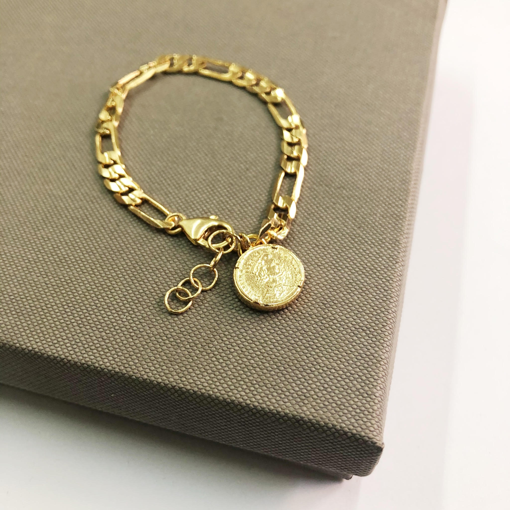 הצמיד עשוי שרשרת גורמט בציפוי זהב 24 קראט בעובי 2 מיקרון עמיד ואיכותי. מרשימה עם חיתוך מיוחד, משולבת עם תליון מטבע מרשים בסגנון עתיק.
