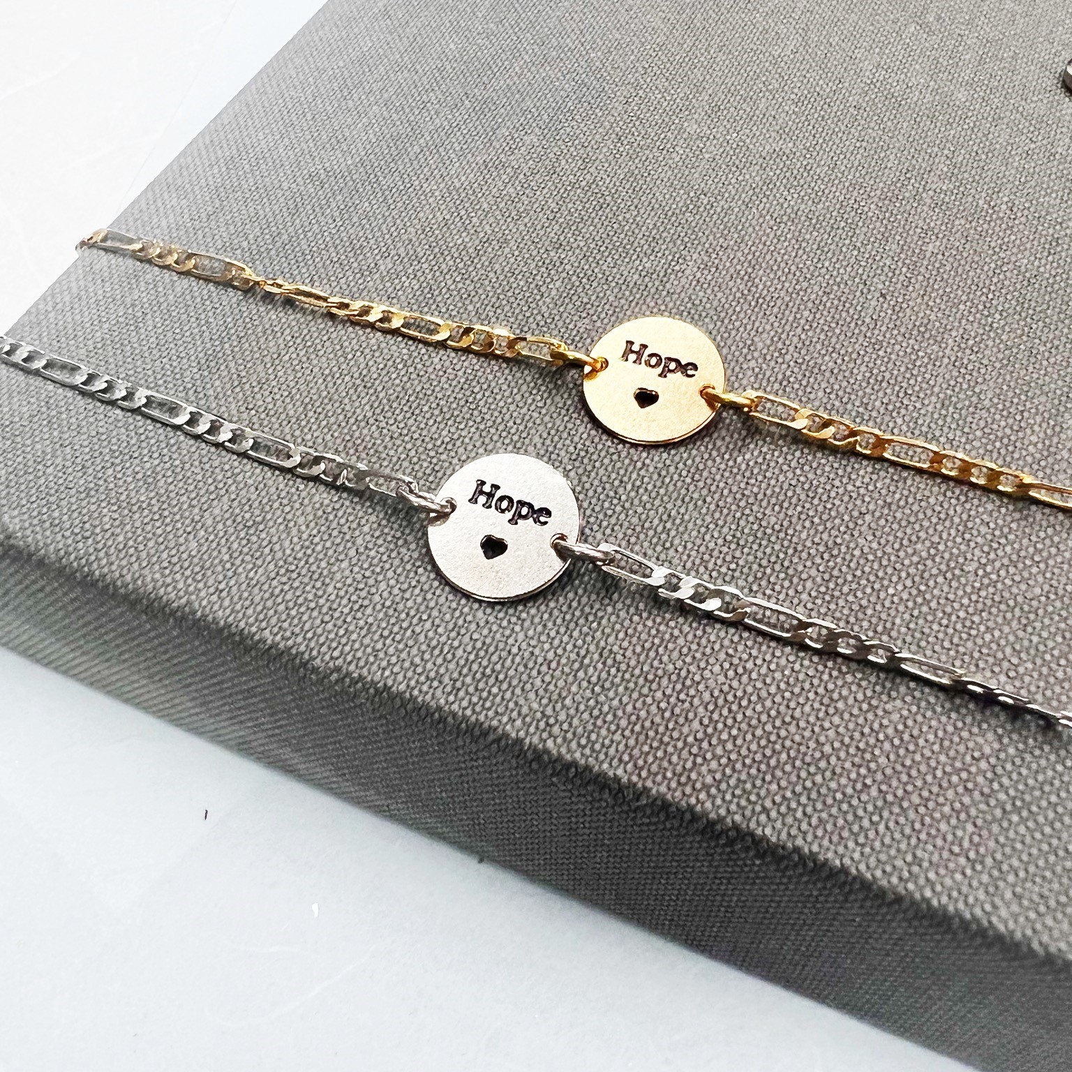 הצמיד עשוי שרשרת גורמט עדינה משולבות עם דסקית מטבע בציפוי זהב או בציפוי כסוף עליה חרוטה המילה Hope .