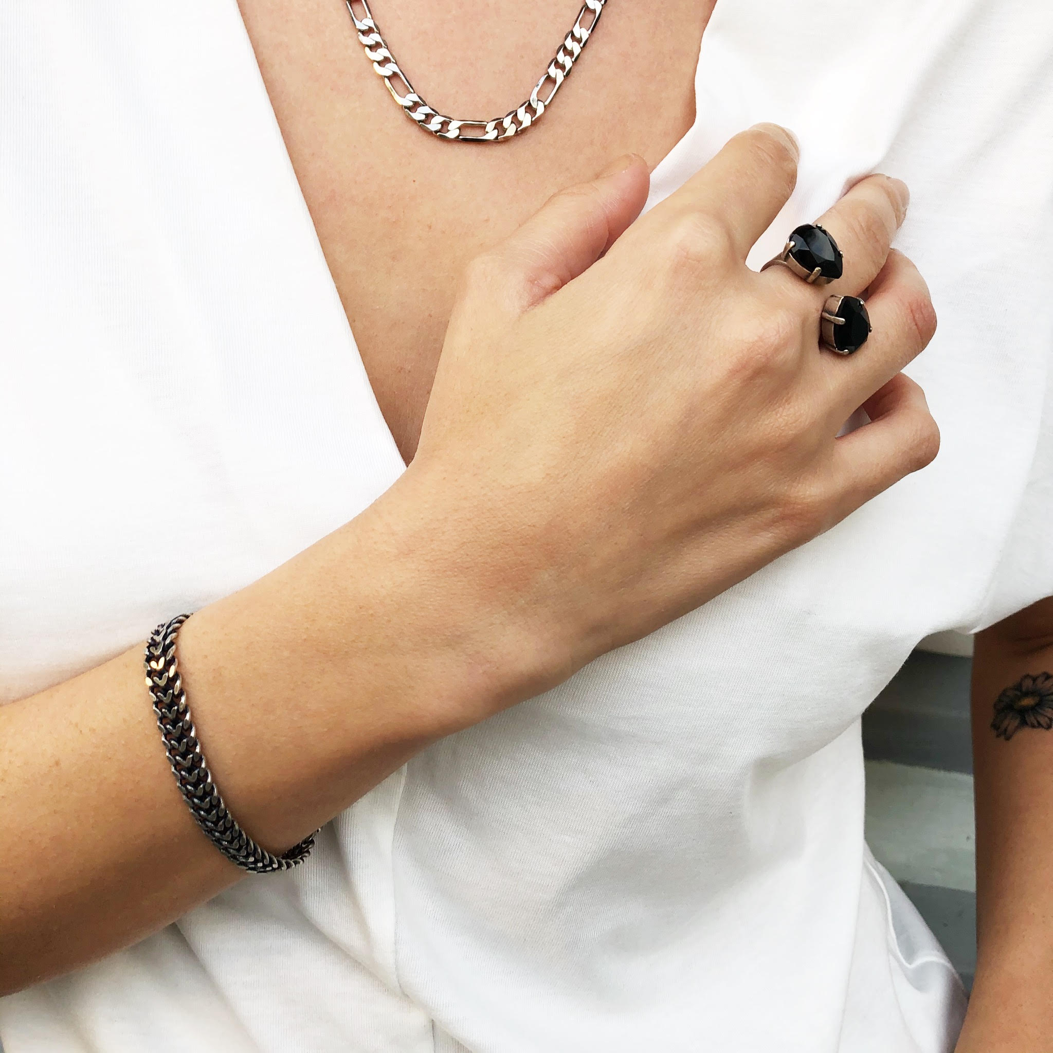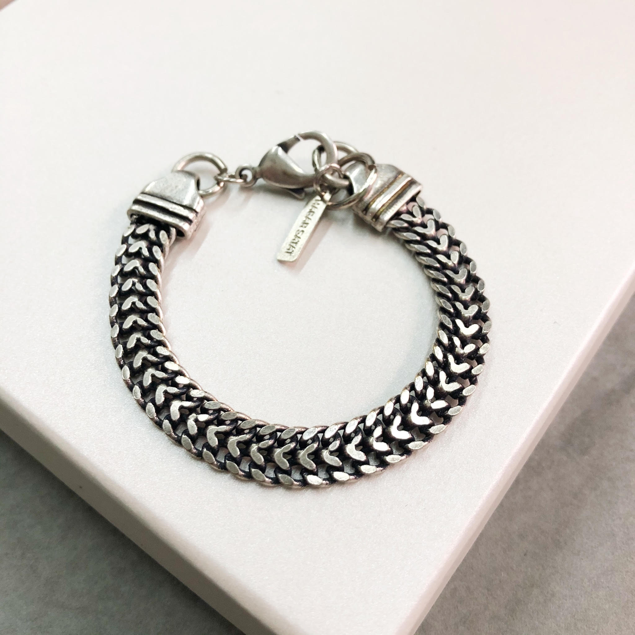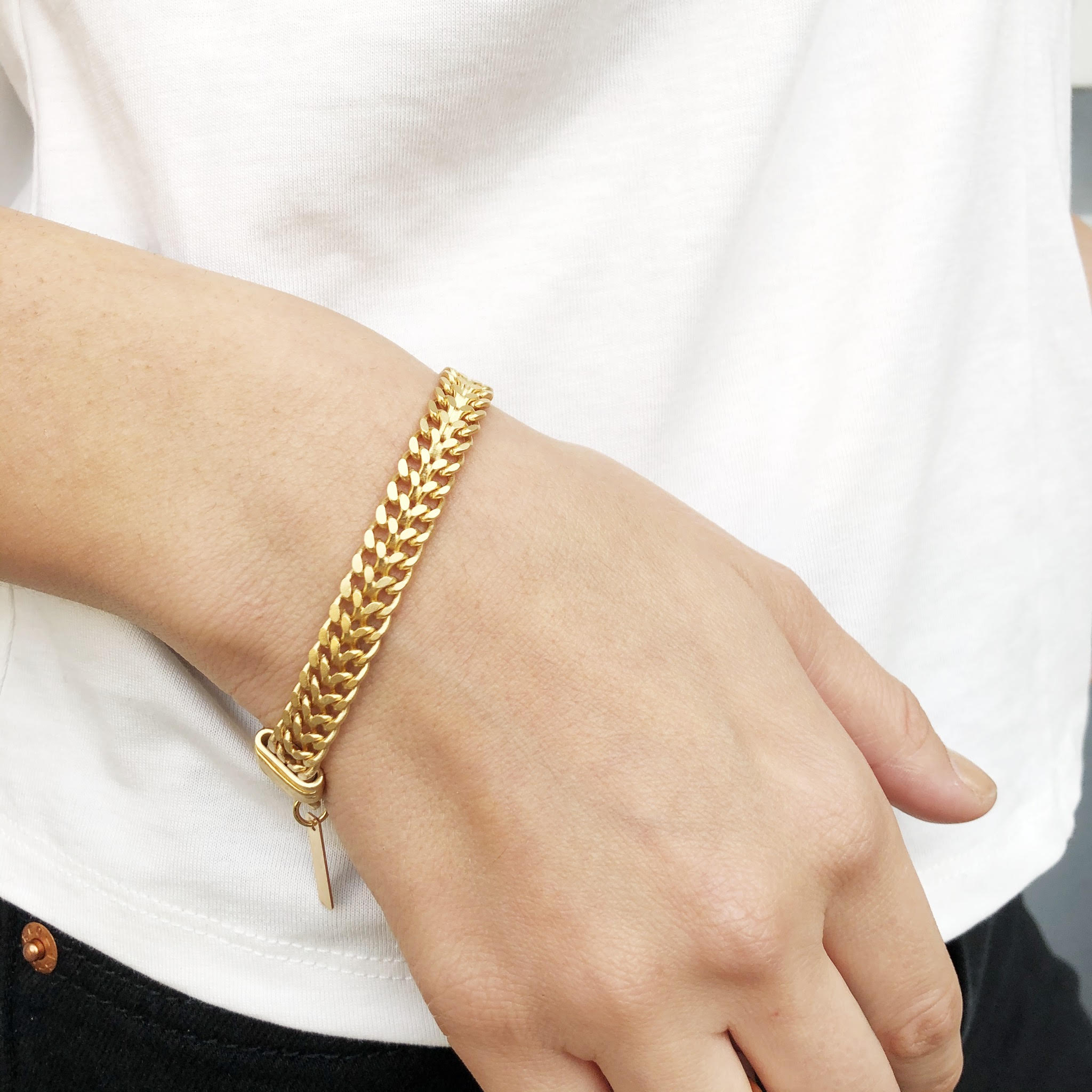 צמיד חוליות גורמט מיוחדות עם סוגר תואם, בציפוי זהב 24 קראט בגוון מט או בציפוי כסוף באותו גוון.