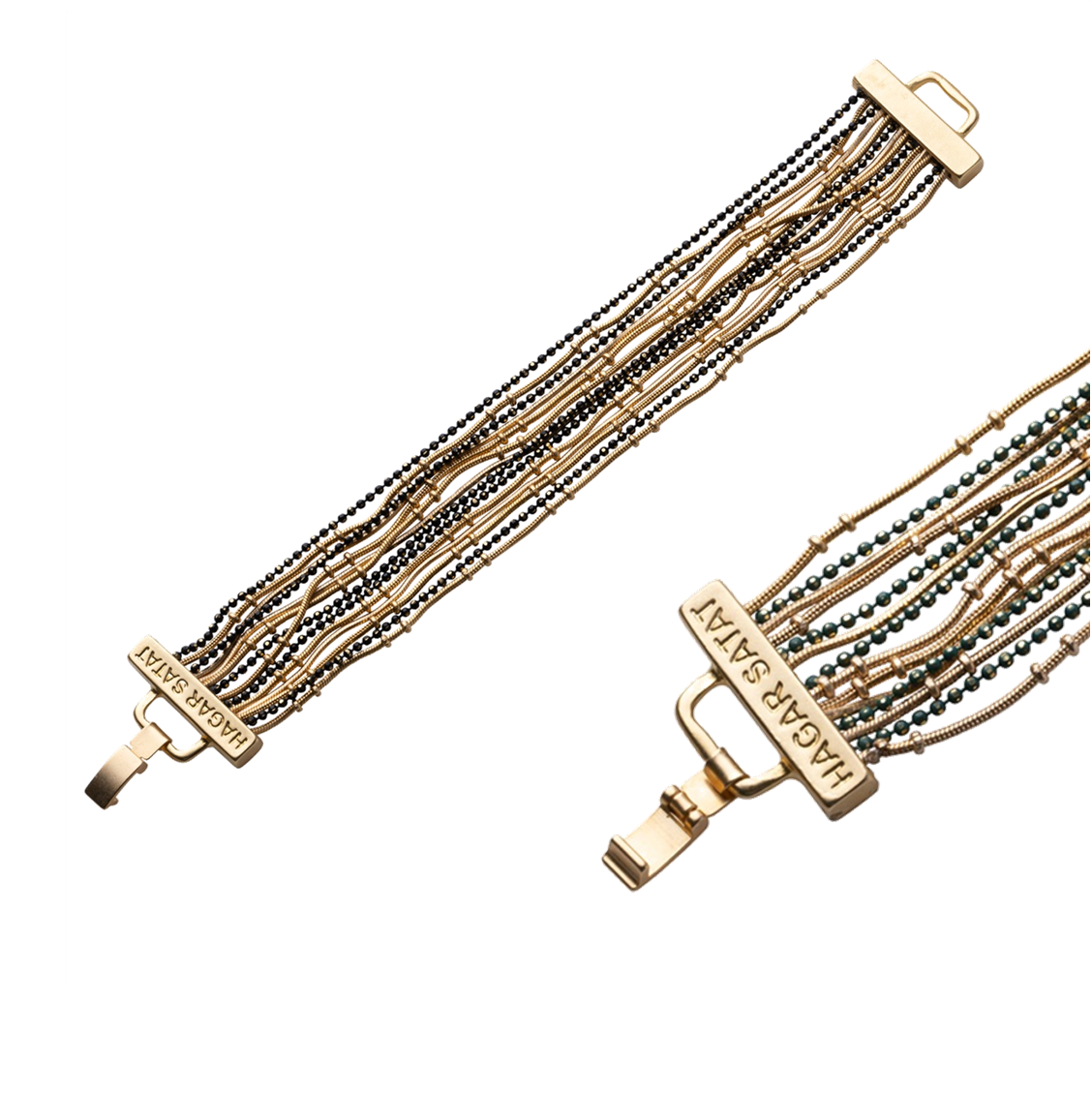 הצמיד עשוי מקבץ שרשראות עדינות במגוון בציפוי זהב 24 קראט משולבות עם שרשרת צבעונית (שחור או ירוק לבחירה), עם סוגר מרשים בציפוי זהב 24 קראט.