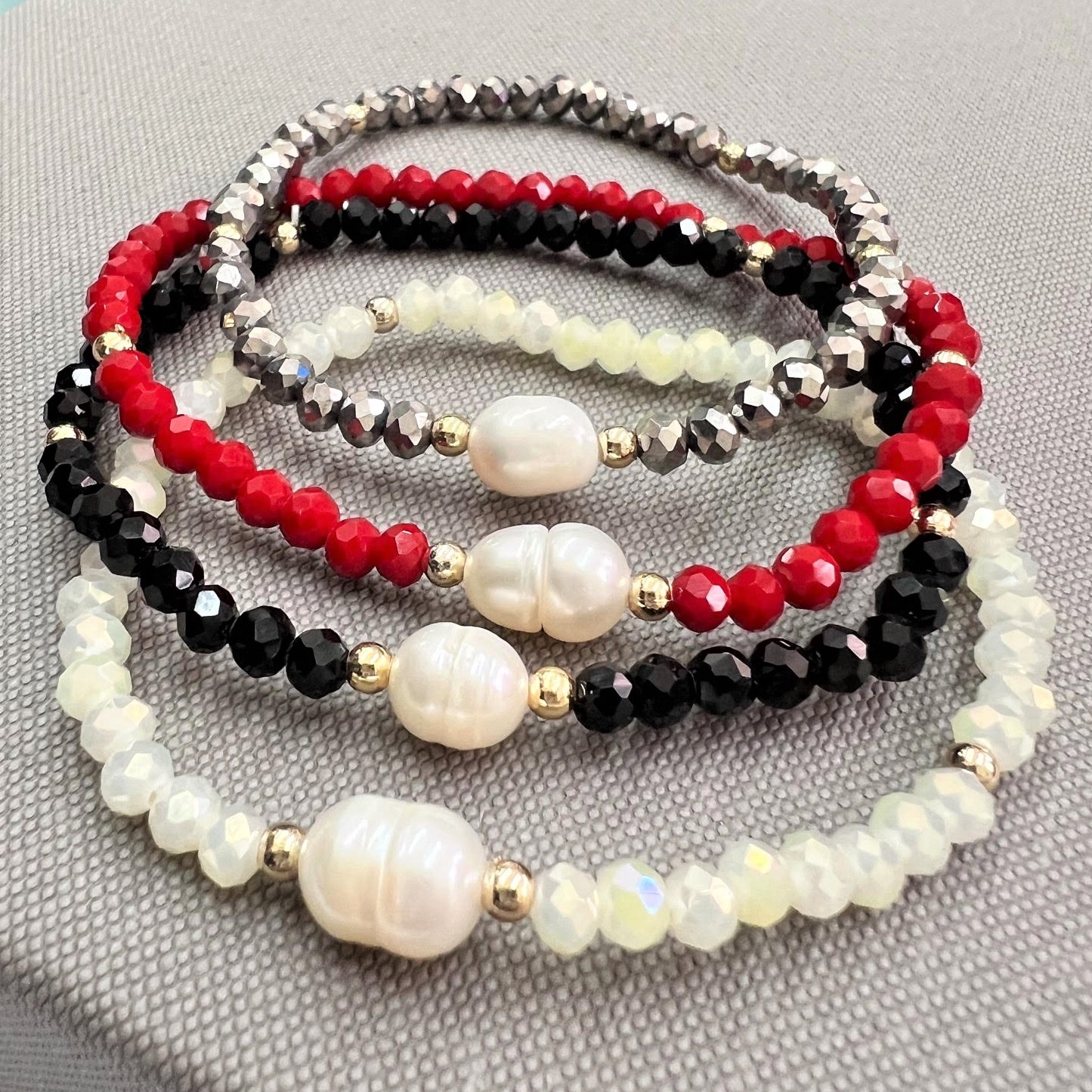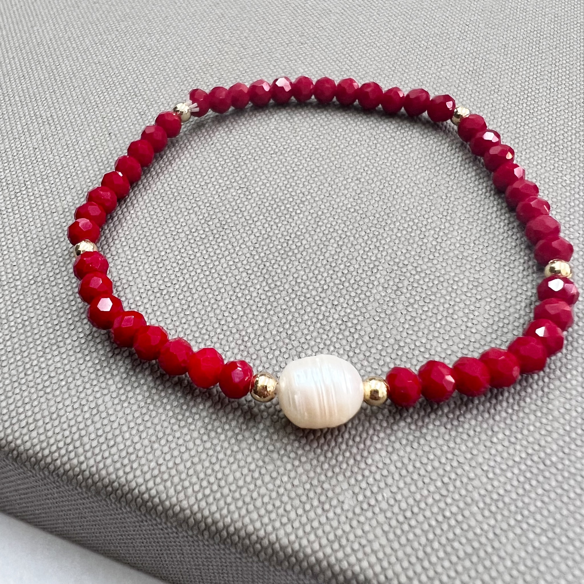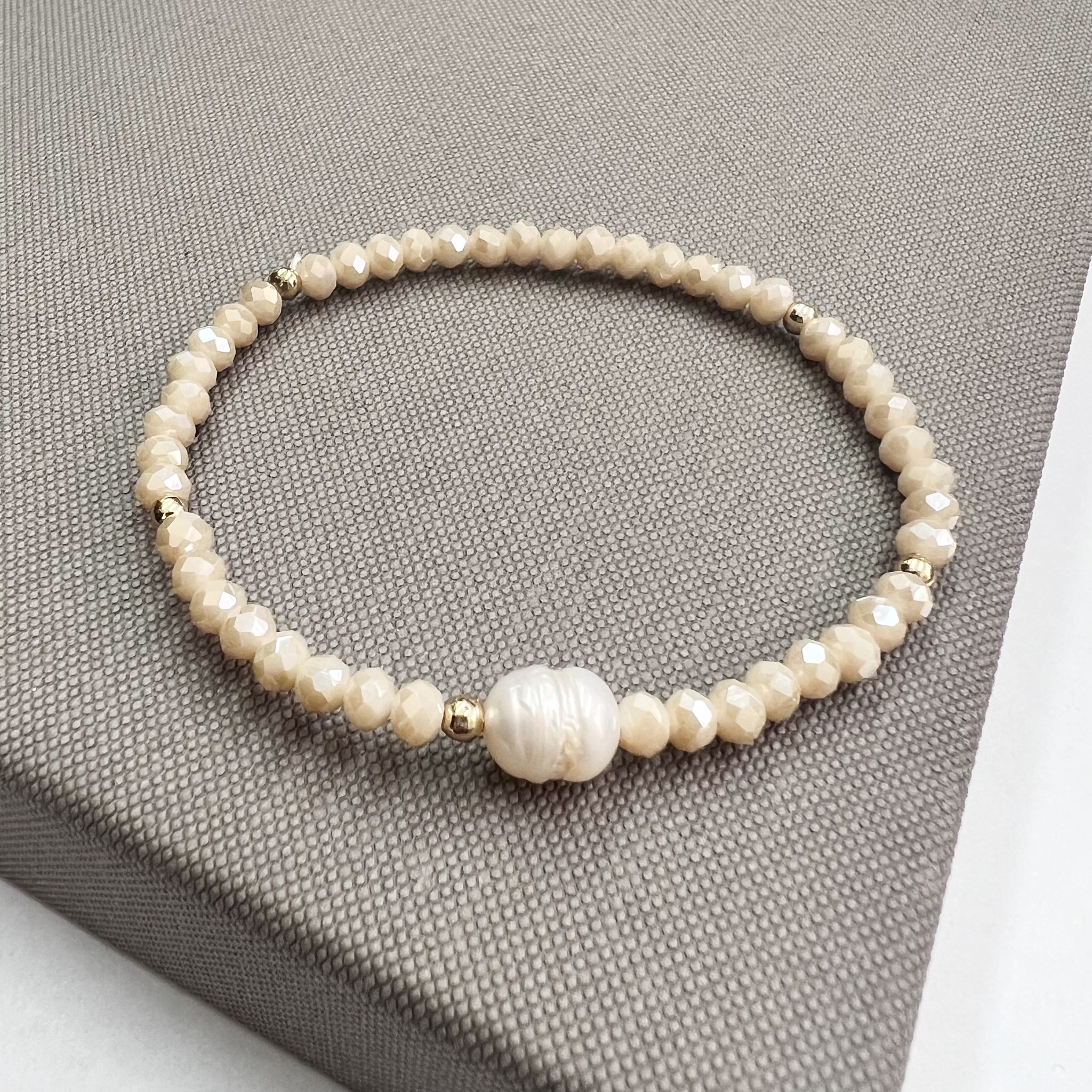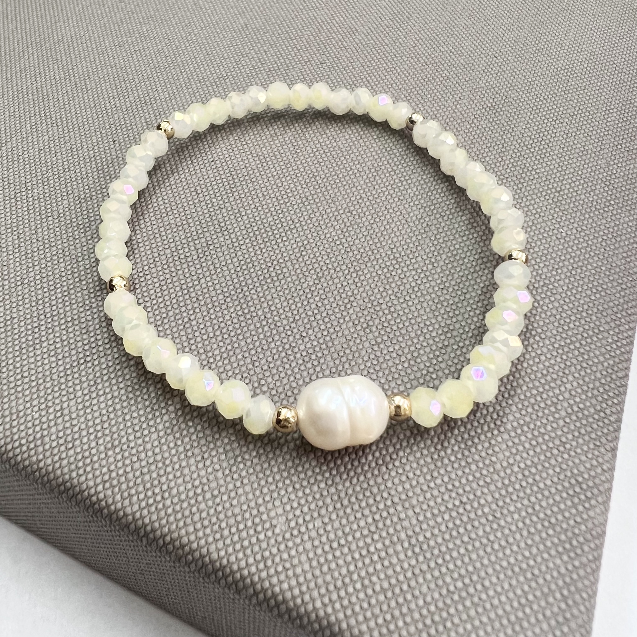 הצמיד עשוי חרוזי קריסטל במבחר צבעים מושחלים על חוט סיליקון עמיד ואיכותי משולבים עם פנינה אמיתית וחרוזים קטנים בציפוי זהב 24 קראט.