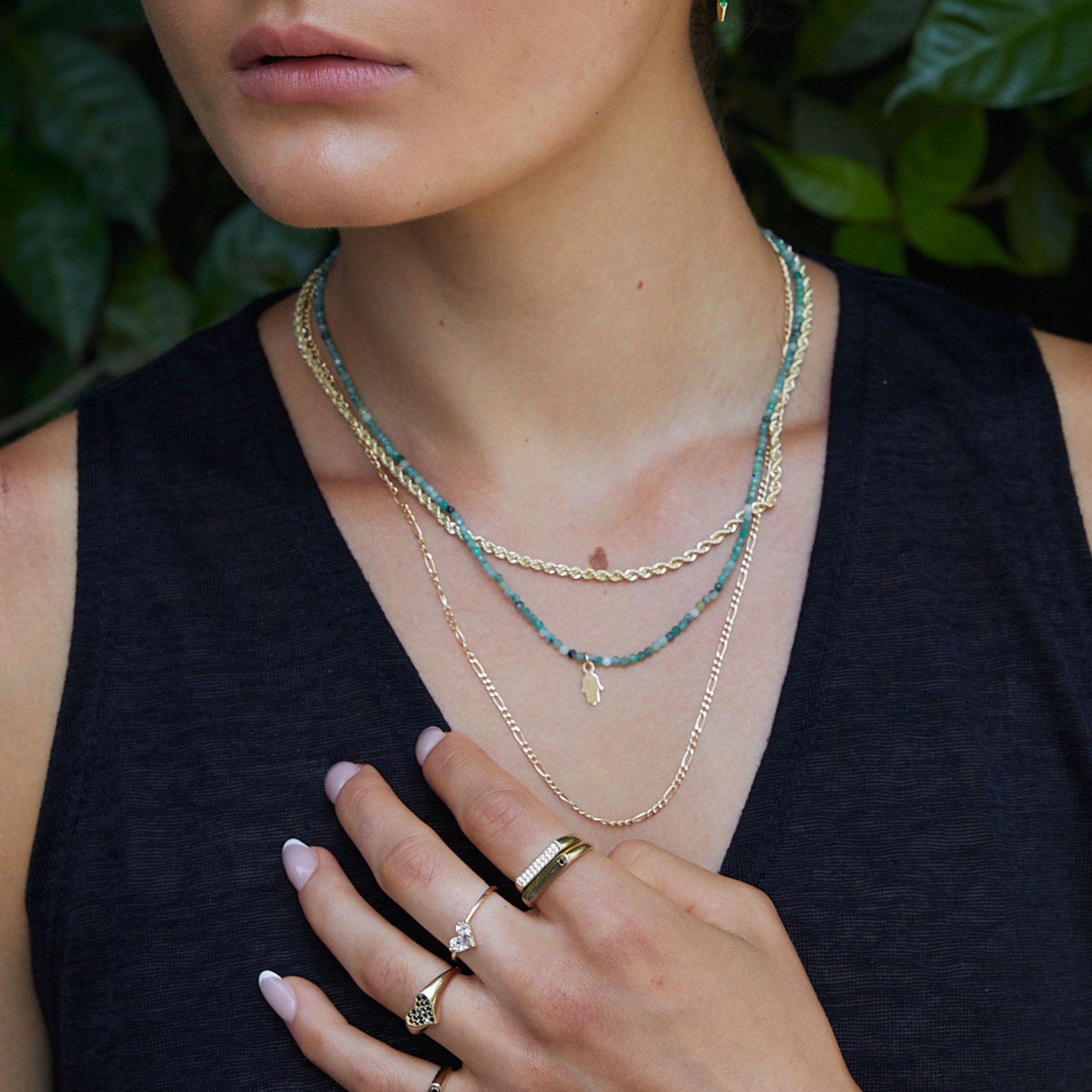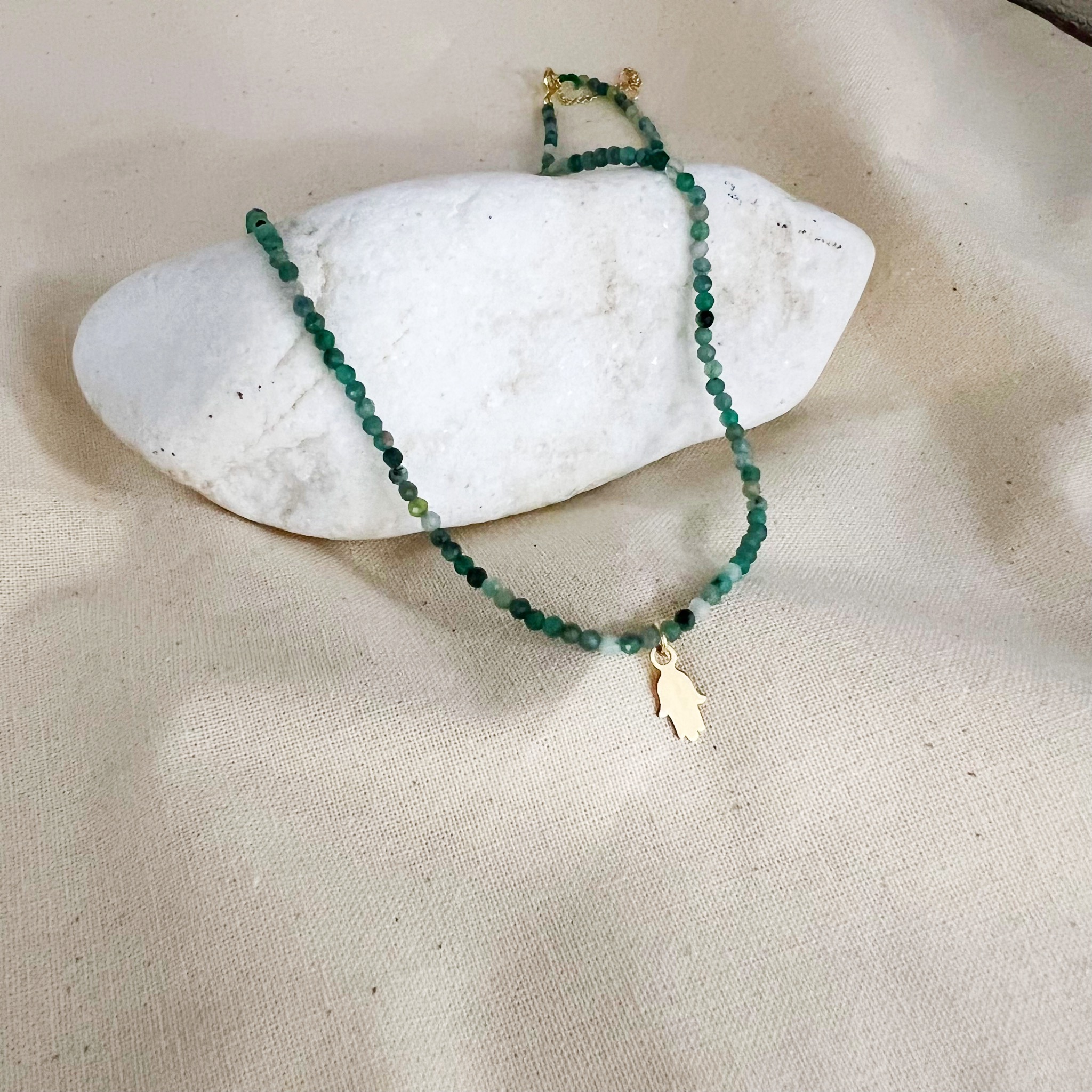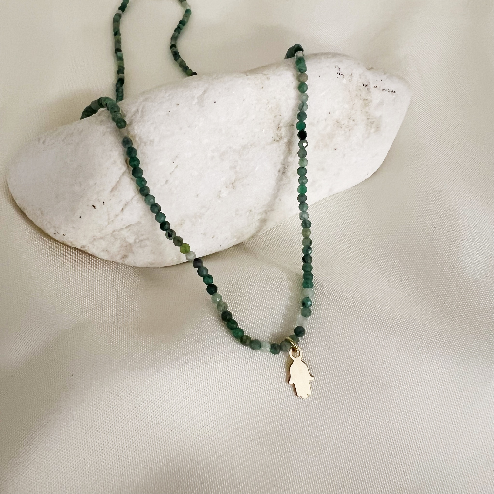 שרשרת מלאה בשיק עדינה אבל נוכחת עשויה אבני אמרלד אמיתיות מדהימות מלאות במזל טוב משולב עם תליון חמסה עדין עשוי זהב 14 קראט.