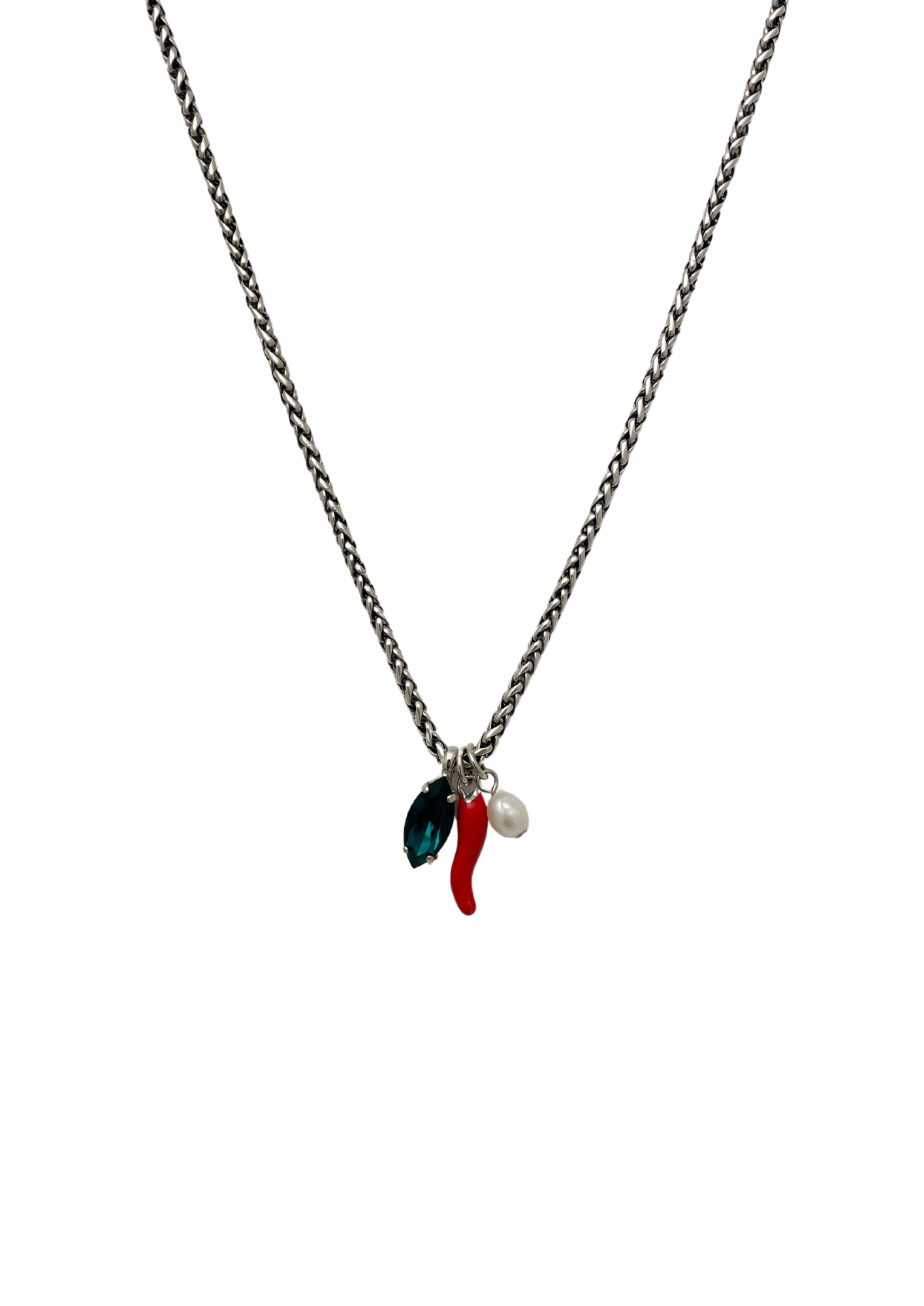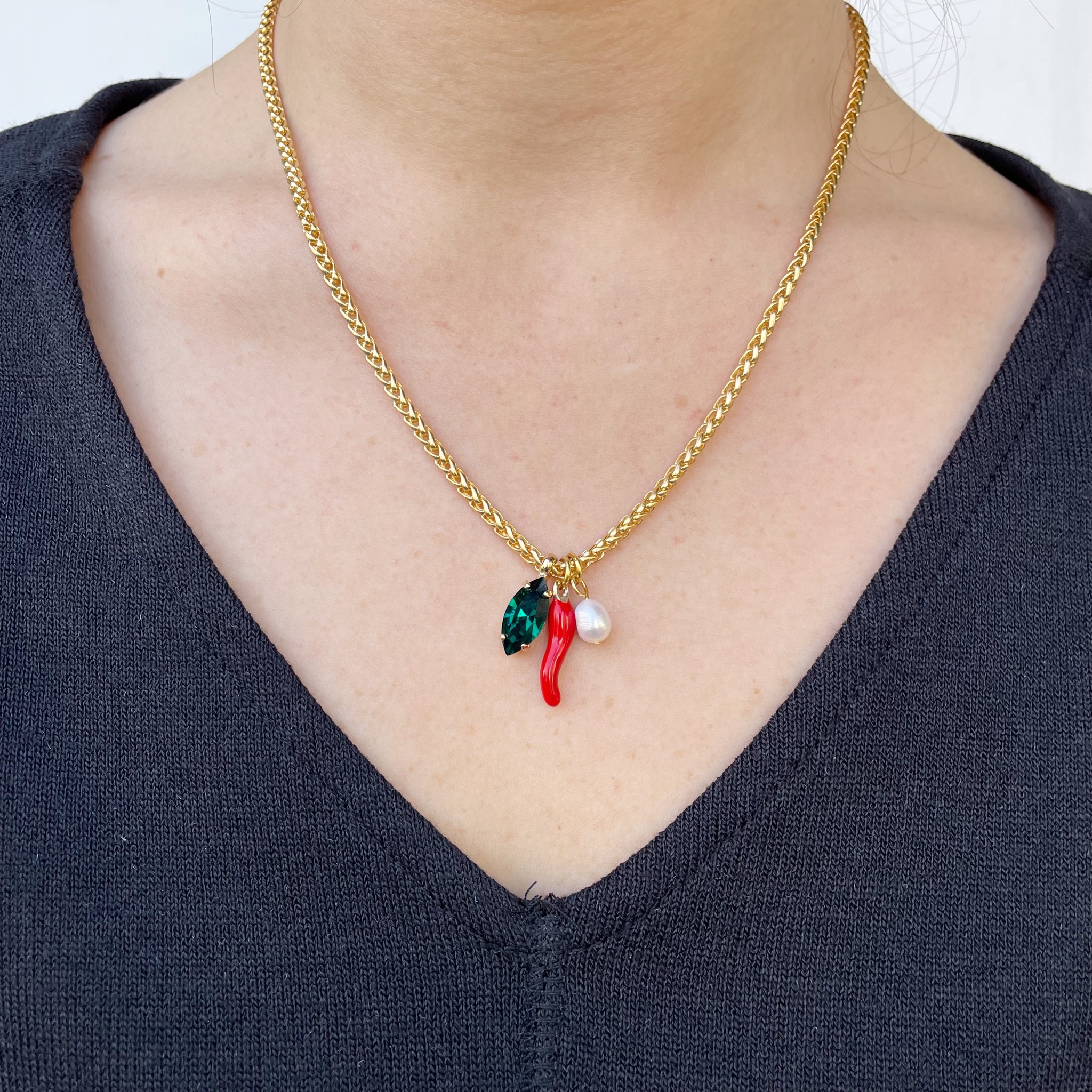 שרשרת בסגנון חבל עם שלושה תליונים מקסימים: פנינה טבעית, פלפל אדום ואבן סברובסקי ירוקה.