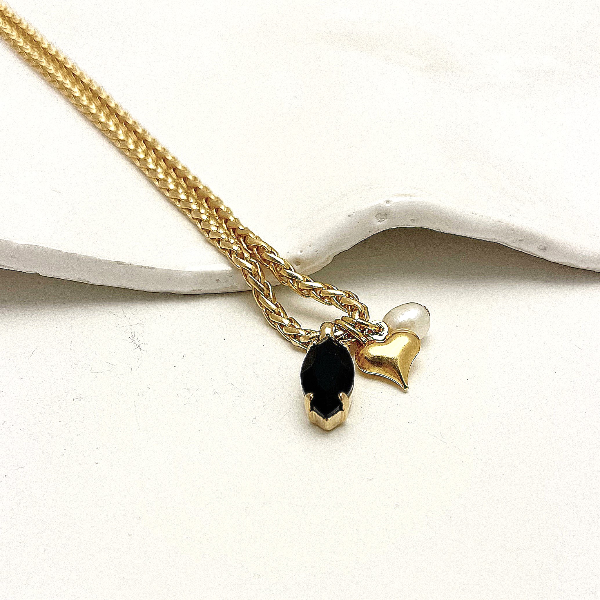 שרשרת בסגנון חבל עם שלושה תליונים מקסימים: לב קטן, פנינה טבעית ואבן סברובסקי שחורה.