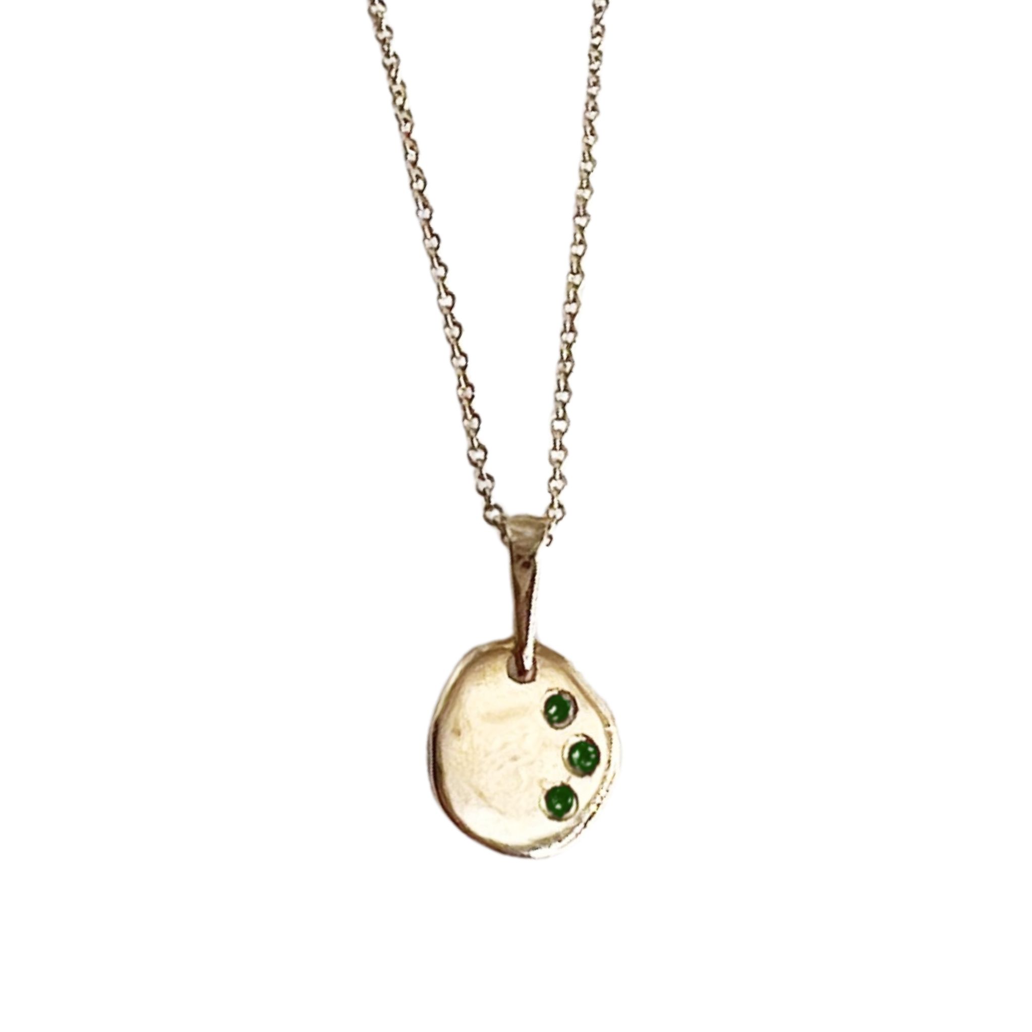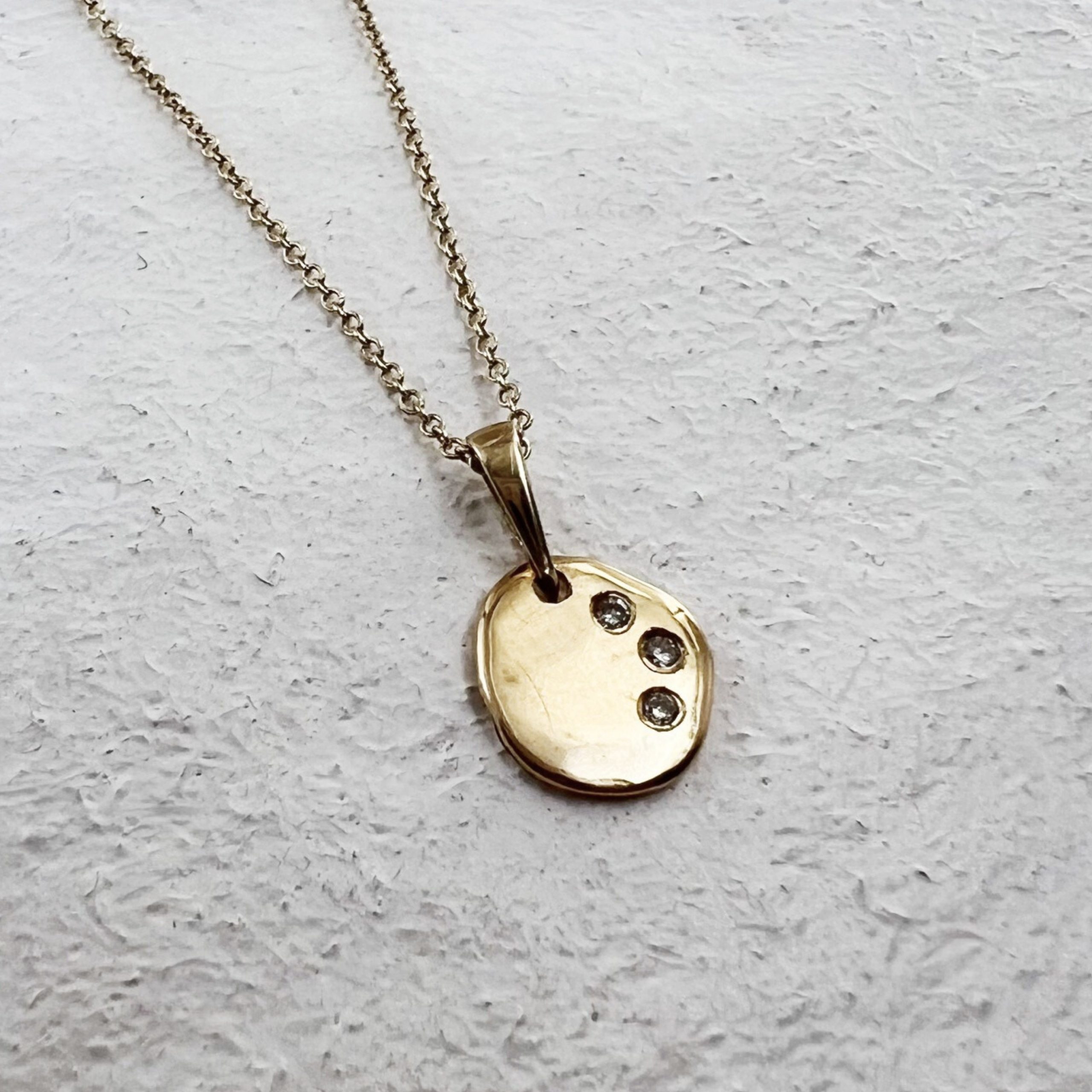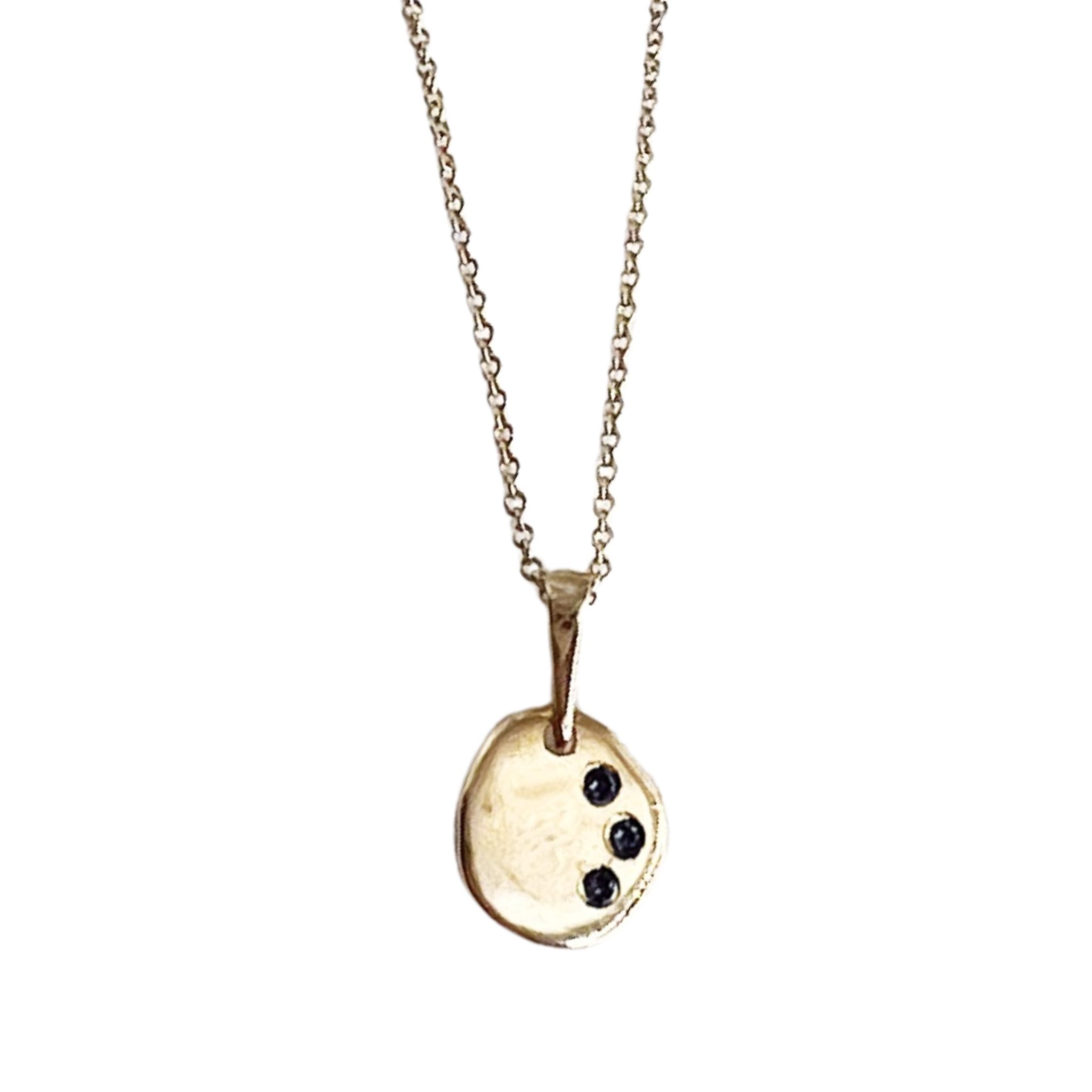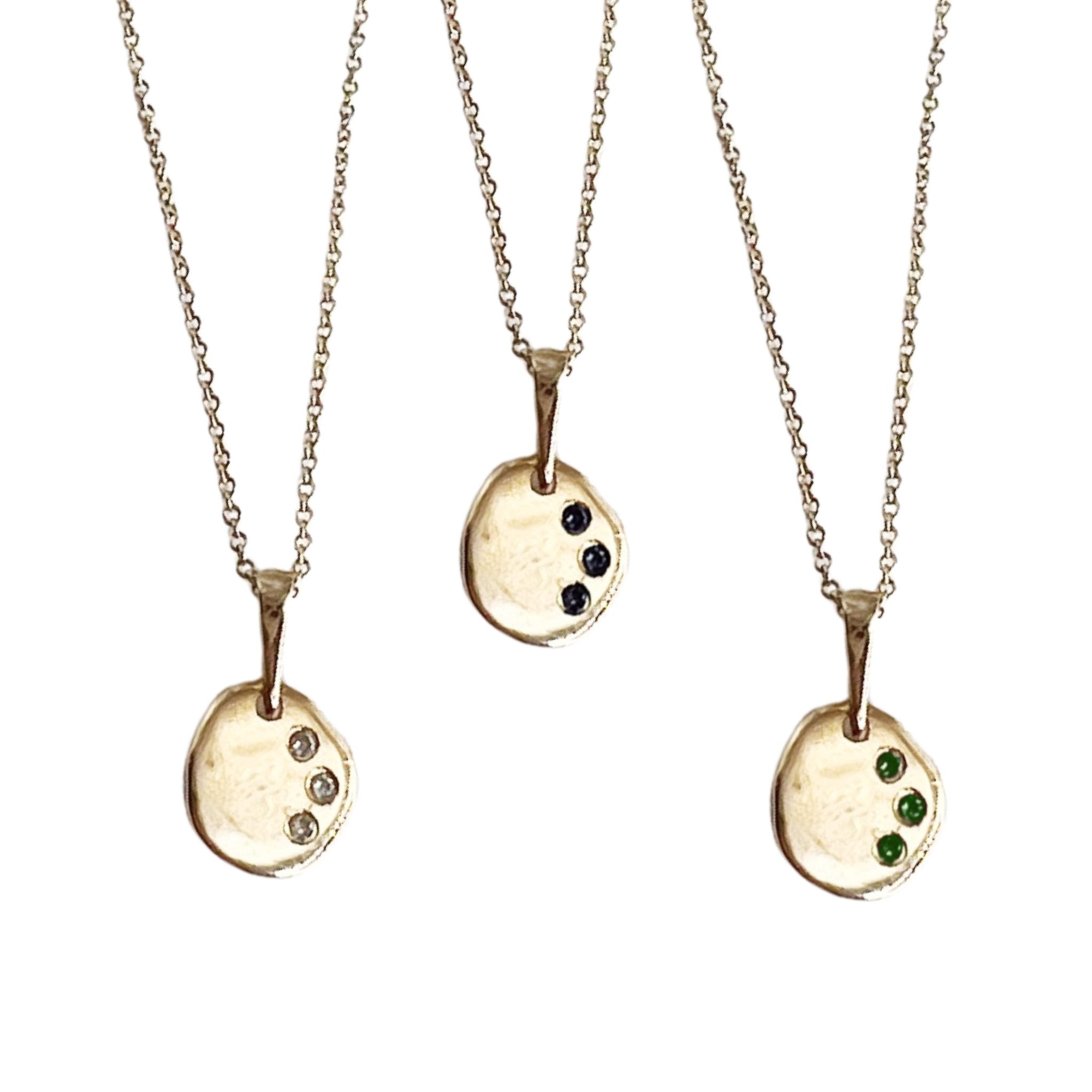 שרשרת אתנה מלאה בקסם עשויה תליון מטבע אמורפי המיוצר בעבודת יד אחד אחד כך שכל אחד שונה,עם שלוש אבנים משובצות לבחירה : יהלומים לבנים, יהלומים שחורים ,אבני אמרלד.